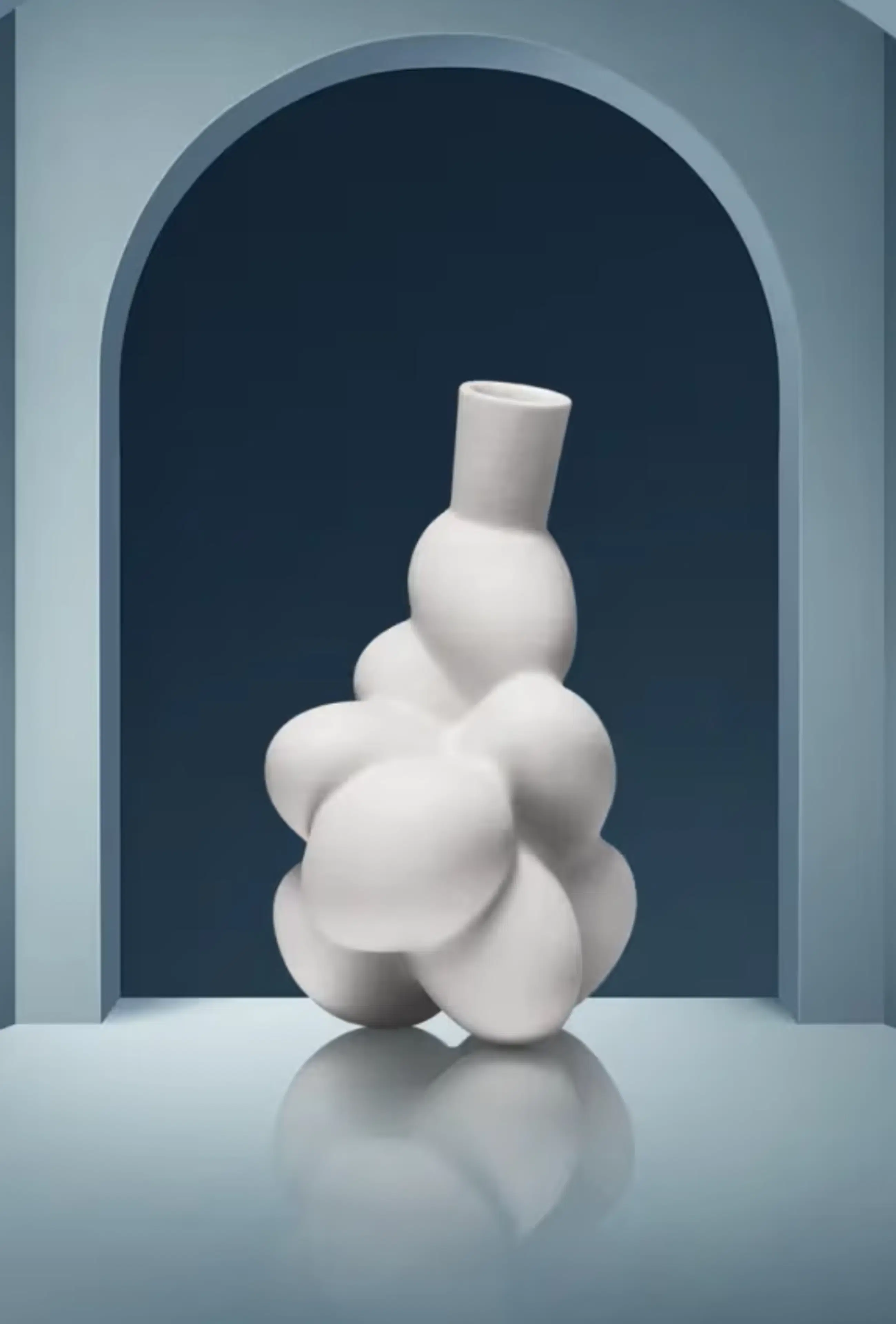 Een prachtig artistiek item. Mooi sieraad voor je interieur alsook functioneel. Van de Nederlandse interieur ontwerper/ designer Marcel Wanders. Een porseleine vaas ontworpen in de zachte, gegolfde vorm van een stapel eieren. Ongeglazuurd porselein aan de buitenkant en aan de binnenkant geglazuurd. Maat M