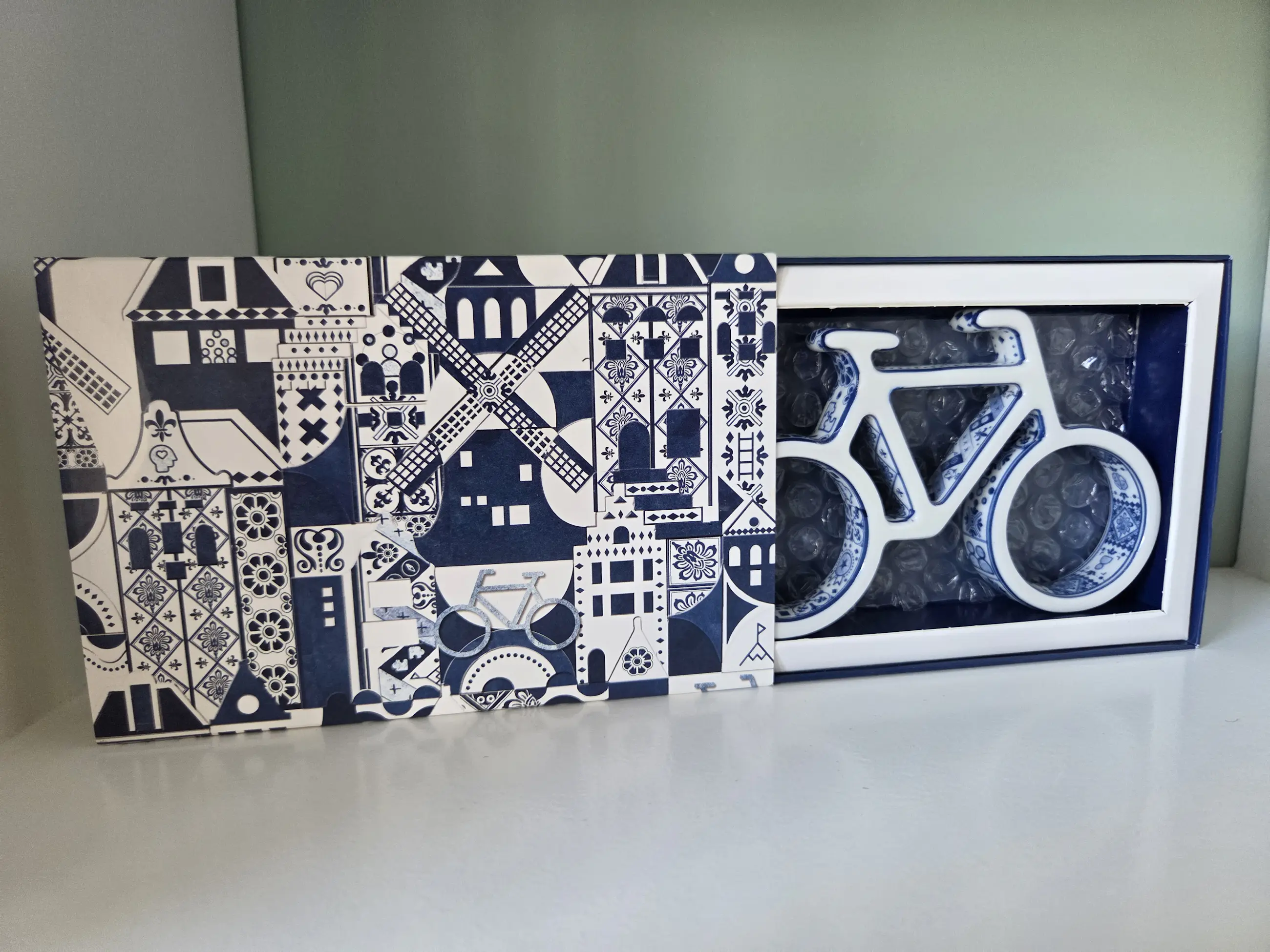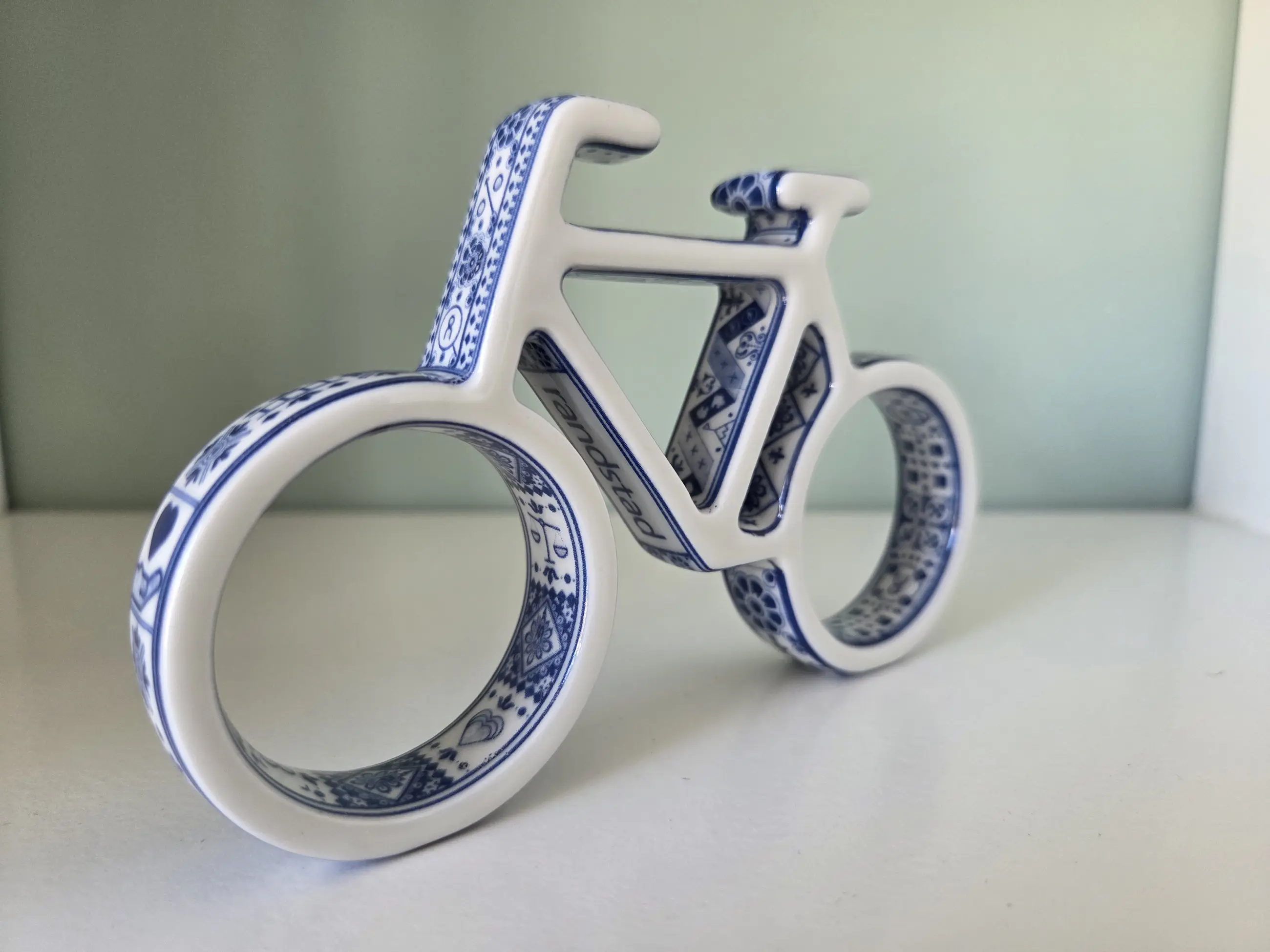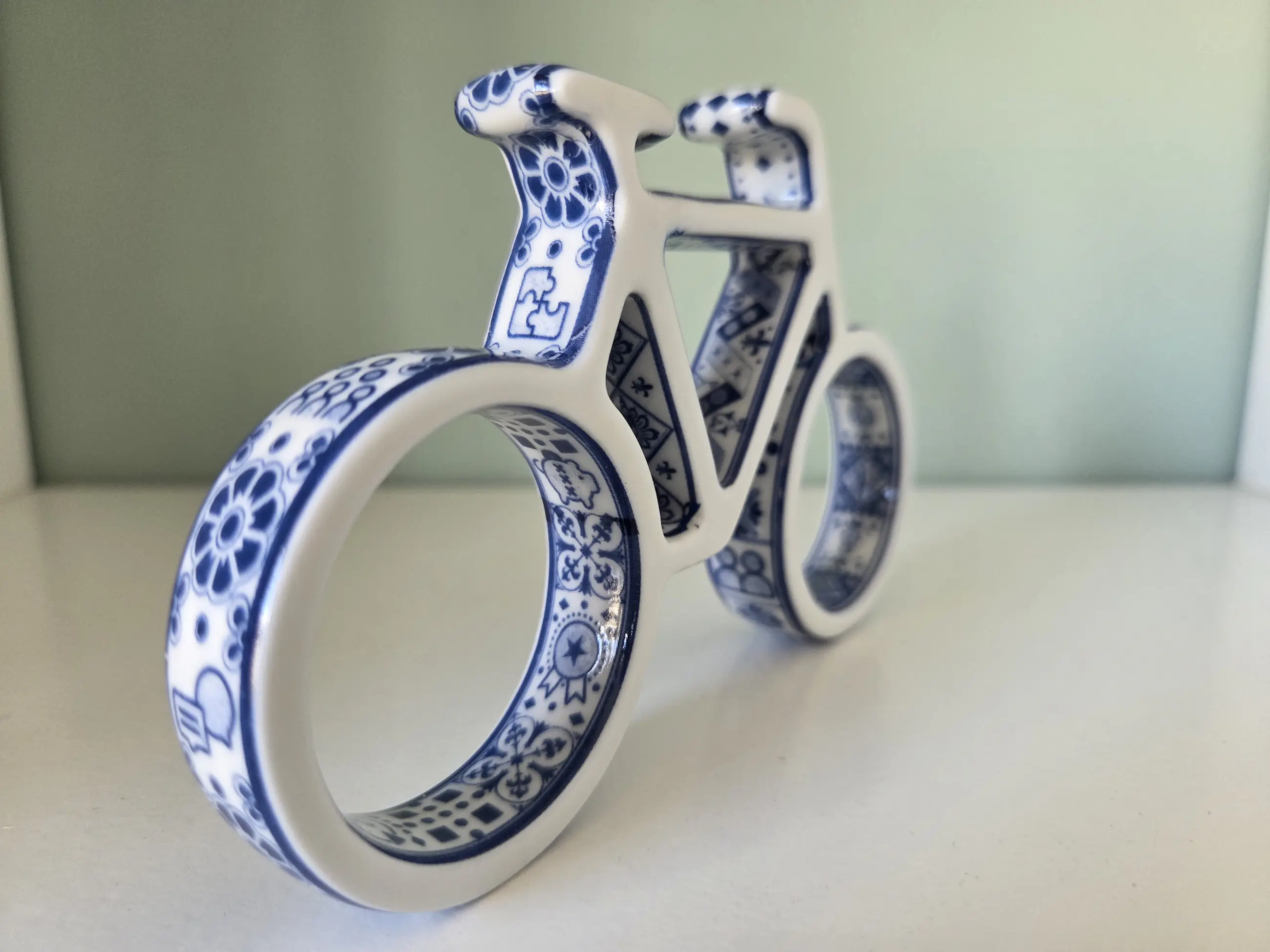 Dit object is een Delfts blauw keramisch fietsje, ontworpen door de bekende Nederlandse ontwerper Marcel Wanders.
