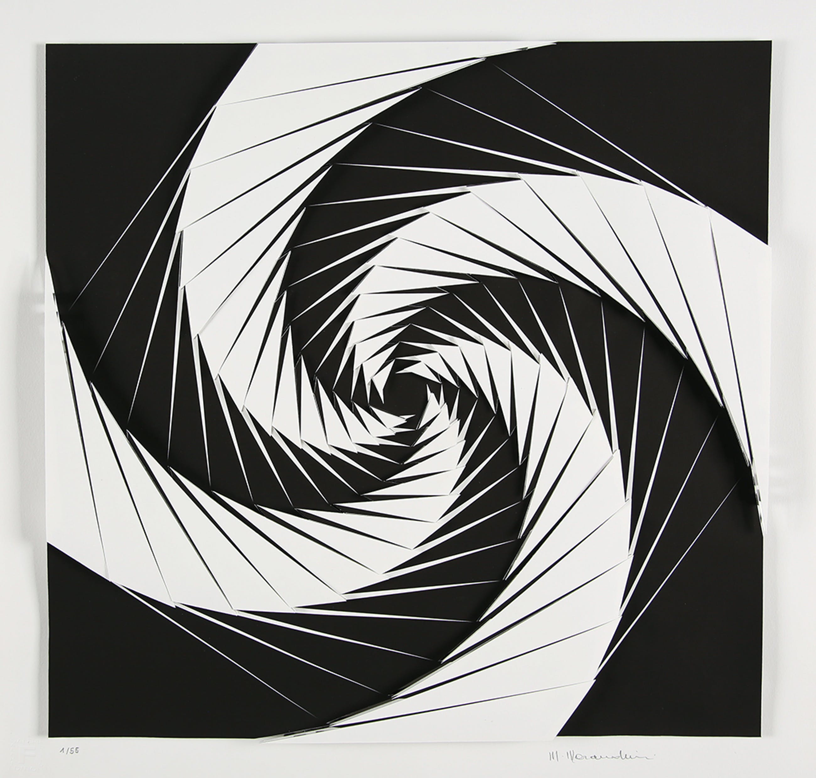3D-constructie gemaakt van katoenpapier en bedrukt boogglaspaneel, geplaatst in een houten frame met de hand gesigneerd, genummerd, gedateerd en getiteld op het etiket op de achterzijde