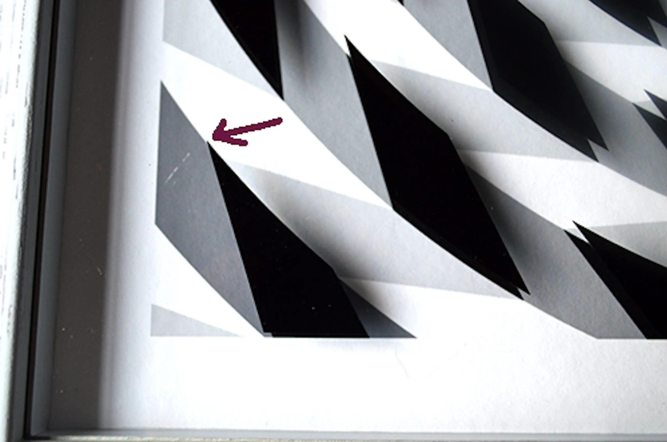 Klein krasje op de print, kijk even naar de foto. Let op: de foto is sterk vergroot. Vanwege dit kleine foutje is de prijs aanzienlijk verlaagd.
