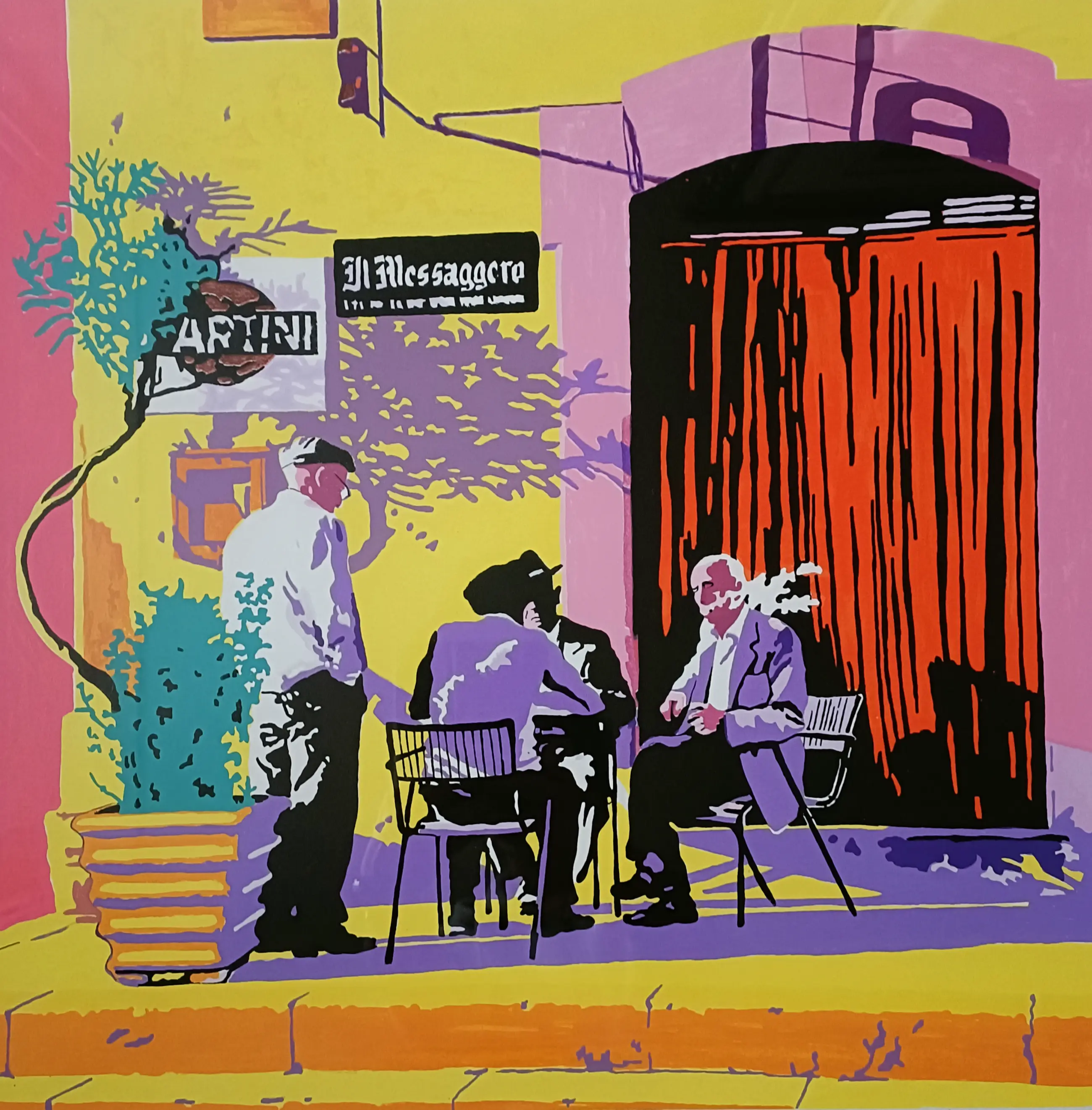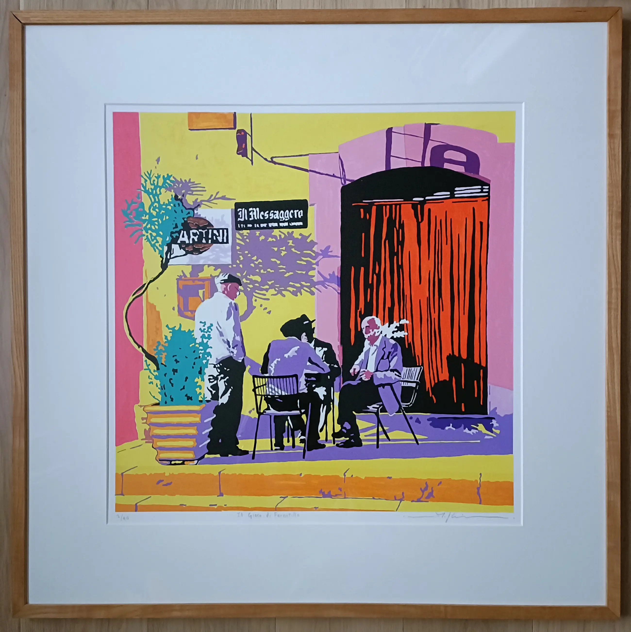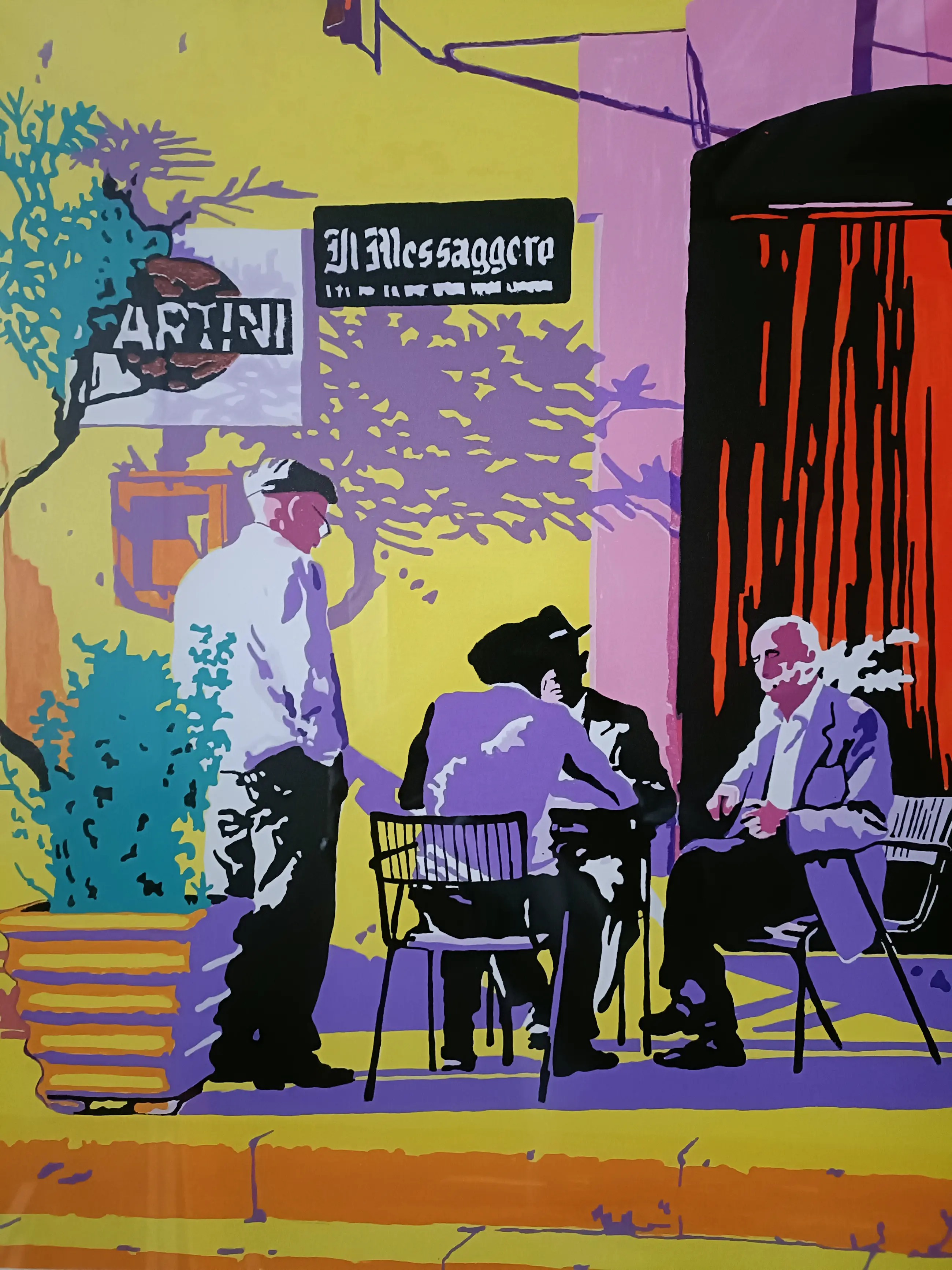 Prachtige, kleurrijke zeefdruk van Marco Kooiman in zijn herkenbare stijl. Italiaans tafereel, mannen doen een spelletje op het terras van een café.
