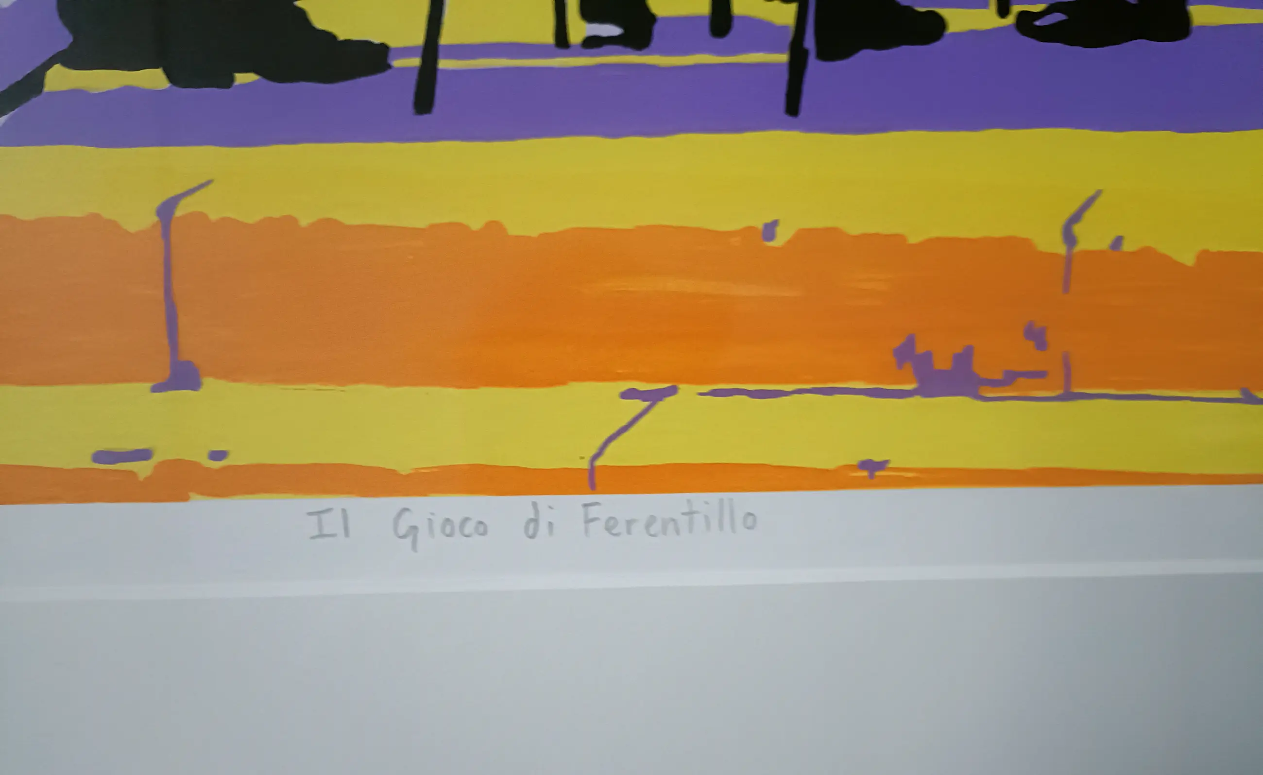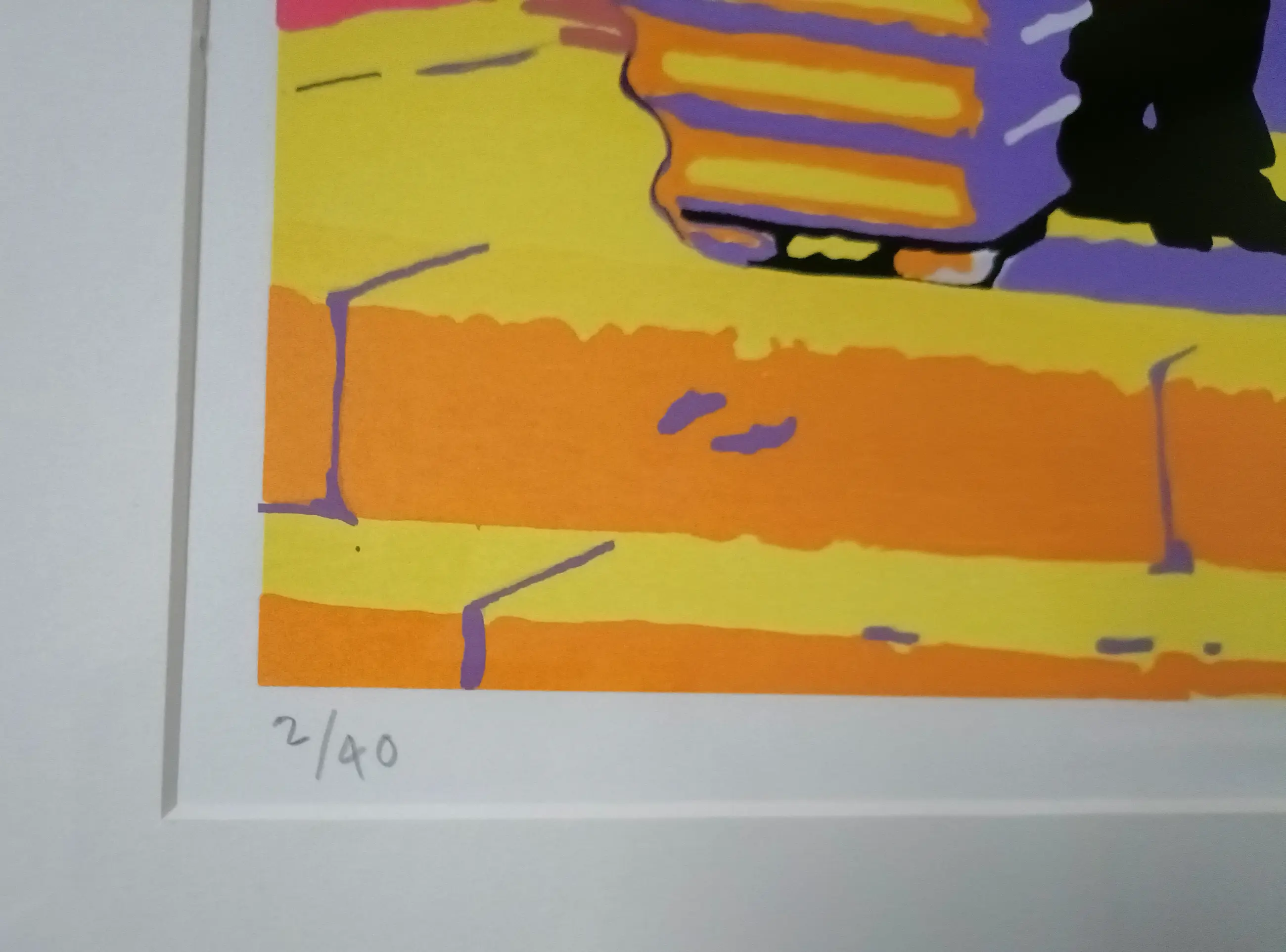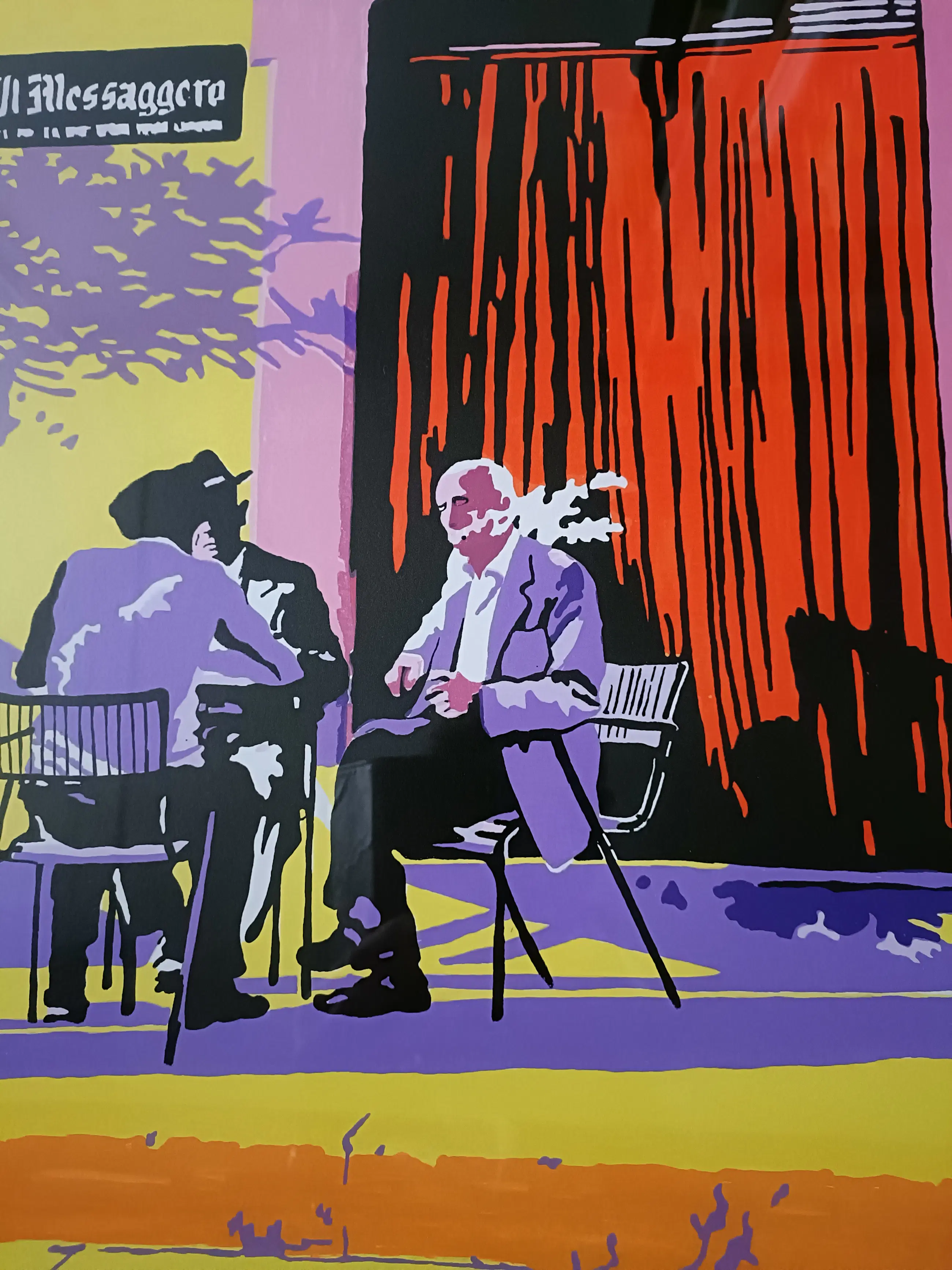 Prachtige, kleurrijke zeefdruk van Marco Kooiman in zijn herkenbare stijl. Italiaans tafereel, mannen doen een spelletje op het terras van een café.