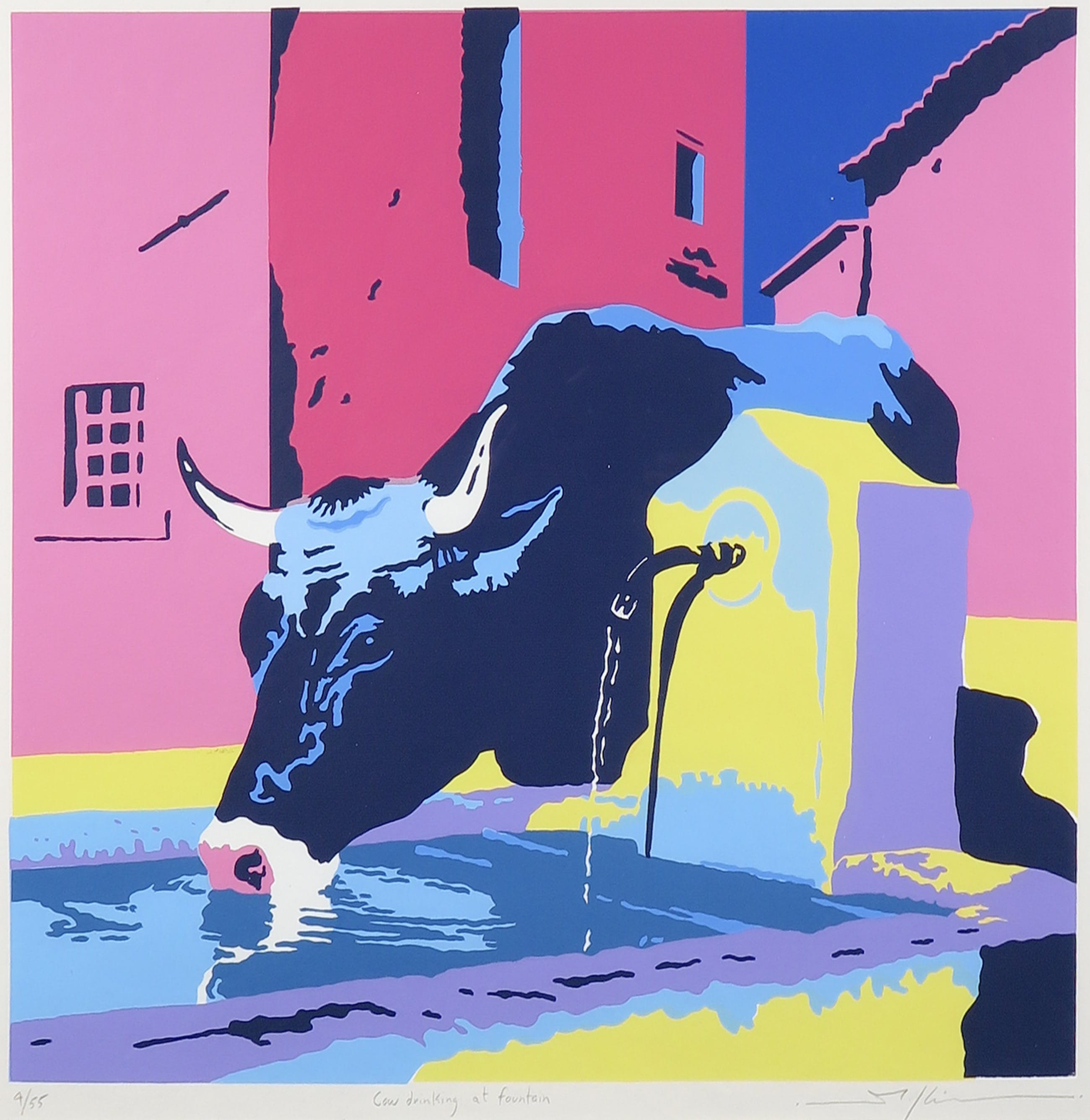 | Enkele plekjes/oneffenheden in de druk (een paar minuscule witte plekjes; in het midden van de koe en in de lucht rechtsboven). | |