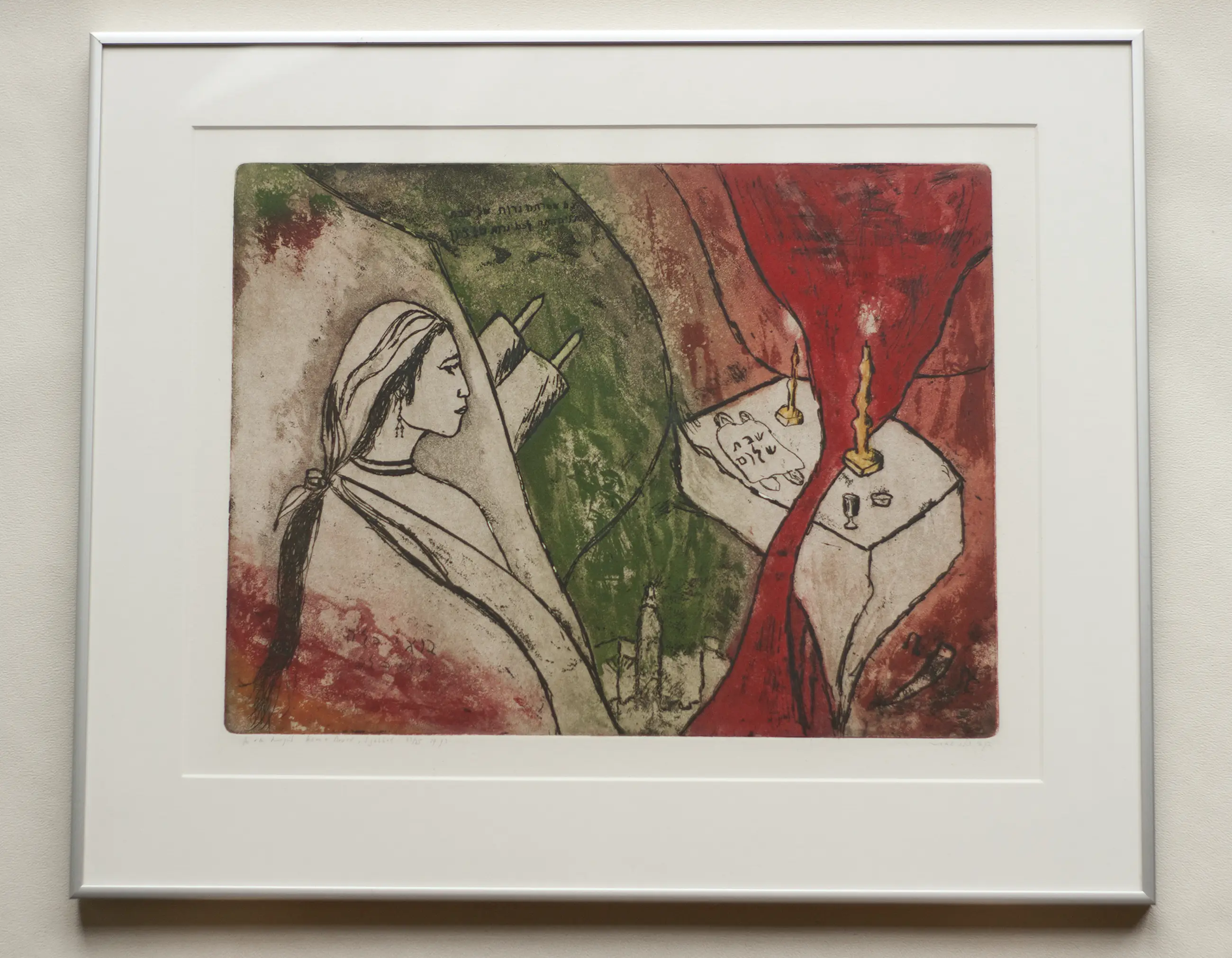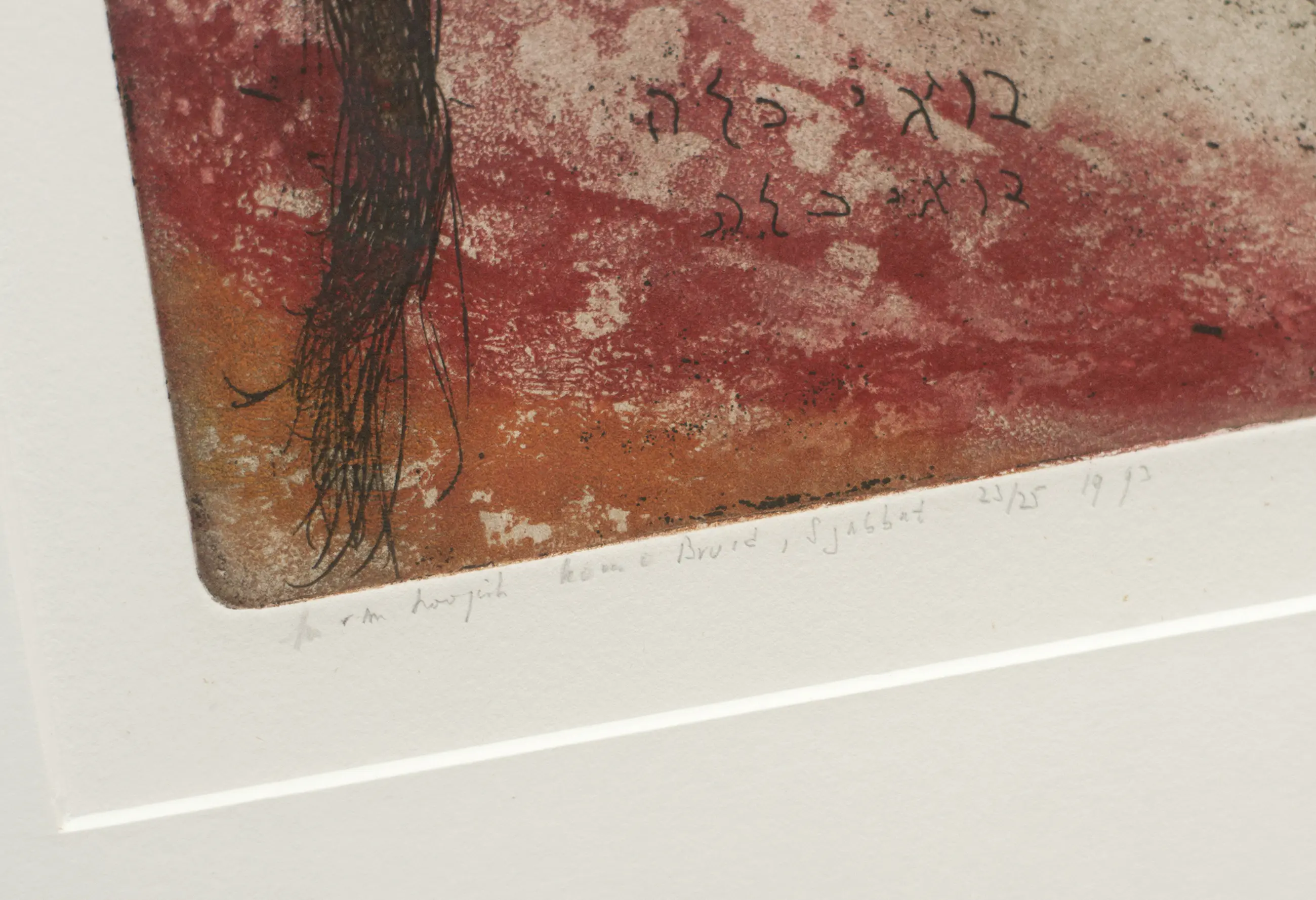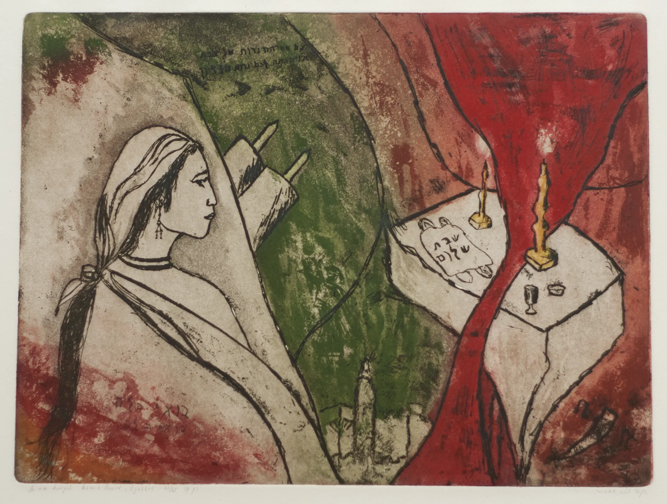 Op de ets links de sabbat als de bruid in het welkomstlied. Rechts is de tafel voor het vrijdagavond-maal afgebeeld, met daarop de twee sabbatskandelaren, de twee sabbatsborden en een beker wijn. Midden onder de Davidstoren in Jeruzalem, symbool voor messiaanse hoop. De sabbatslichten zijn echter door een stroom van bloed van elkaar gescheiden, omdat onze wereld nog altijd door menselijk geweld wordt verscheurd.