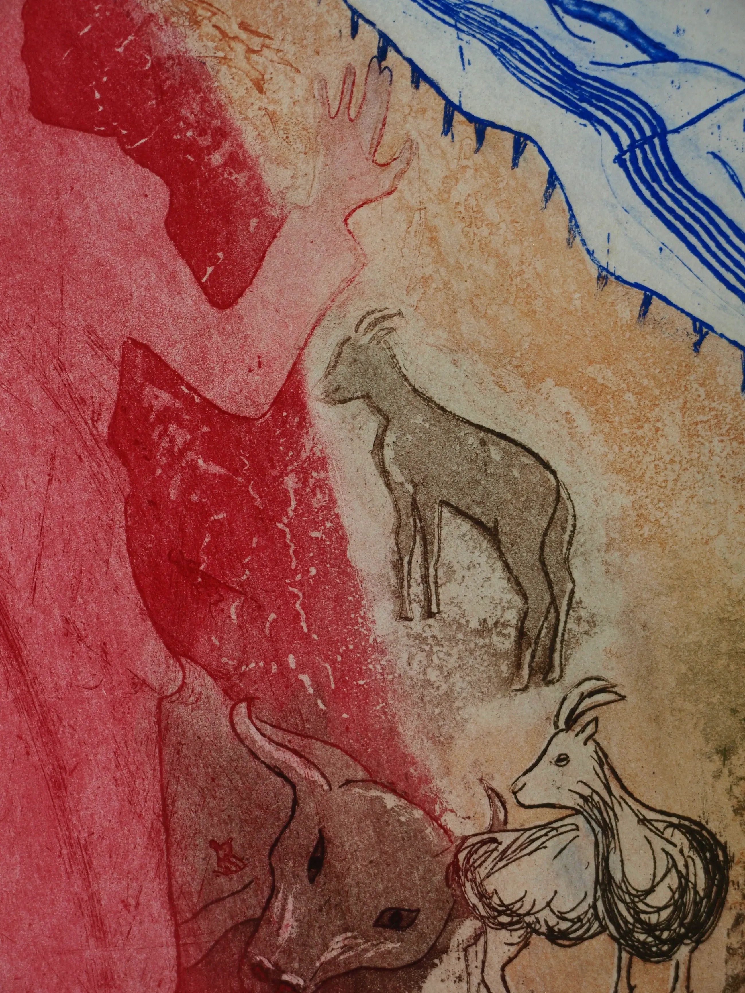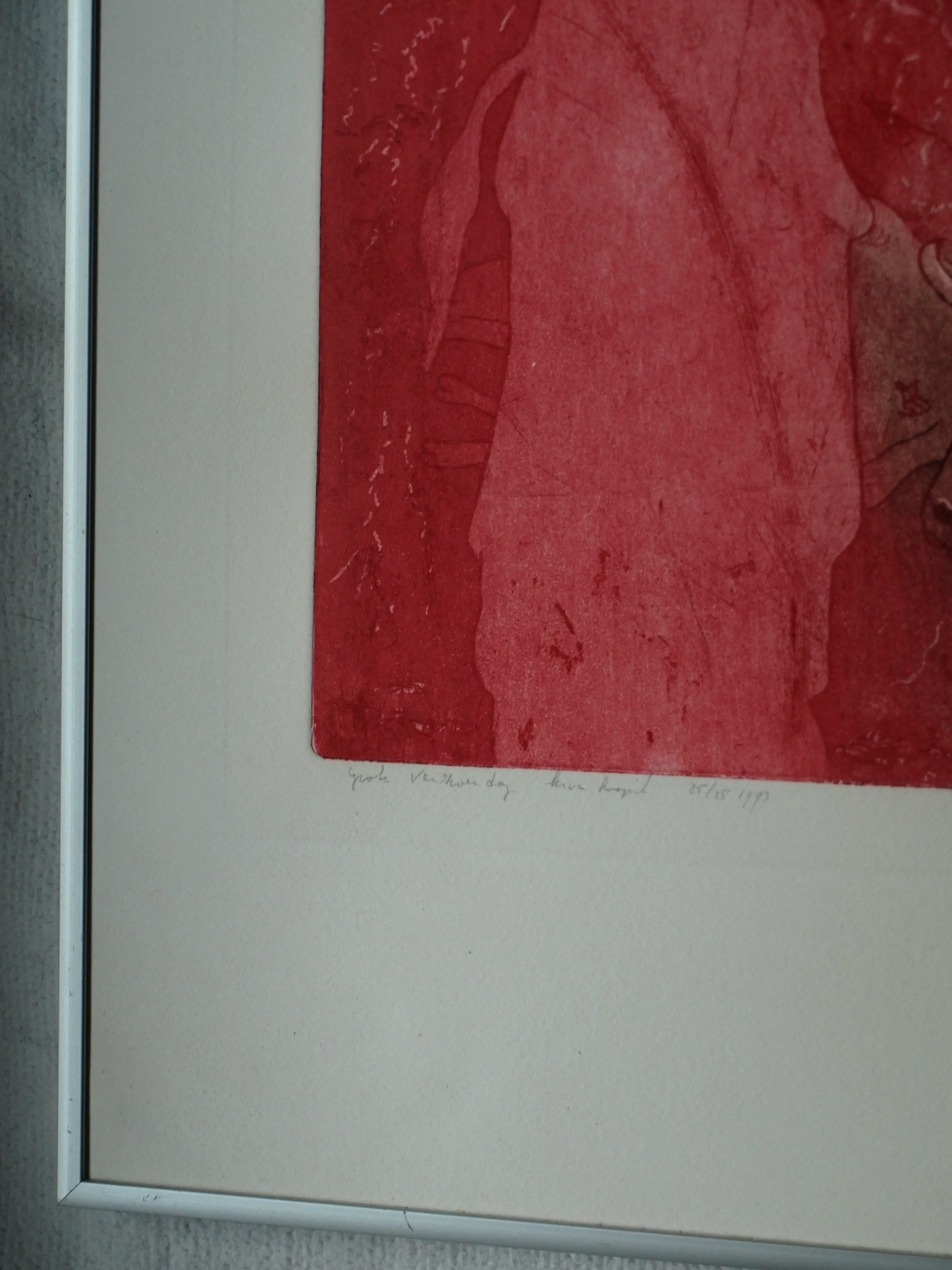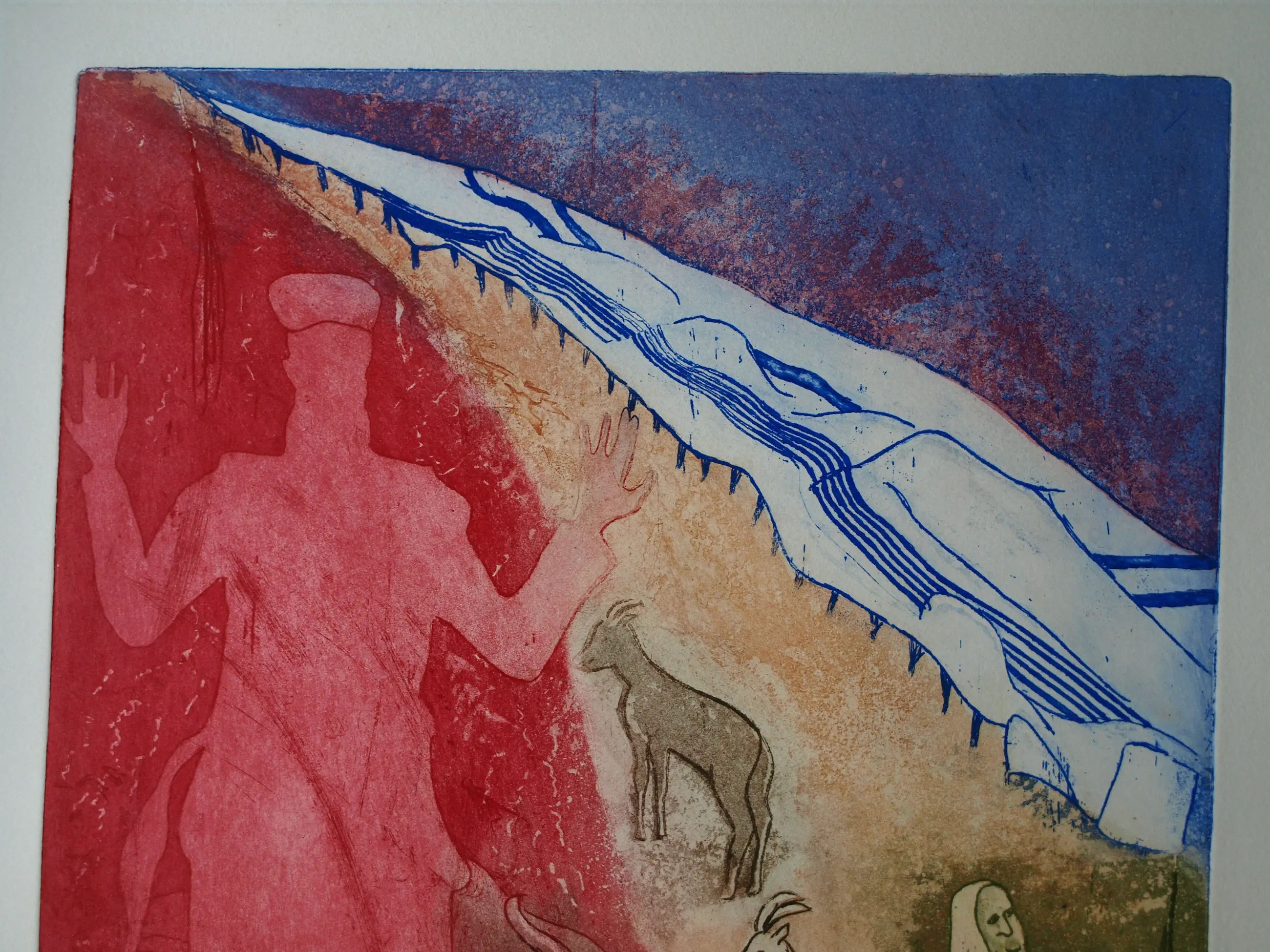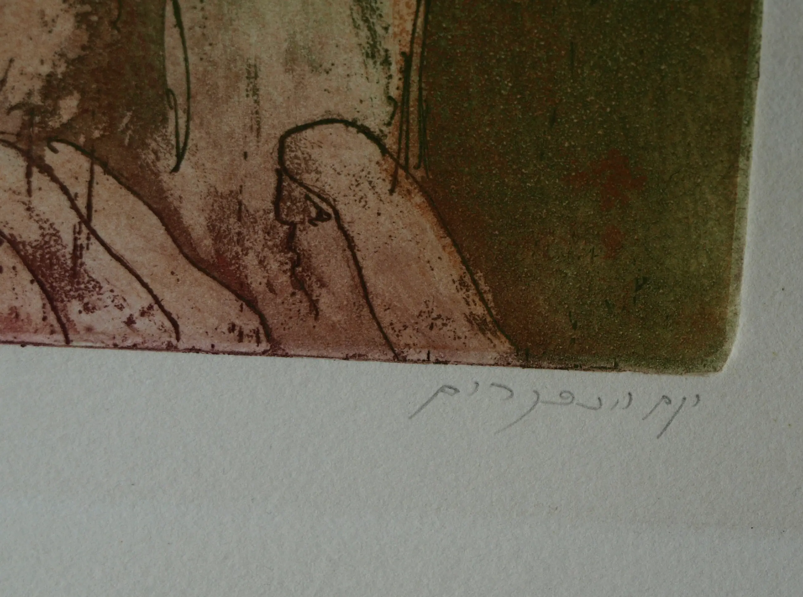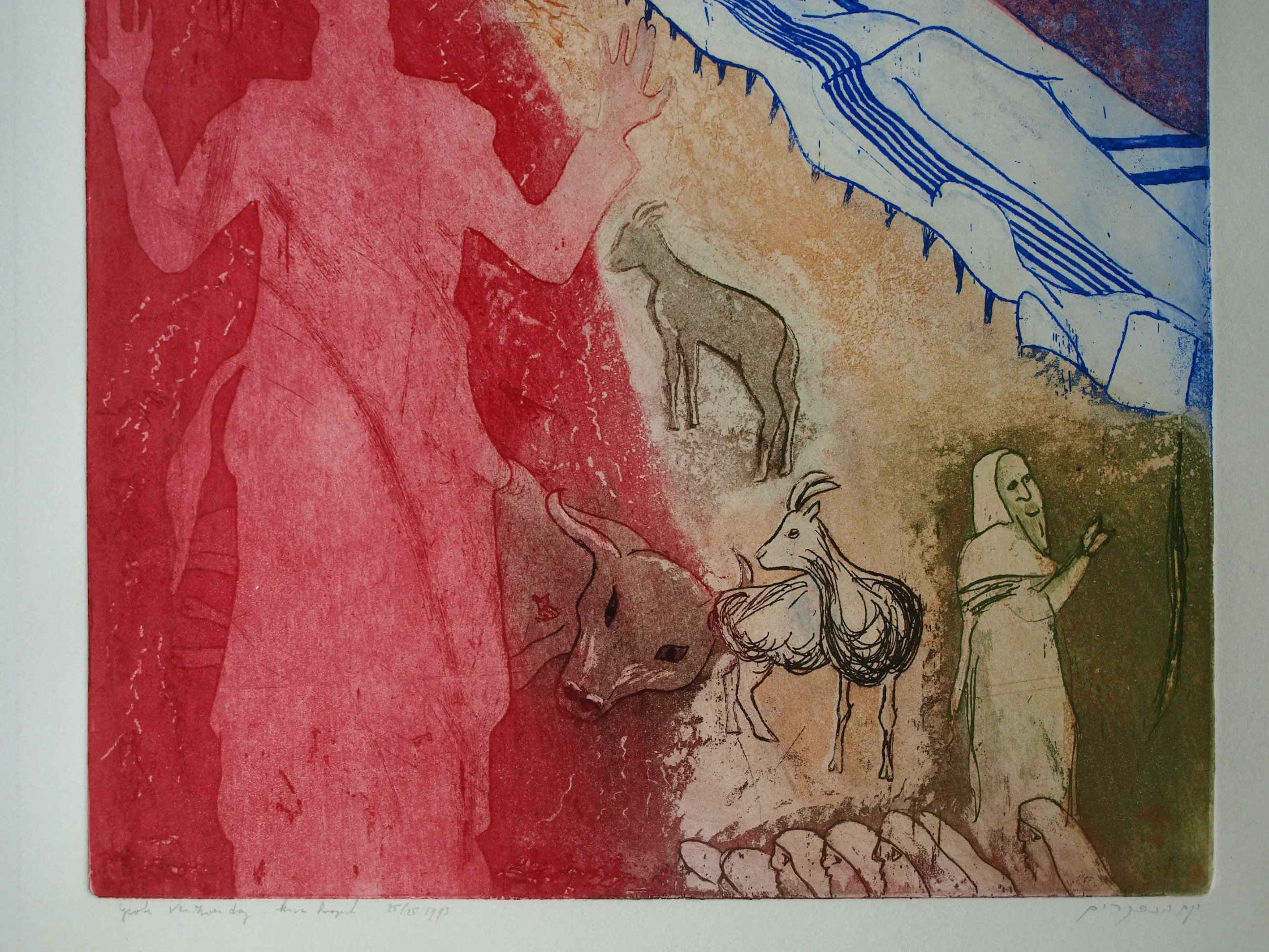 Een ingelijste ets uit 1993 van de Nederlandse theoloog, judaïcus en grafisch kunstenaar Marcus van Loopik (1950), getiteld “Grote Verzoendag”. “De ets toont onder meer de hogepriester, die met uitgestrekte armen en gespreide vingers de zegen uitspreekt over het verzamelde volk. De uitgespreide gebedsmantel herinnert aan de viering van Grote Verzoendag in de synagoge, wanneer de mannen hun ‘talliet’ (gebedsmantel) dragen. Wie een gebedsmantel draagt voelt als het ware Gods ontfermende hand op zijn schouders. Als een mantel is Gods barmhartigheid over de gemeenschap uitgespreid. Verder zijn de stier en de twee geitenbokken afgebeeld. De donkerste stelt de zogeheten ‘zondebok’ voor”. Deze ets is, samen met nog 27 etsen, gebruikt als illustratie in de Lezenaarbijbel van de Katholieke Bijbelstichting ('s - Hertogenbosch 1998). -Gesigneerd, gedateerd, genummerd en getiteld linksonder met potlood. Nr. 25 van een oplage van 25 exemplaren. -Ingelijst in een aluminium lijst, zonder glasplaat. -Afmetingen: Lijst, 55,5 x 45,5 x 2 cm. Beeld / ets, 35 x 32,5 cm. -Herkomst: Uit de nalatenschap van Sheila Gogol (1942-2022). -Conditie: In zeer goede staat. Ingelijst zonder glasplaat. Zie ook de foto’s. Kan zo aan de muur.