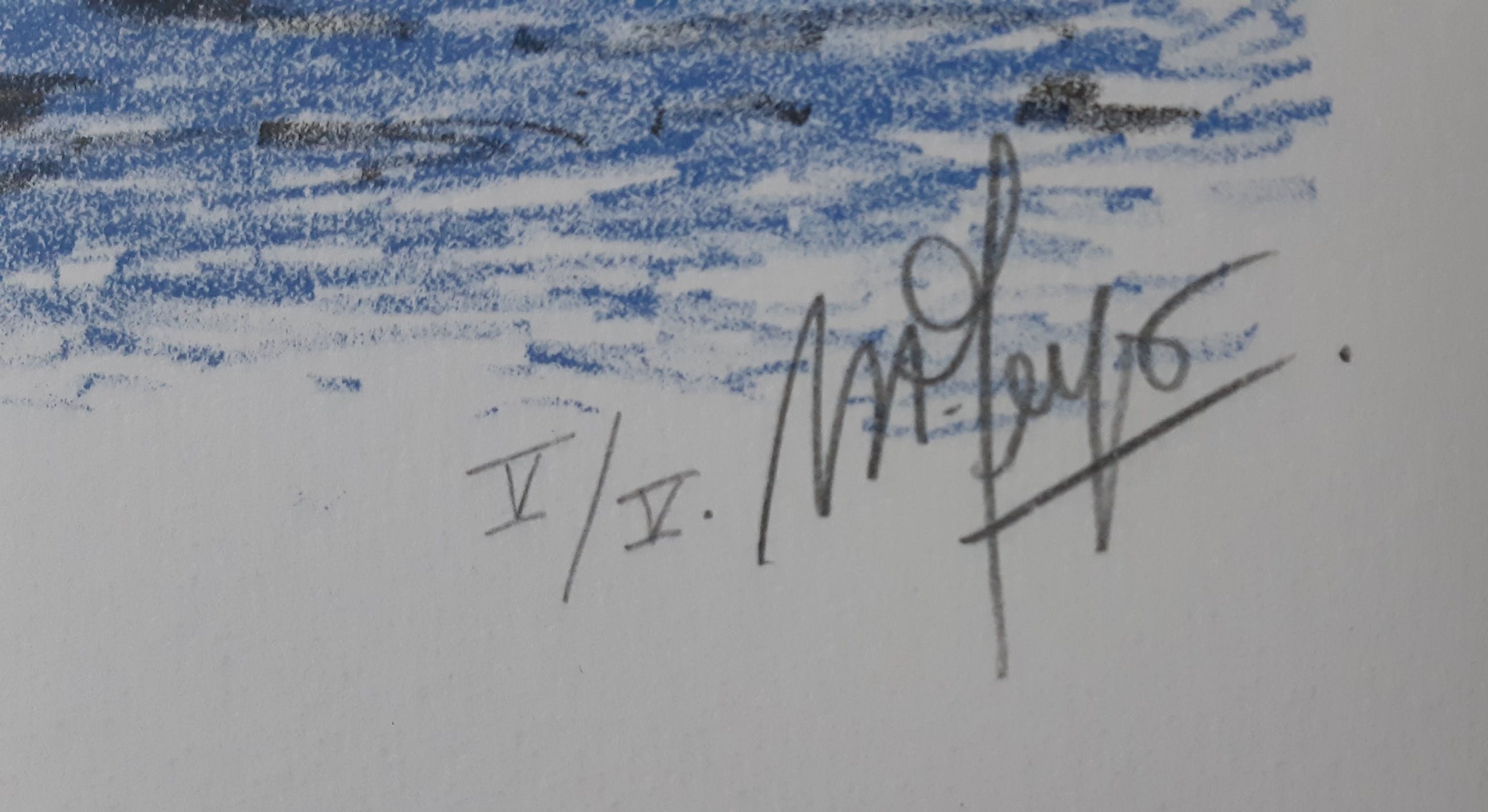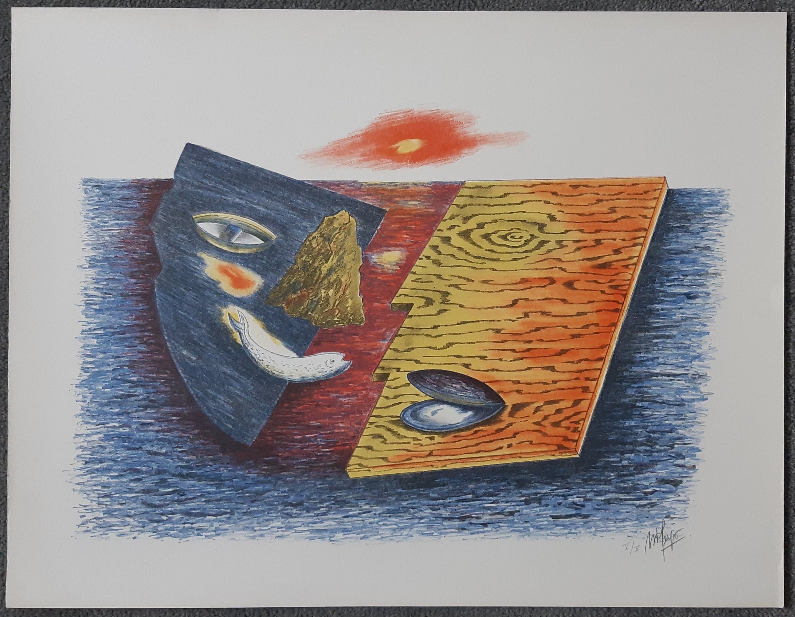 Van deze zeefdruk is een onbekende oplage uitgebracht in de reeks "Het dagelijks leven", ter gelegenheid van het 100-jarig jubileum van AH, onder de titel Zeegezicht (ontmoeting bij ondergaande zon). Deze exemplaren dragen een blindstempel AH87. De zeefdruk die ik aanbied, is buiten deze reeks in een kleine oplage van 5 stuks uitgebracht. Dit is nummer 5 van deze oplage. Er is geen blindstempel. Het werk verkeert in uitstekende conditie. Het kan zonder kosten worden opgehaald in Breda of op kosten van de koper aangetekend worden verzonden in een stevige koker.