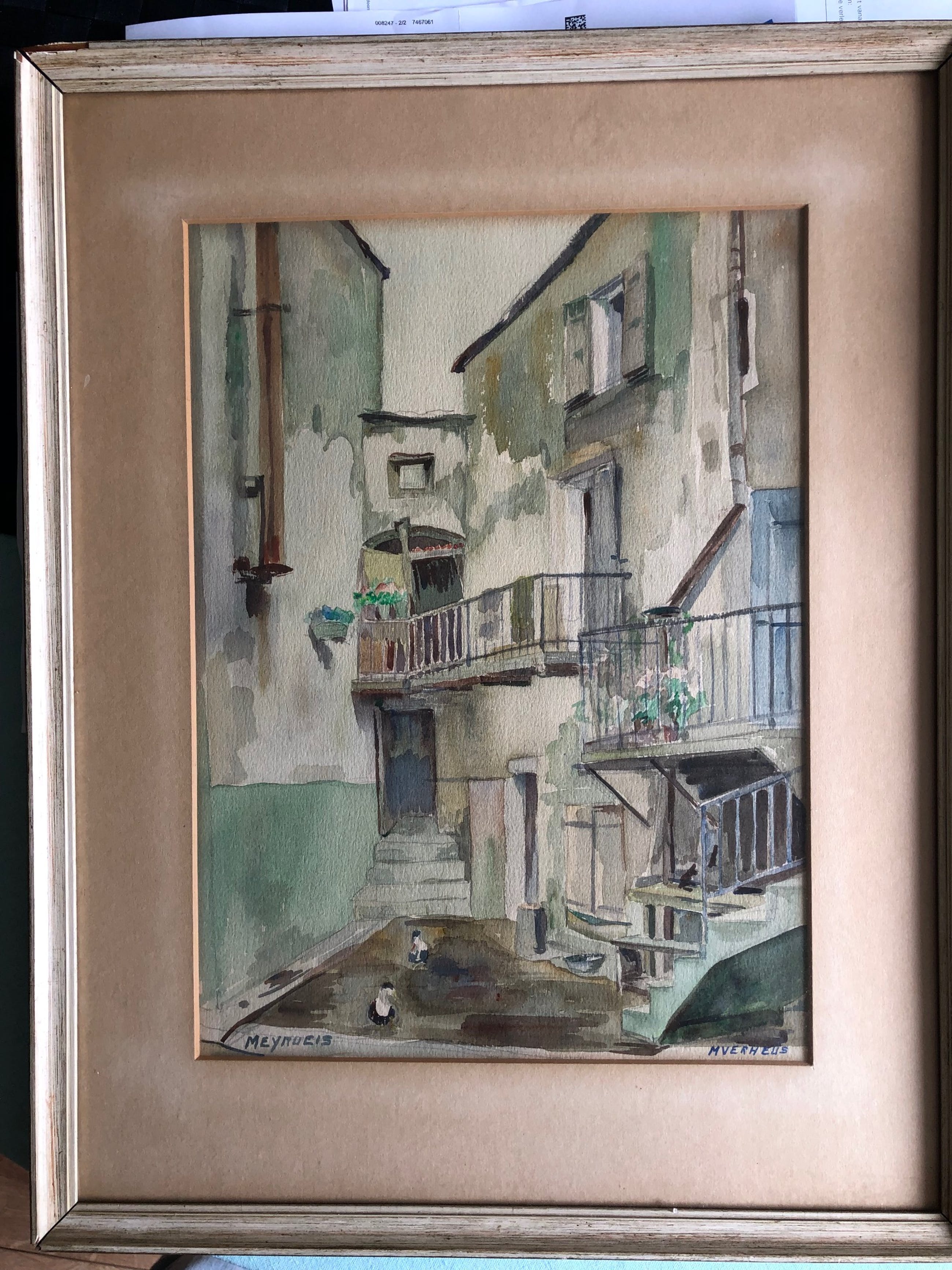 Aquarel van de bekende Haarlemse kunstenares Margaretha Verheus. Dit aquarel verbeeldt een mooi, pitoresque straatje in het Franse dorpje MEYRUEIS