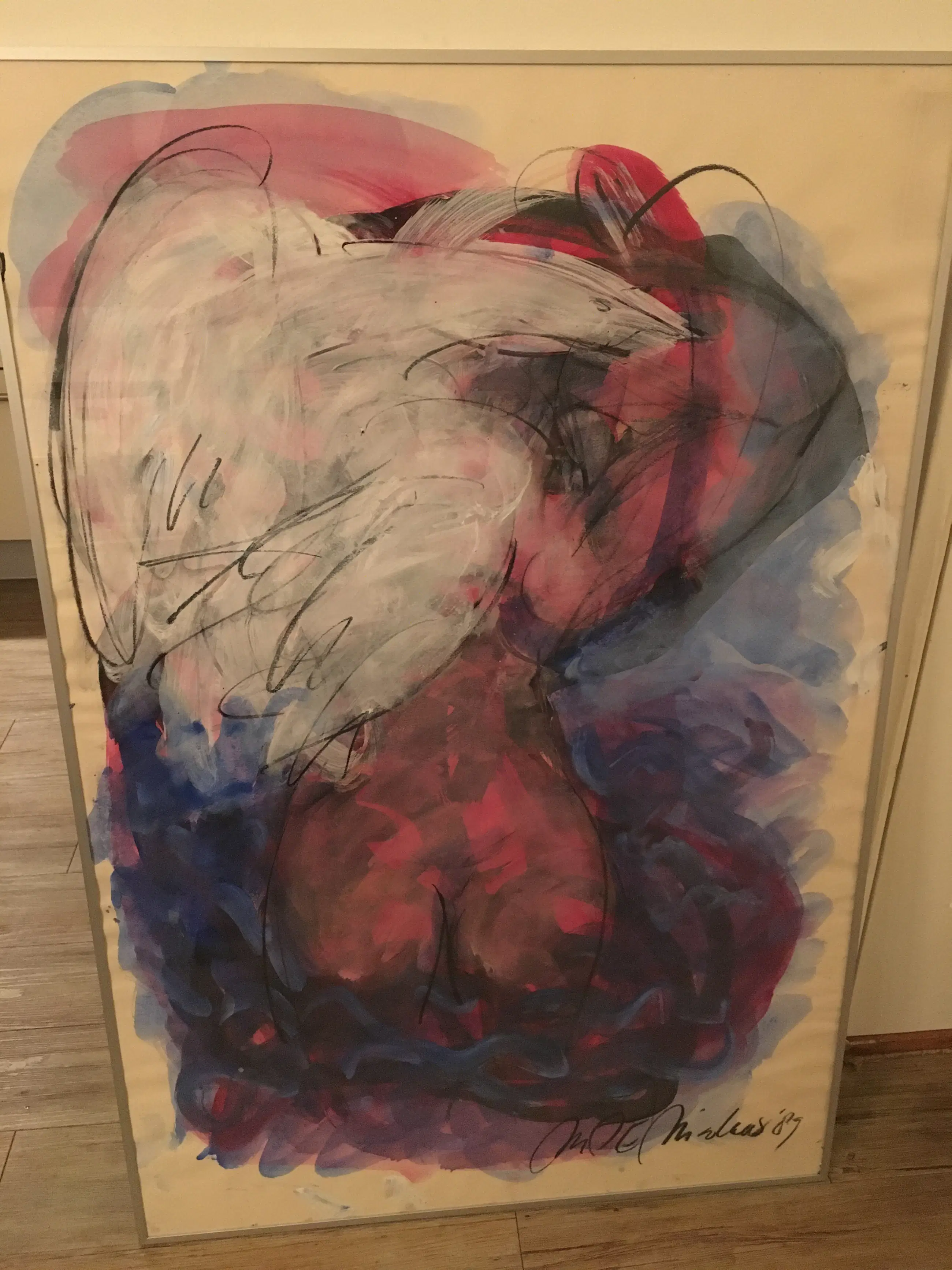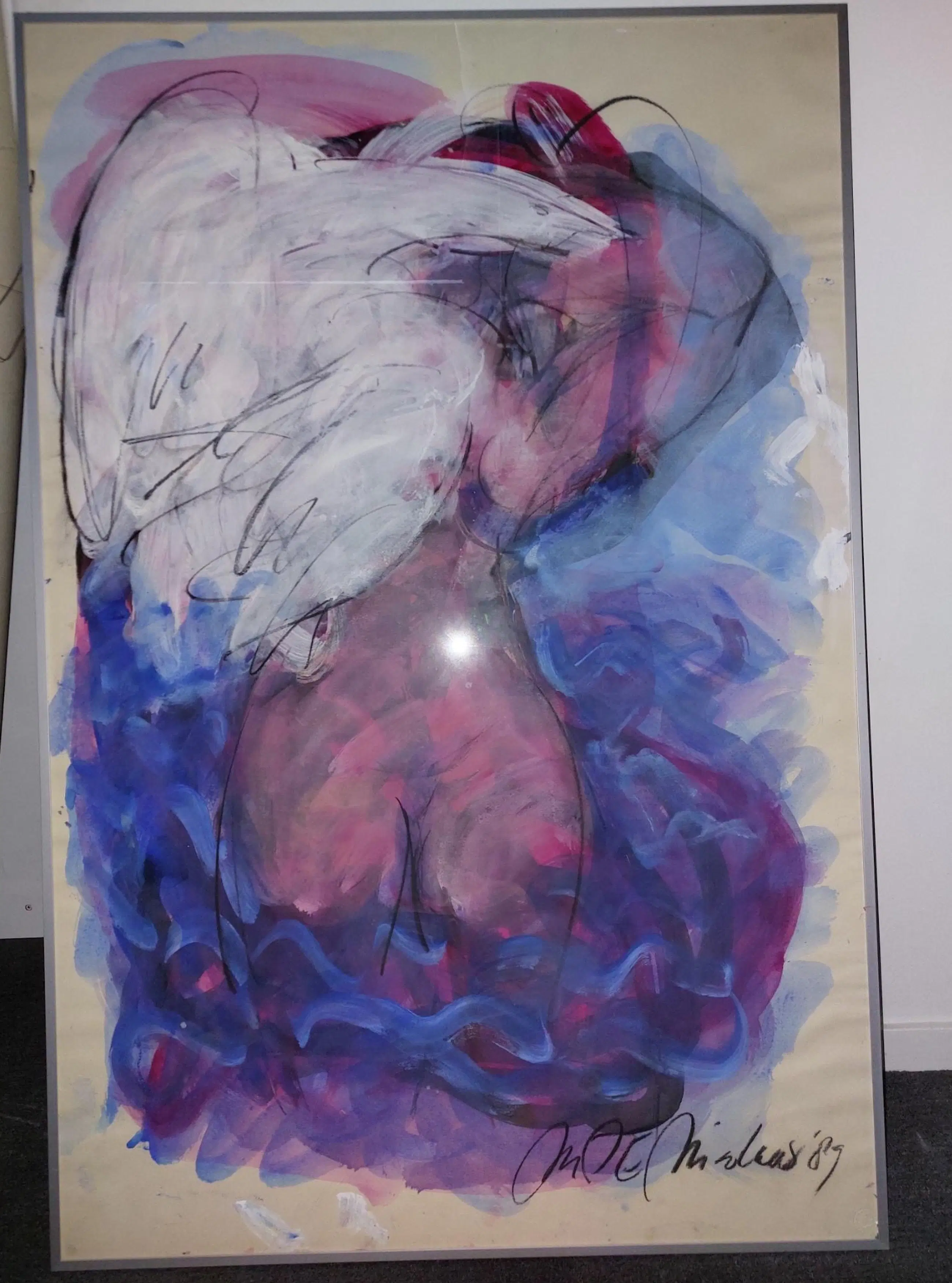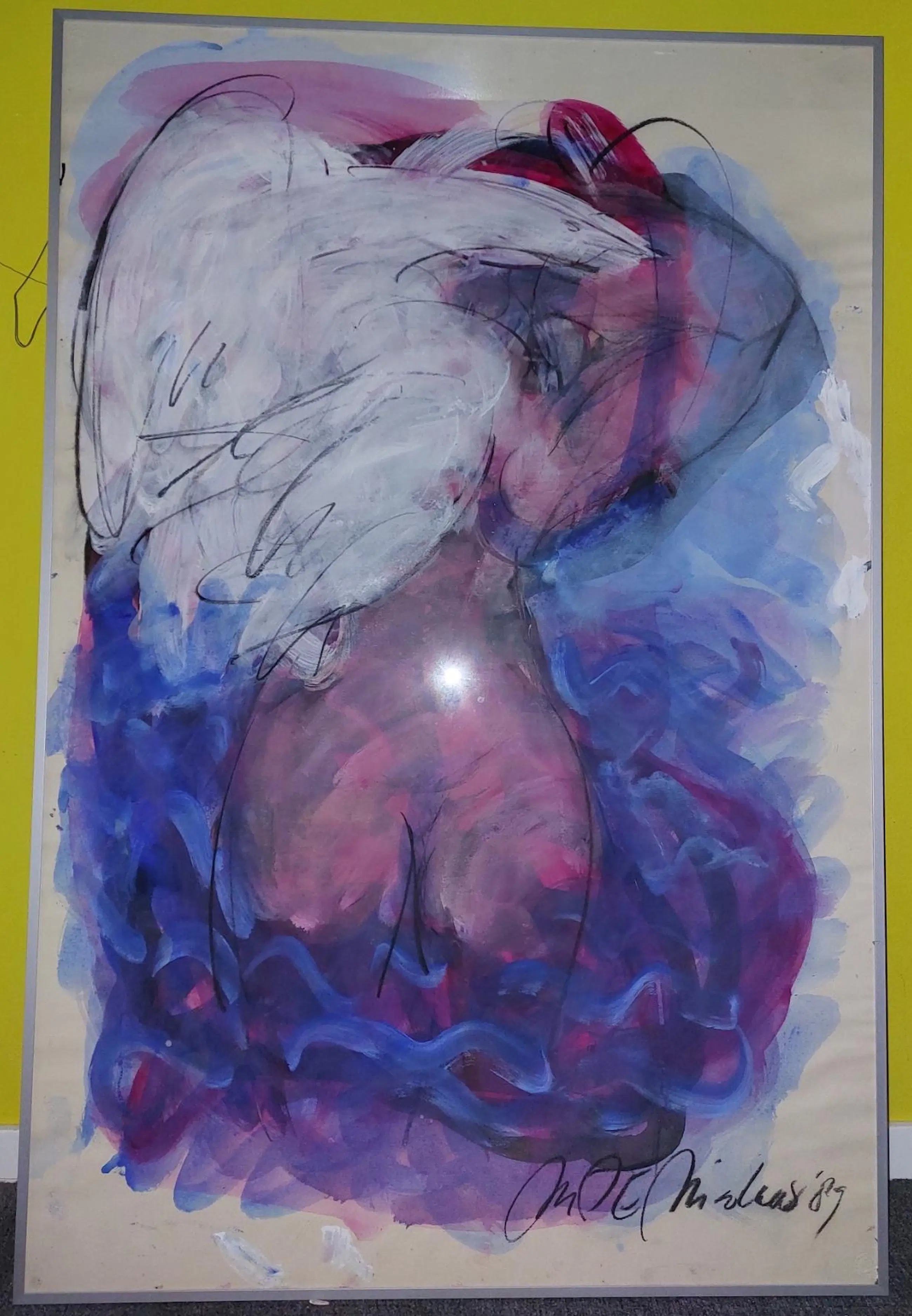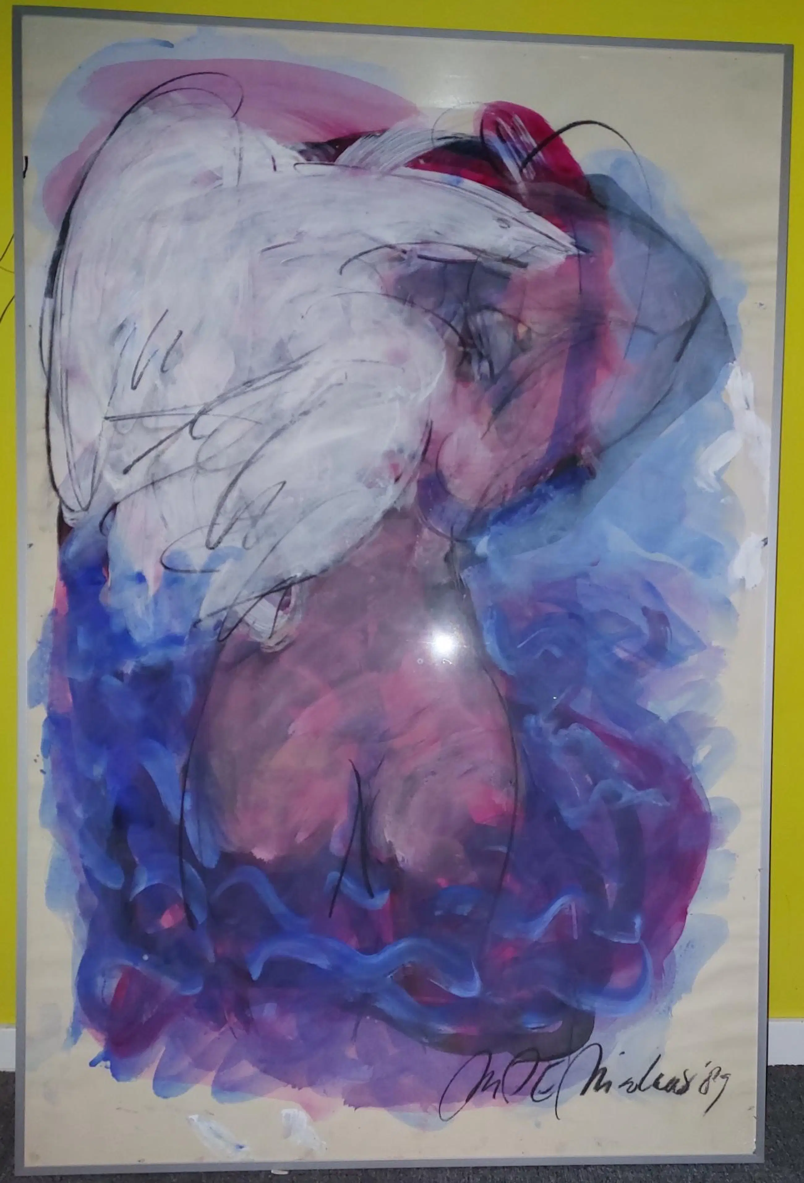 Expressionistisch naakt van vrouw met vogel door schilderes en danseres Margarita Nicolaas (1947). Ze staat vooral bekend om haar prachtige en expressieve werken van vrouwelijk naakt, vaak gecombineerd met dans en danspartners.