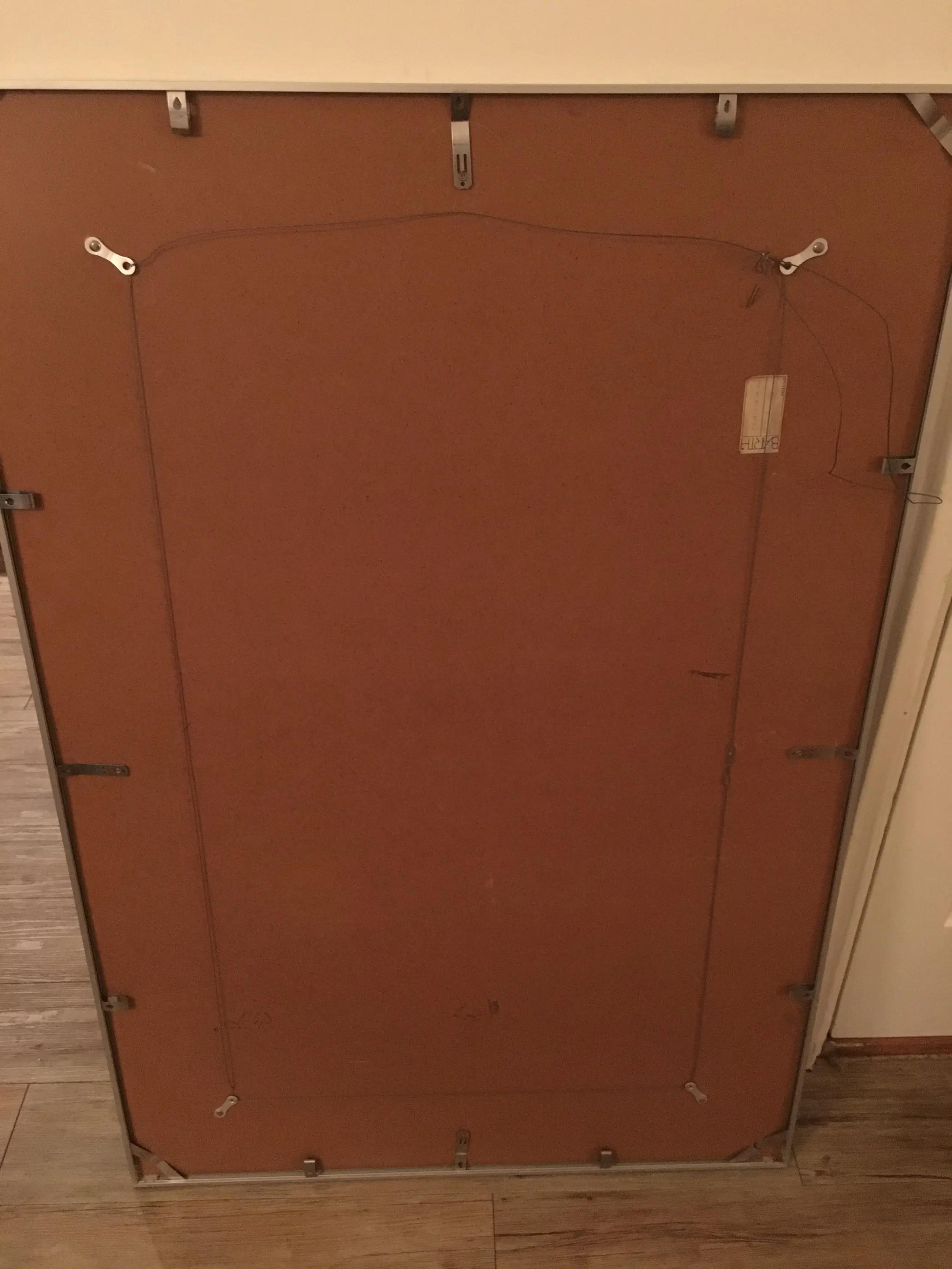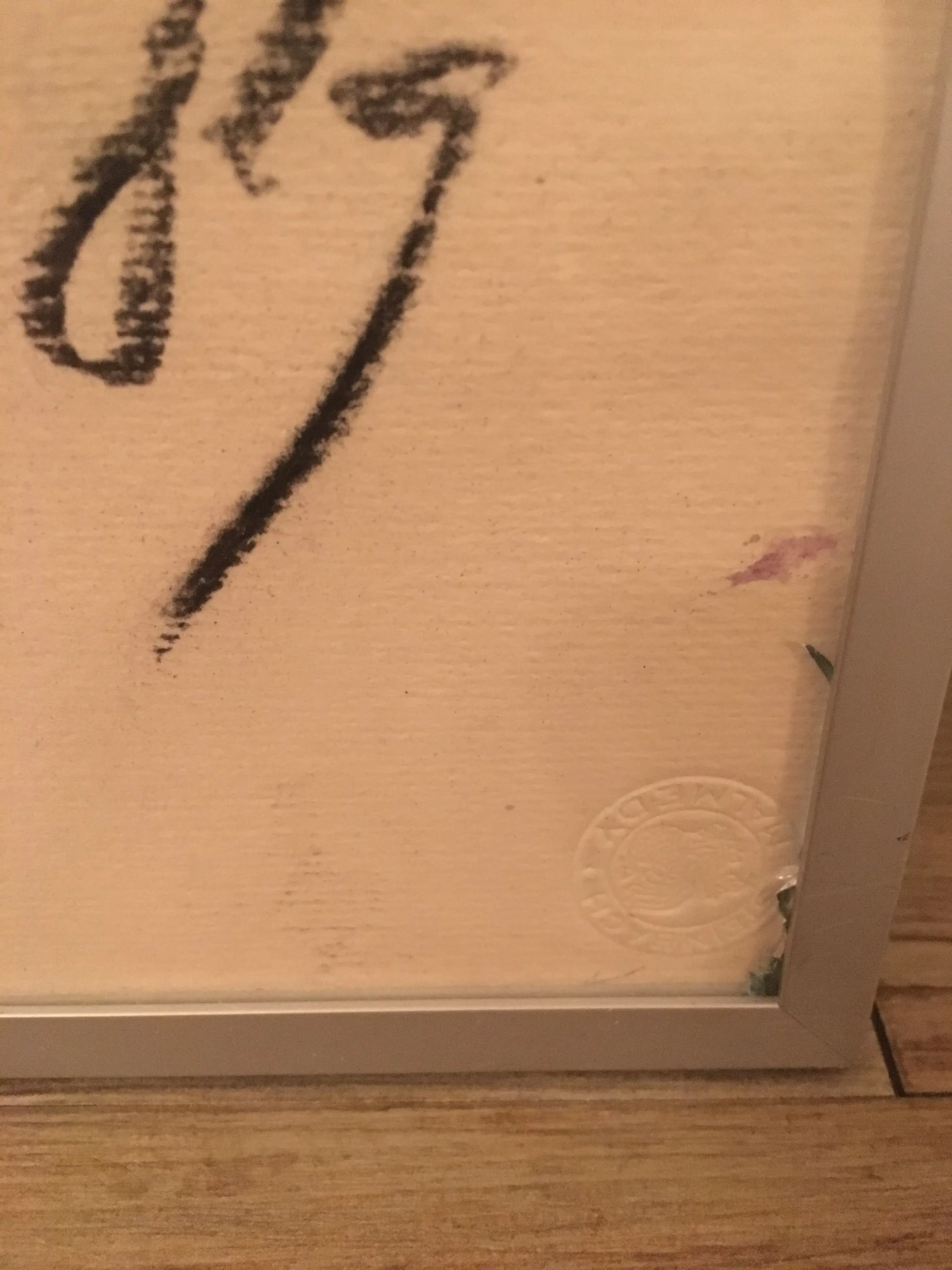 De lijst heeft een klein breukje rechtsonder. En het papier een paar rimpels aan de rechterkant. Zie foto's voor details, met als toelichting dat e.e.a. minder zichtbaar is bij het aanschouwen van het schilderij dan op de close-up foto's.