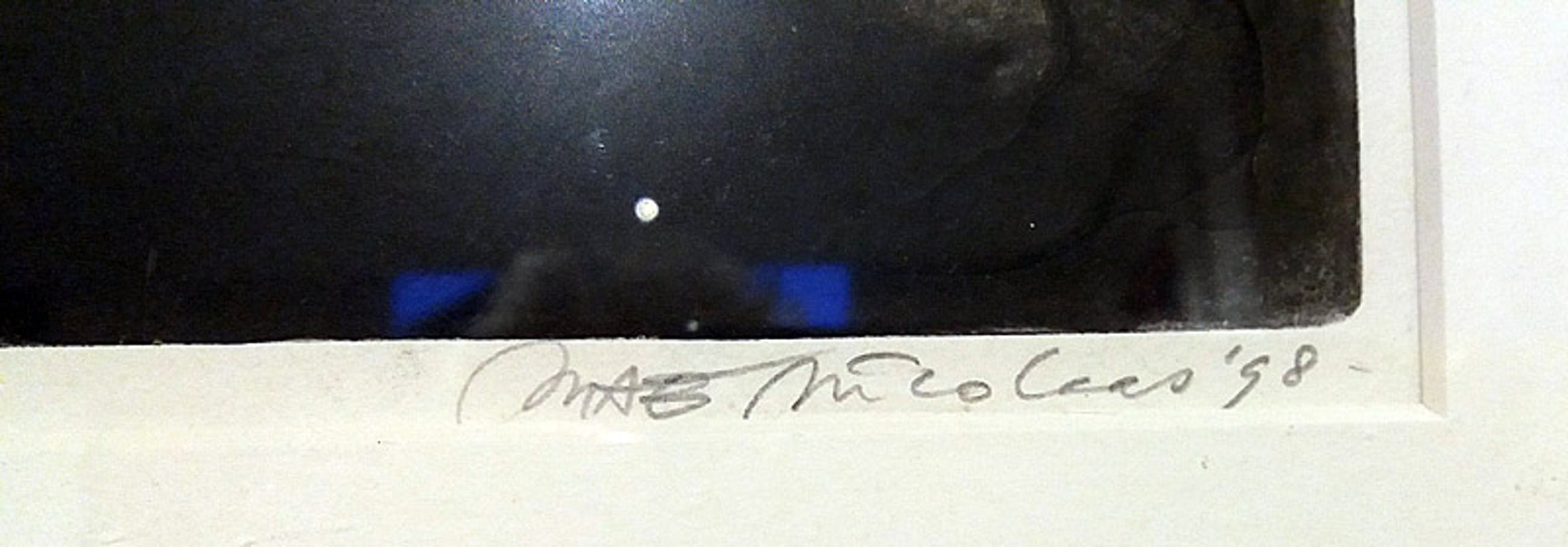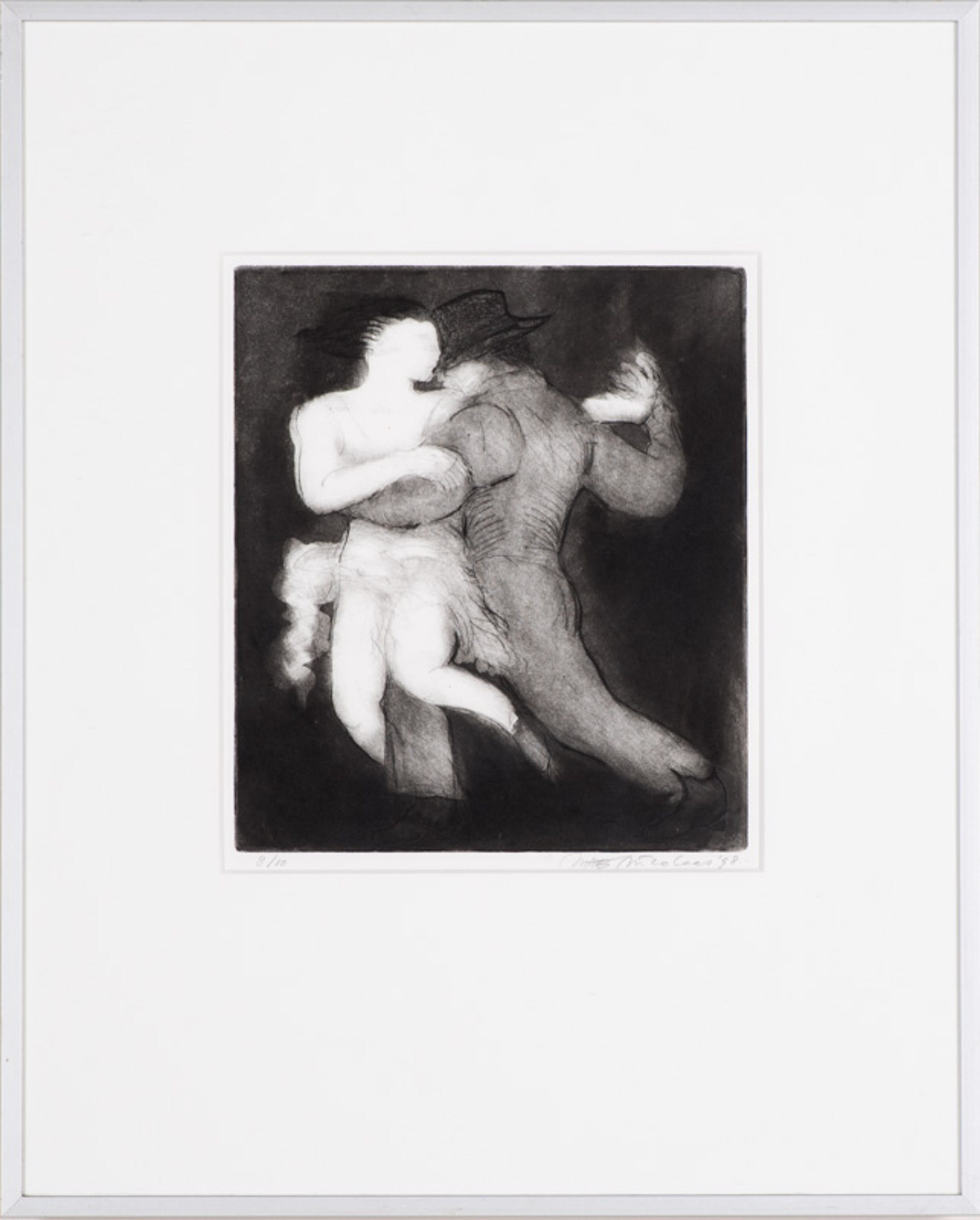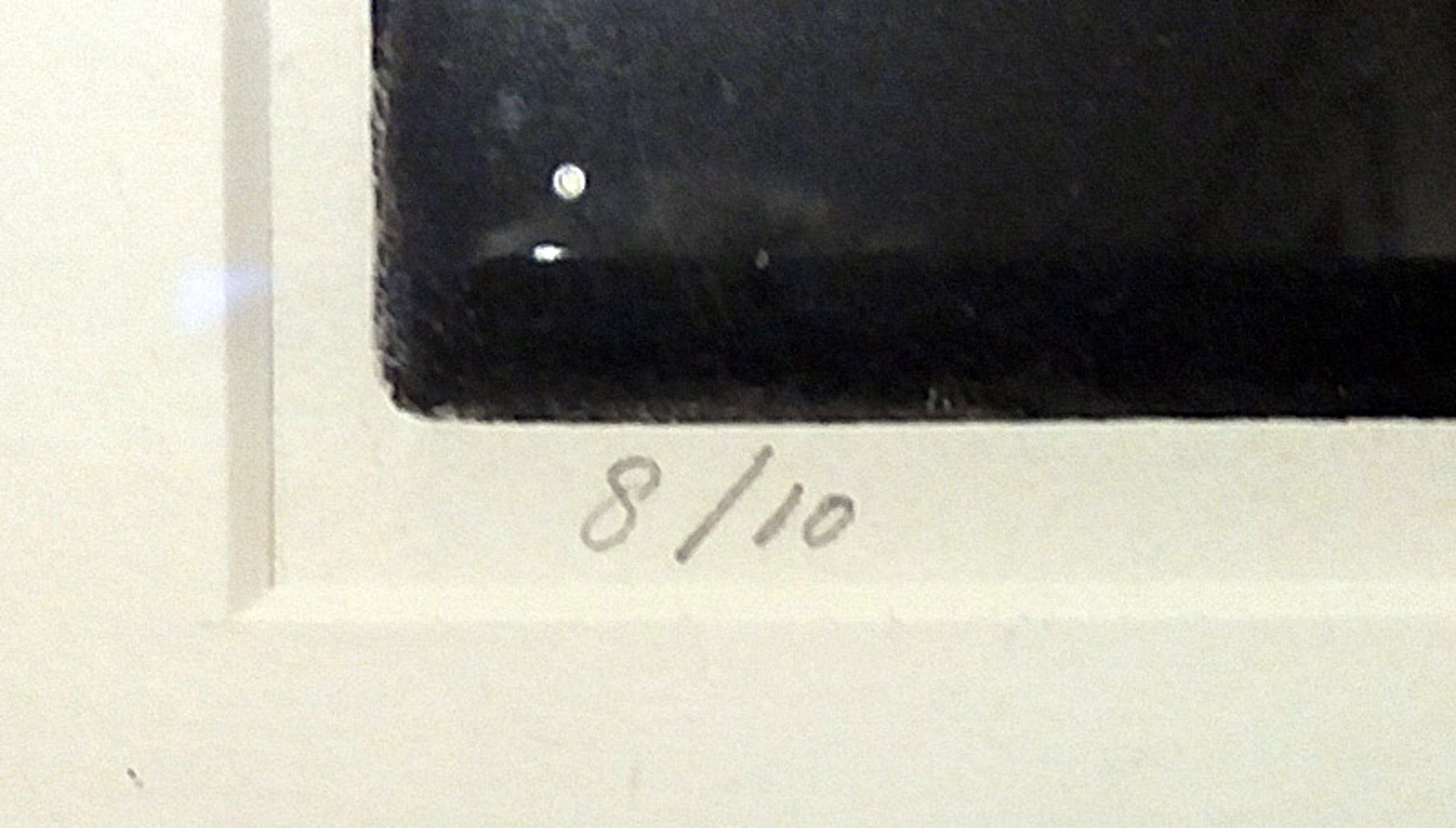ets-aquatint in zwart, wit en grijs. handgesigneerd door Margarita Nicolaas, nummer 8/10. Ingelijst in aluminium lijst met witte passe partout.