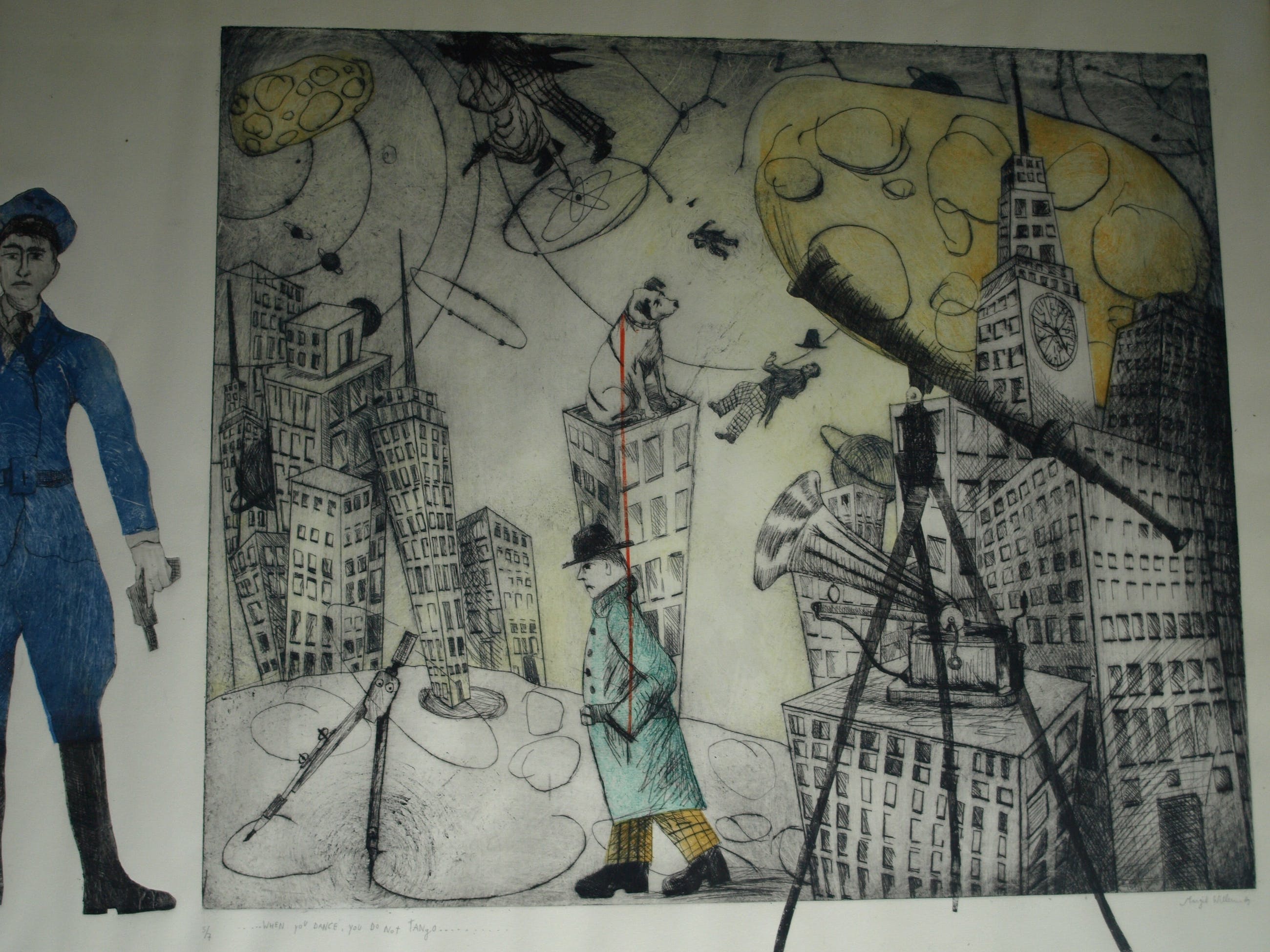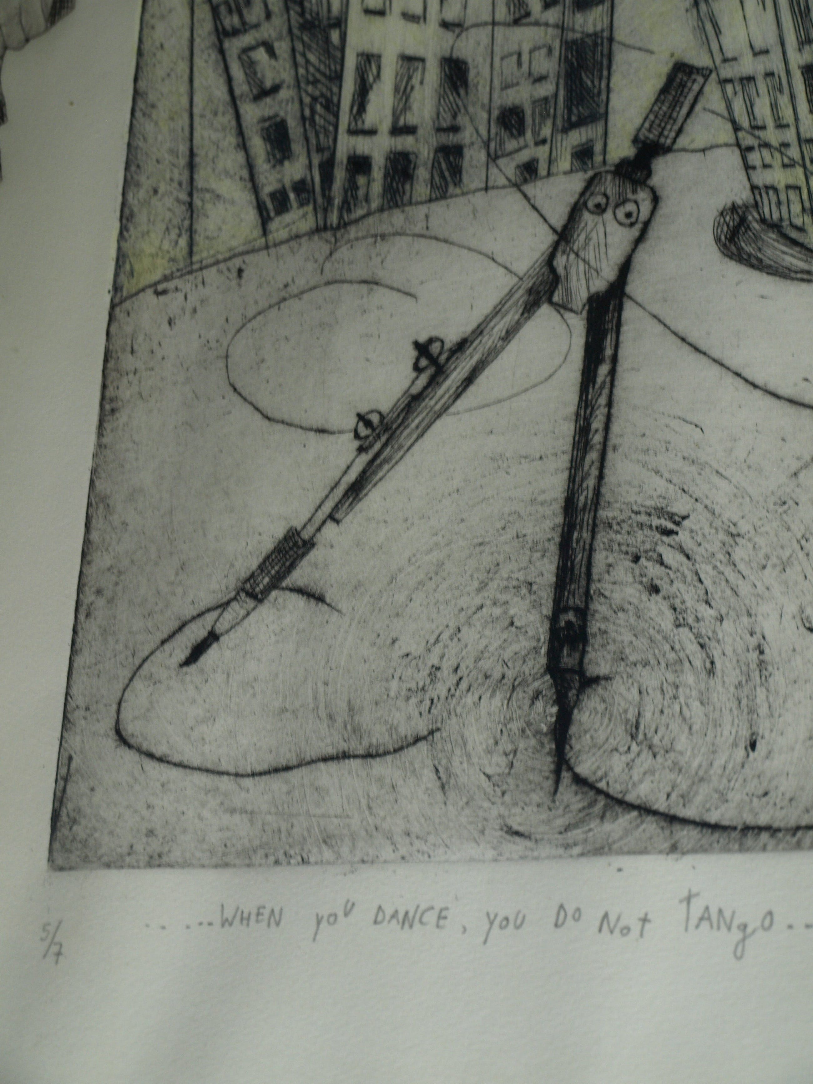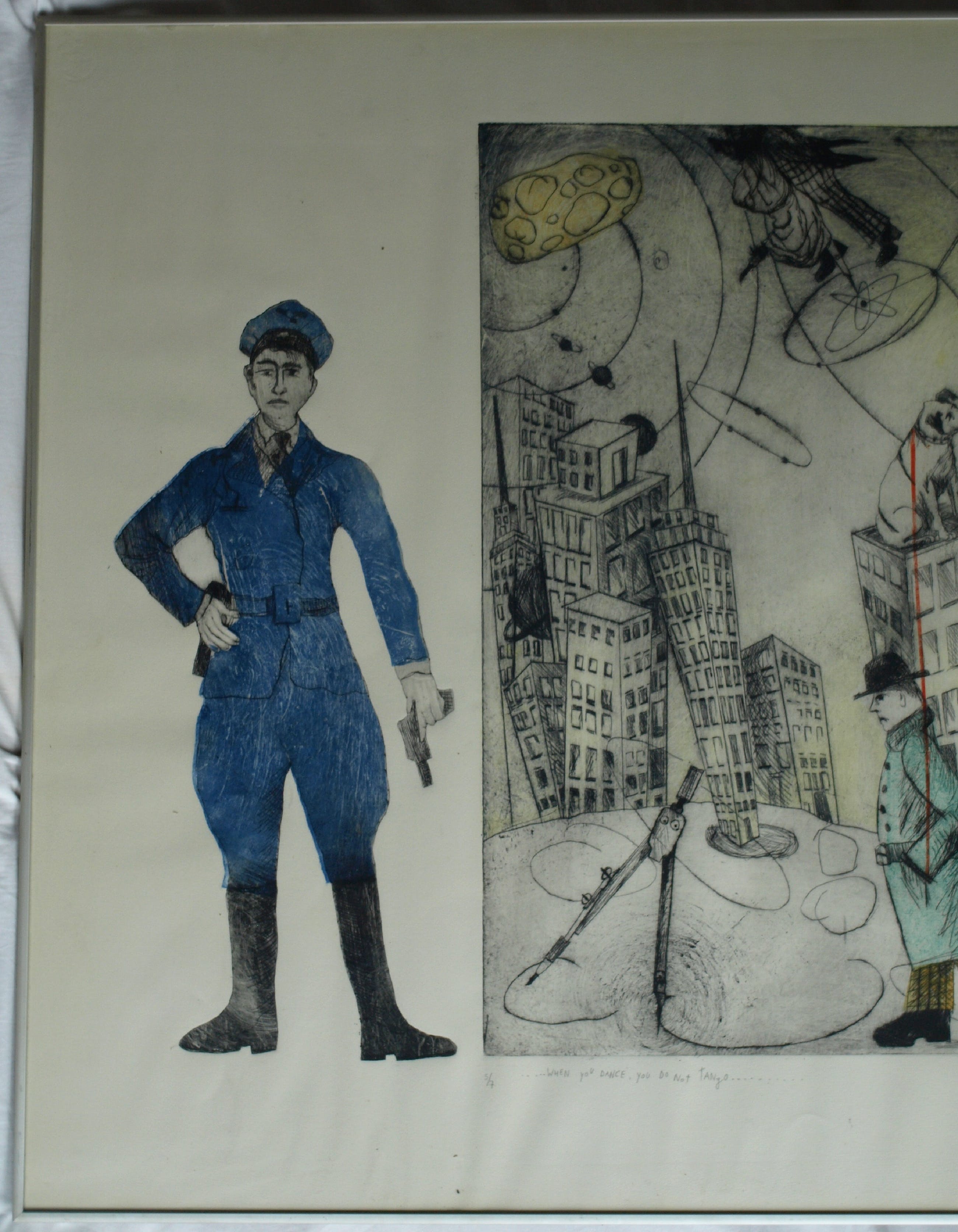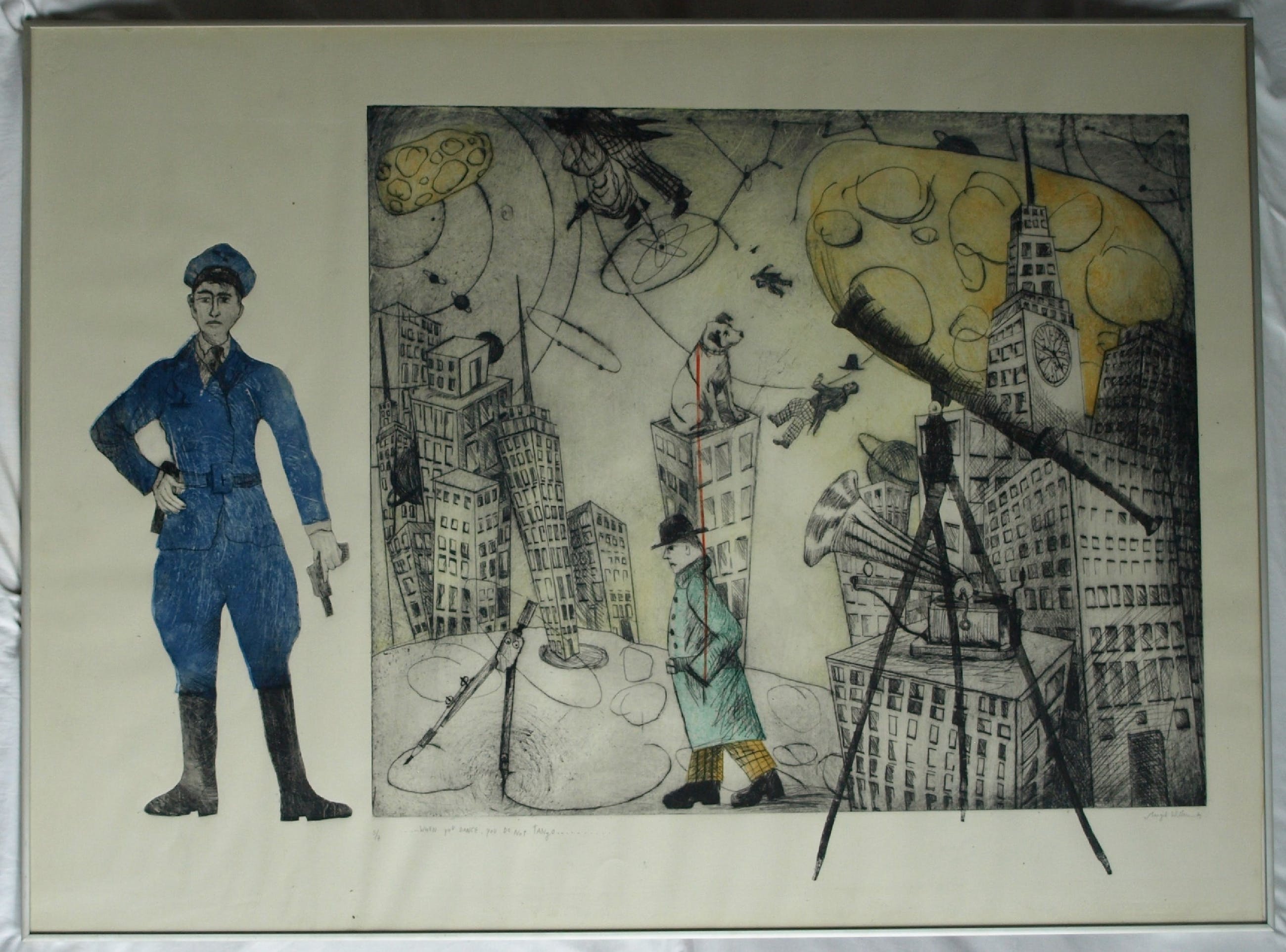 Een zeer grote ingelijste (en met de hand ingekleurde?) ets uit 1989 van de Nederlandse kunstenares Margit Willems (1955), getiteld “When you dance, you do not Tango”.