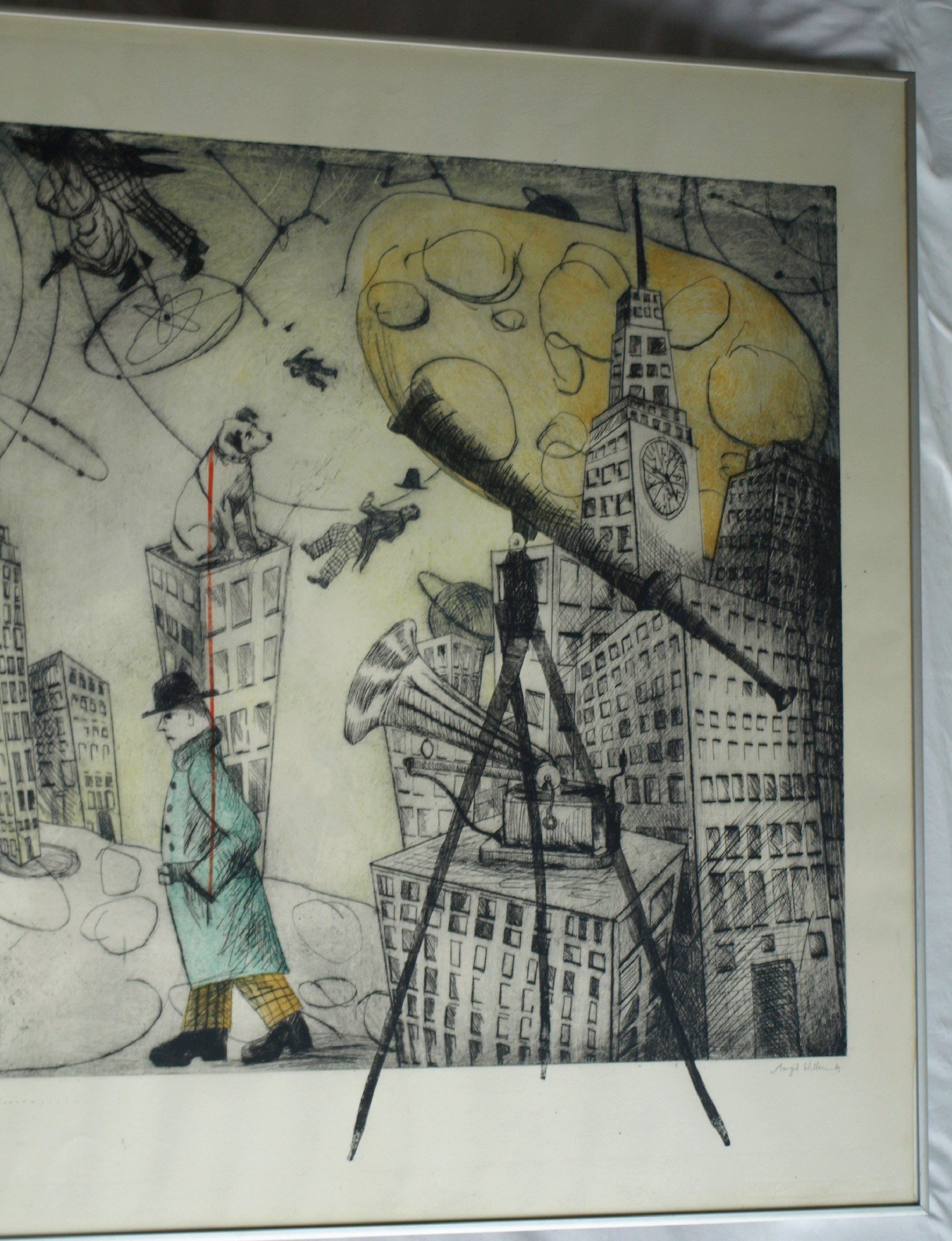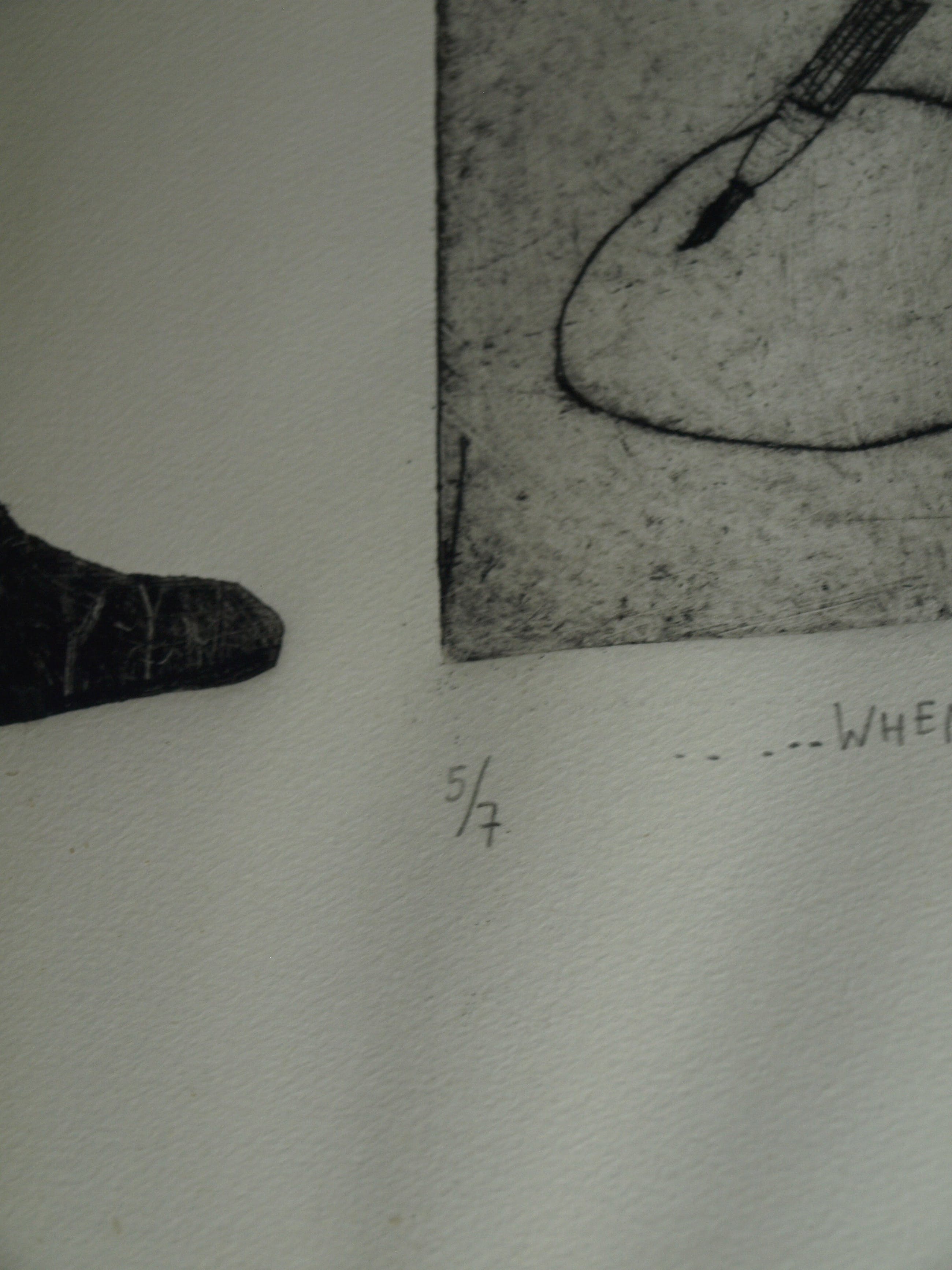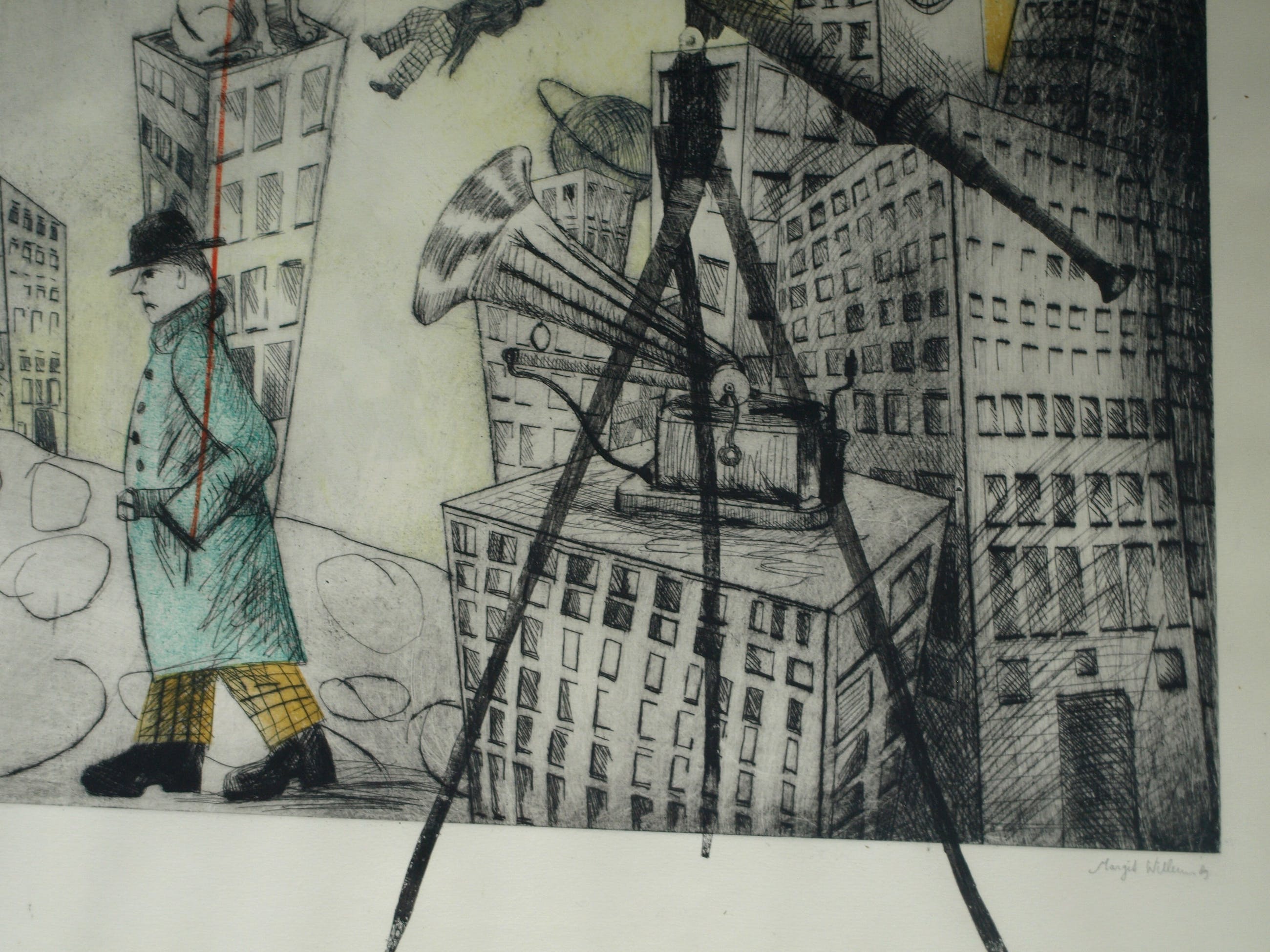 Een zeer grote ingelijste (en met de hand ingekleurde?) ets uit 1989 van de Nederlandse kunstenares Margit Willems (1955), getiteld “When you dance, you do not Tango”.