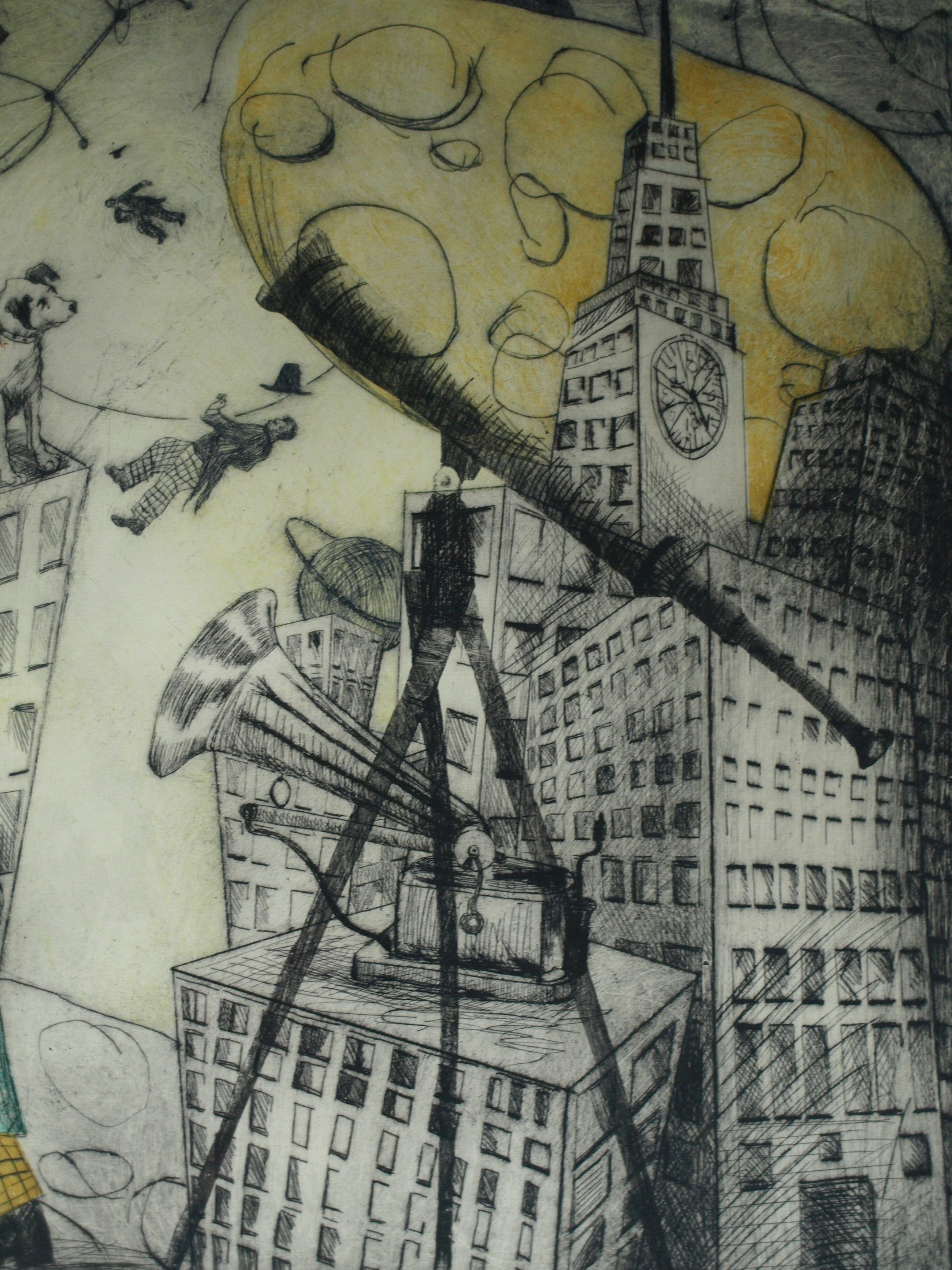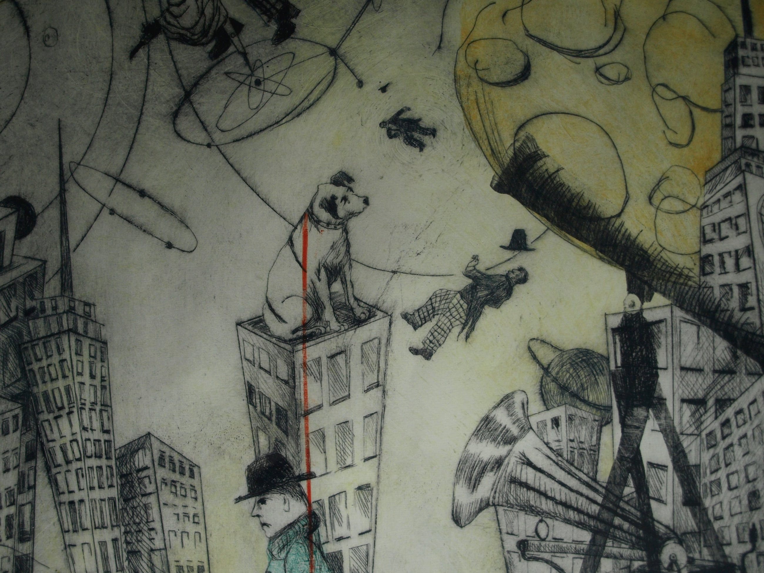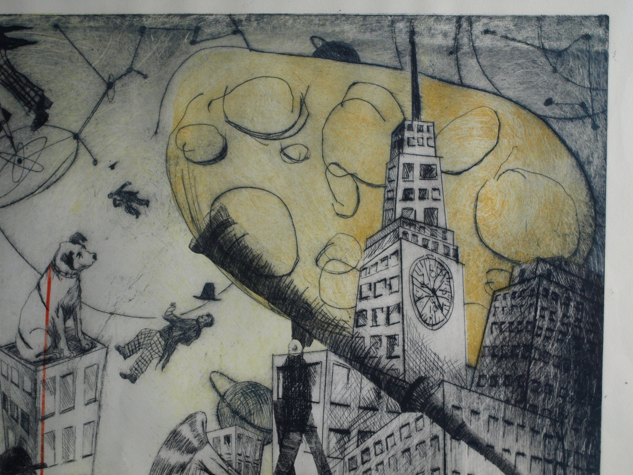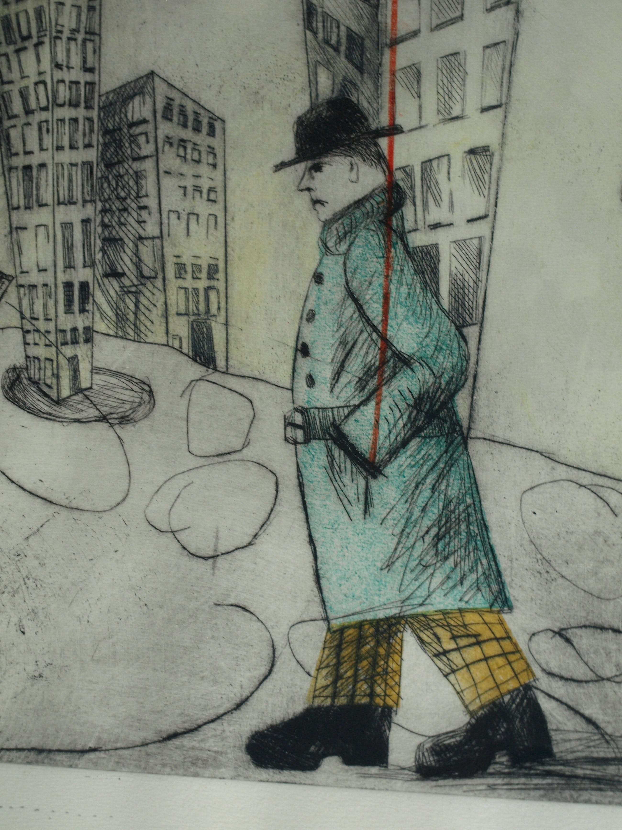 Een zeer grote ingelijste (en met de hand ingekleurde?) ets uit 1989 van de Nederlandse kunstenares Margit Willems (1955), getiteld “When you dance, you do not Tango”.