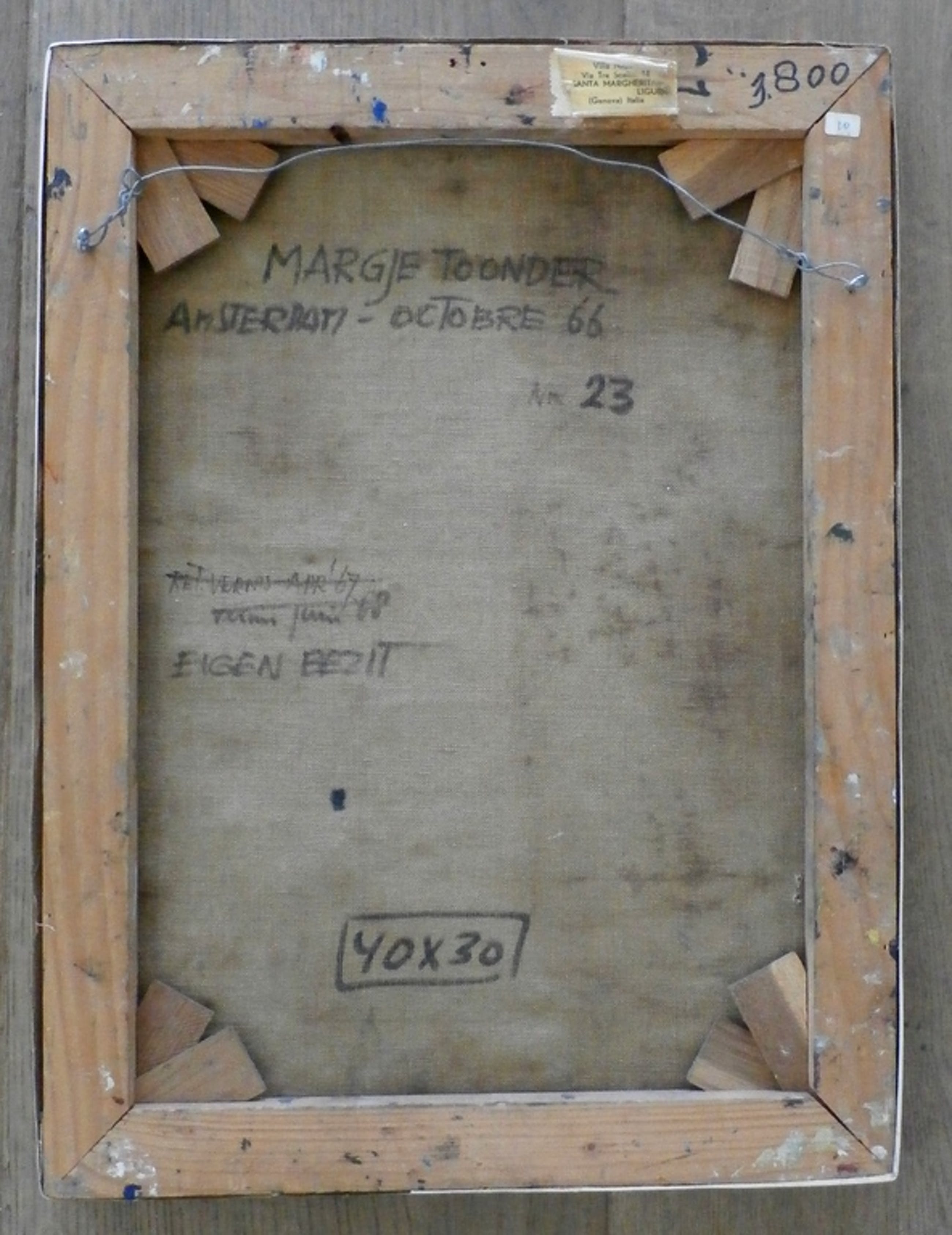 Schilderij van Margje Toonder uit haar eigen collectie. Jaar: 1966 Afmetingen: h40 x b30 cm. Het werk is linksonder gesigneerd door de kunstenaar. Ook op de achterzijde is het werk gesigneerd + Amsterdam - Octobre 66 - nr 23. De authenciteit van dit werk wordt voor 100% gegarandeerd. Een certificaat kan, op aanvraag, worden meegeleverd.