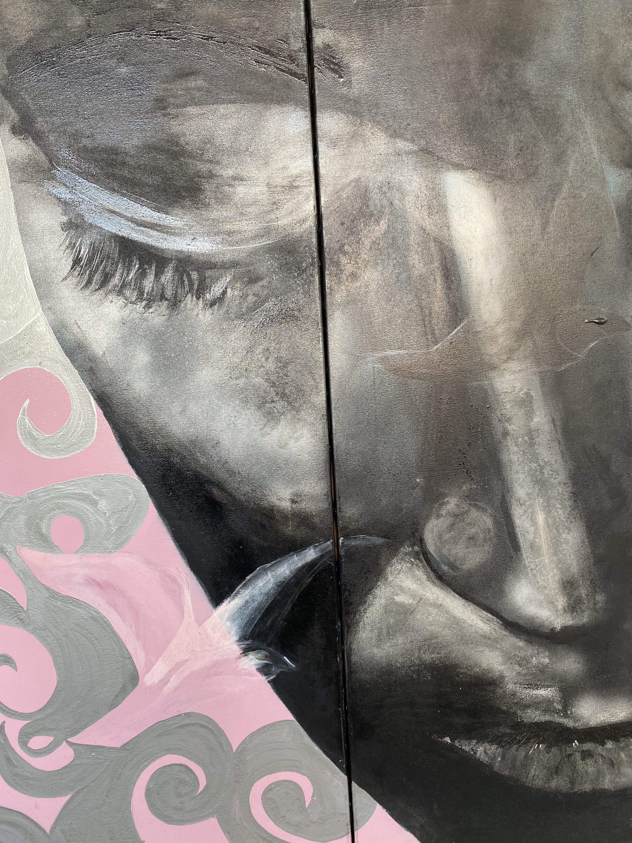 Dit is een doek uit haar beginjaren. Afmetingen totaal: 90 x 90 cm. Deel 1: 60 x 90 Deel 2: 30 x 90. Ik heb ze aan elkaar vastgemaakt. De schilderijen van Margje Teeuwen zijn gelaagd en raken de essentie van de menselijke ziel. Haar werk is niet in één blik te vangen en eerste indrukken worden al snel vervangen door beelden. Beelden die een unieke betekenis hebben voor de aanschouwer. Kijken naar haar werk roept nu eenmaal emoties uit de diepte op. Dit effect komt tot stand door enerzijds de unieke aanpak van Margje Teeuwen en anderzijds door het gevarieerde materiaal gebruik. Al tientallen jaren maakt zij haar verven zelf, of ze nu schildert met asfalt, ecoline, of epoxy elk beeld vraagt om zijn eigen vertaling.
