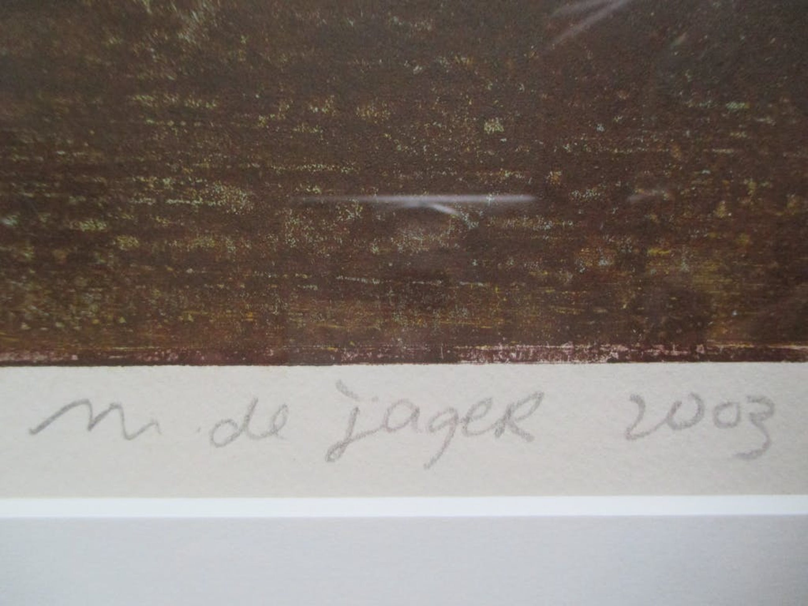 Grote aluminiumprint uit kleine oplage van Margot de Jager (1956), r.o. gesigneerd en gedateerd 2003, genummerd 4/8, getiteld 'Laagland'. Mooi professioneel zuurvrij ingelijst achter glas in een Barth-lijst, afm. lijst 93x78, beeld 69 x51 cm. Het geheel verkeert in perfecte staat.