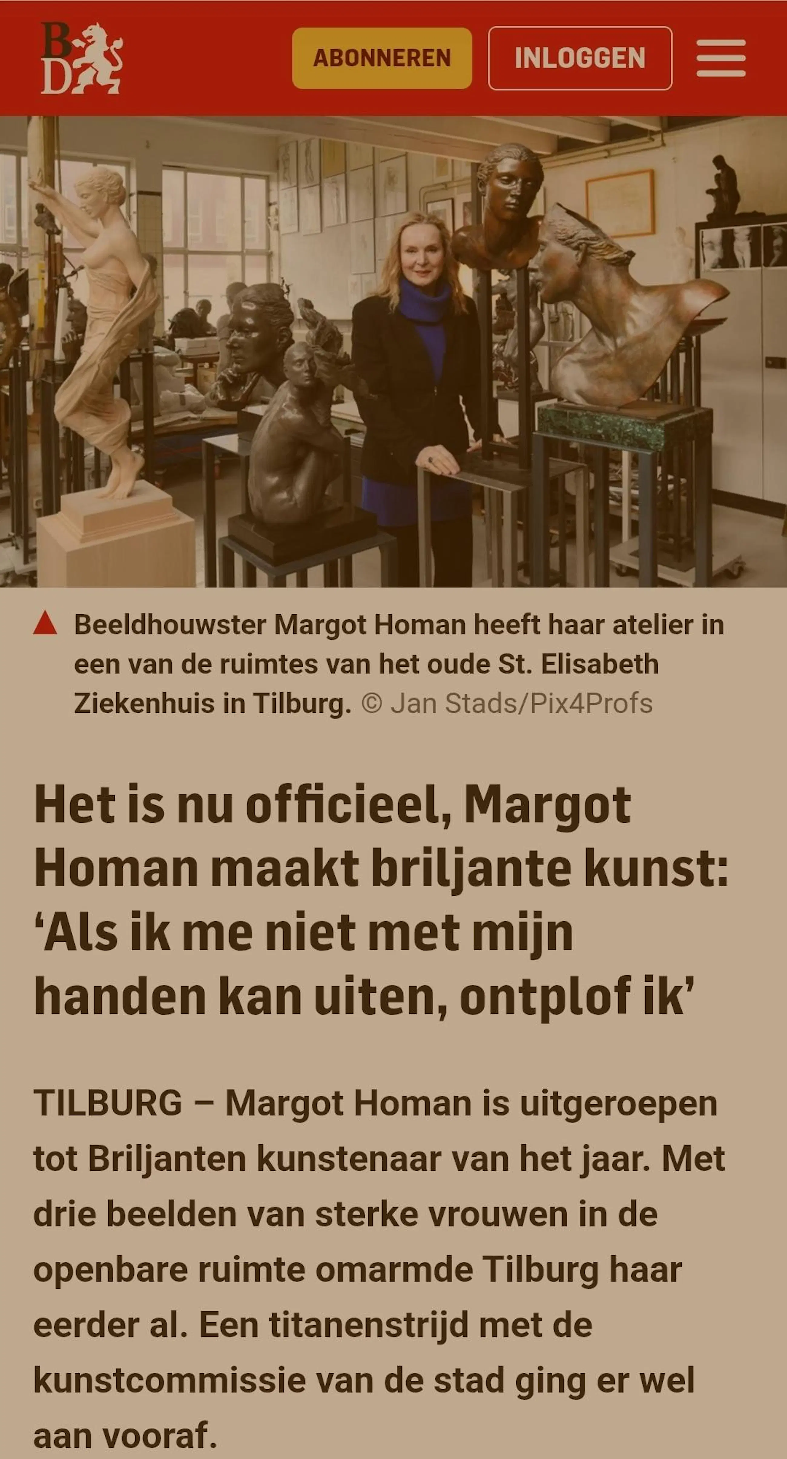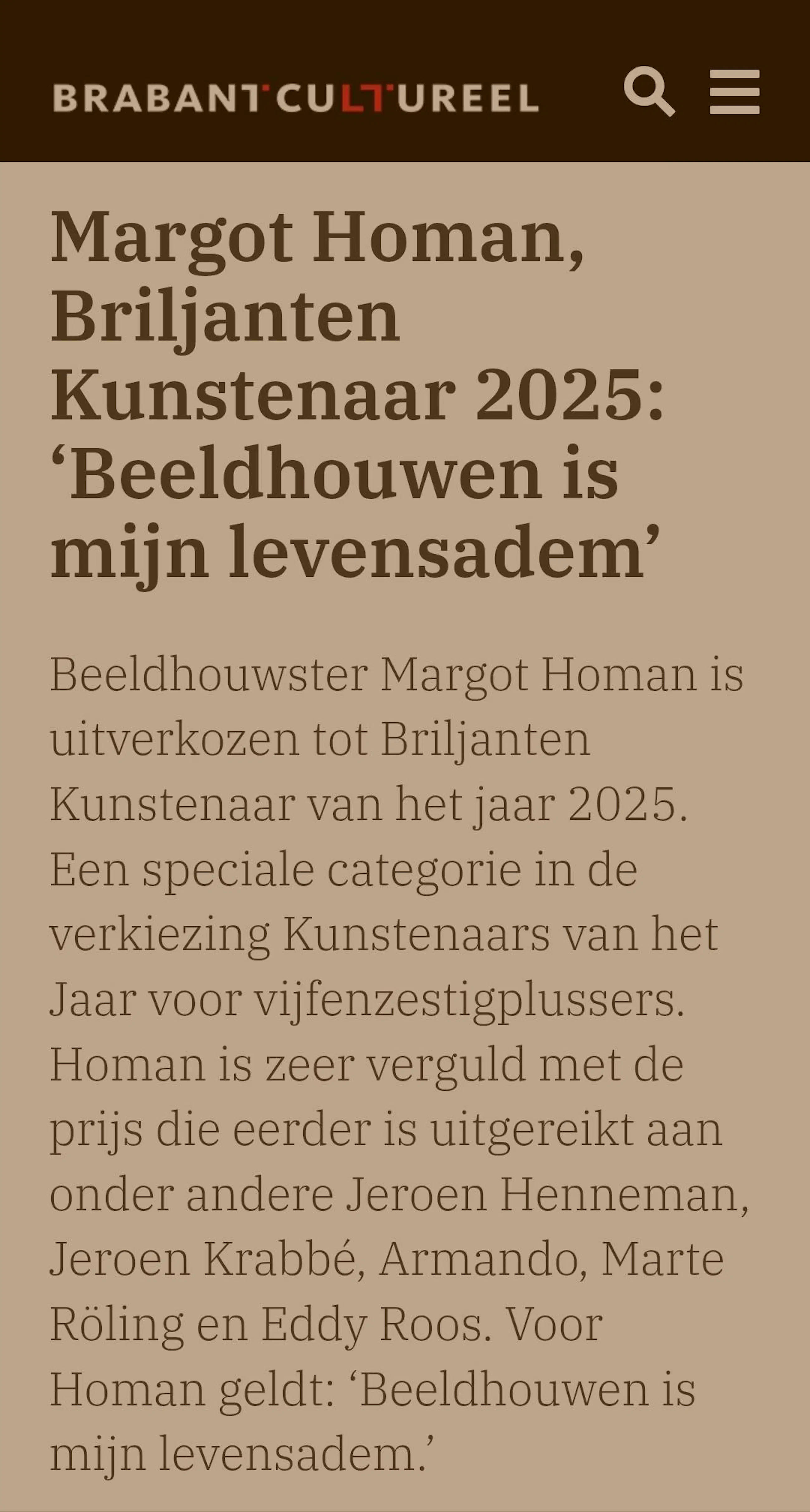 Margot Homan is een meester van de figuratieve beeldhouwkunst die de klassieke traditie verbindt met een eigentijdse bezieling. Haar vakmanschap en jarenlange toewijding aan de harmonie van de menselijke vorm werden recentelijk op de hoogste trede gezet: zij is uitgeroepen tot Briljanten Kunstenaar van het Jaar 2025. Deze eervolle titel is een erkenning voor haar indrukwekkende oeuvre en haar unieke gave om brons en marmer te laten spreken. Homan bewijst keer op keer dat ware kunst niet schreeuwt, maar fluistert, en dat de grootste kracht vaak schuilt in de verstilde perfectie van een gebaar.