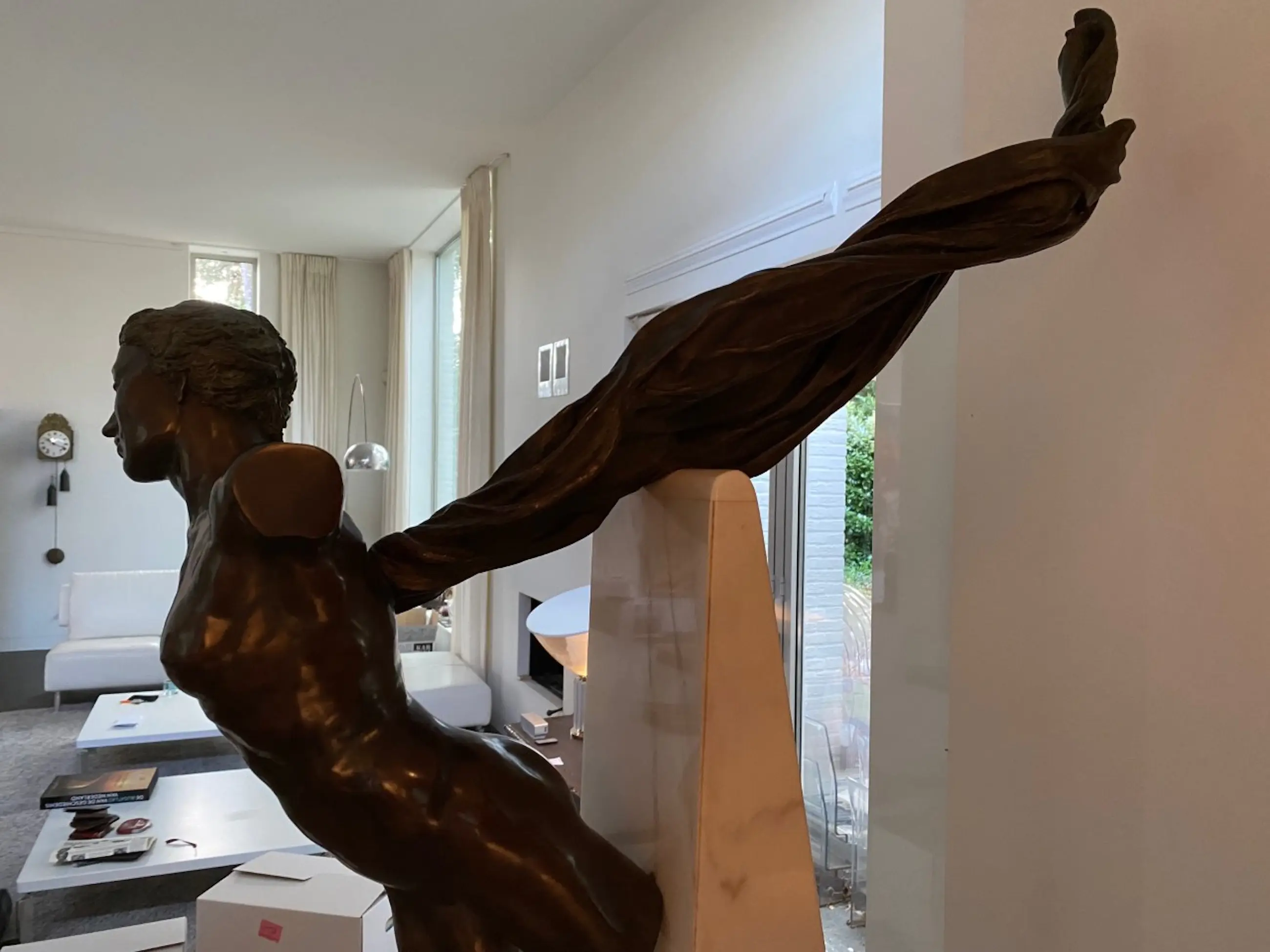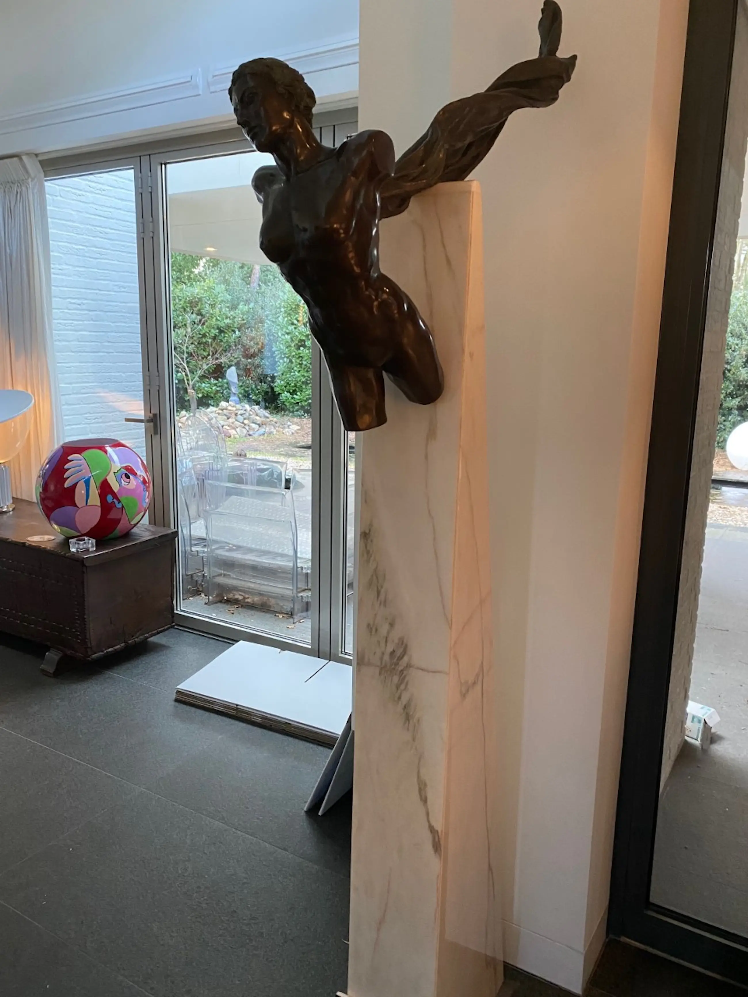 Prachtig bronzen beeld van een naakte vrouw zonder armen aan een marmeren sokkel. Boek van de kunstenares is bijgevoegd.