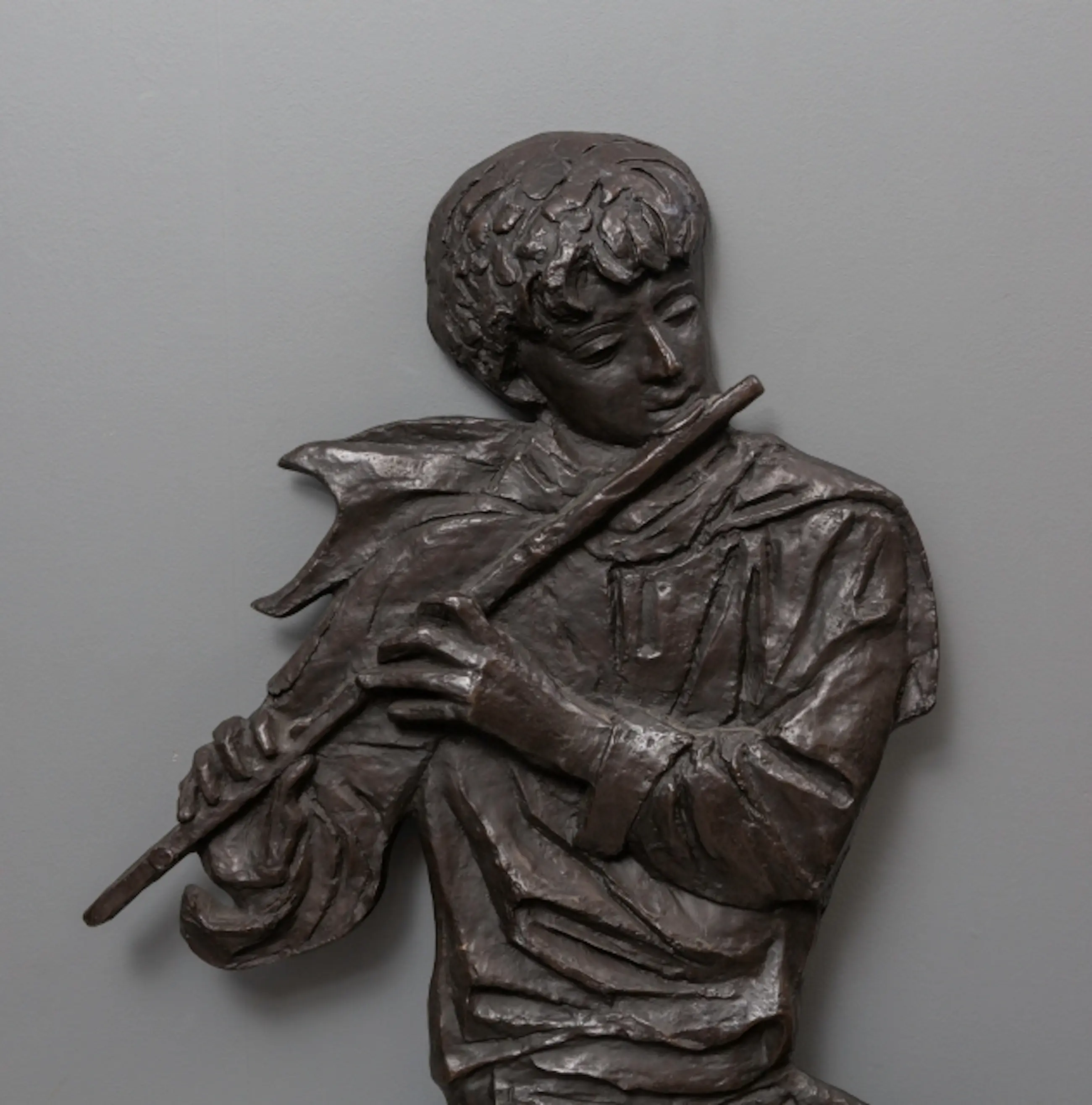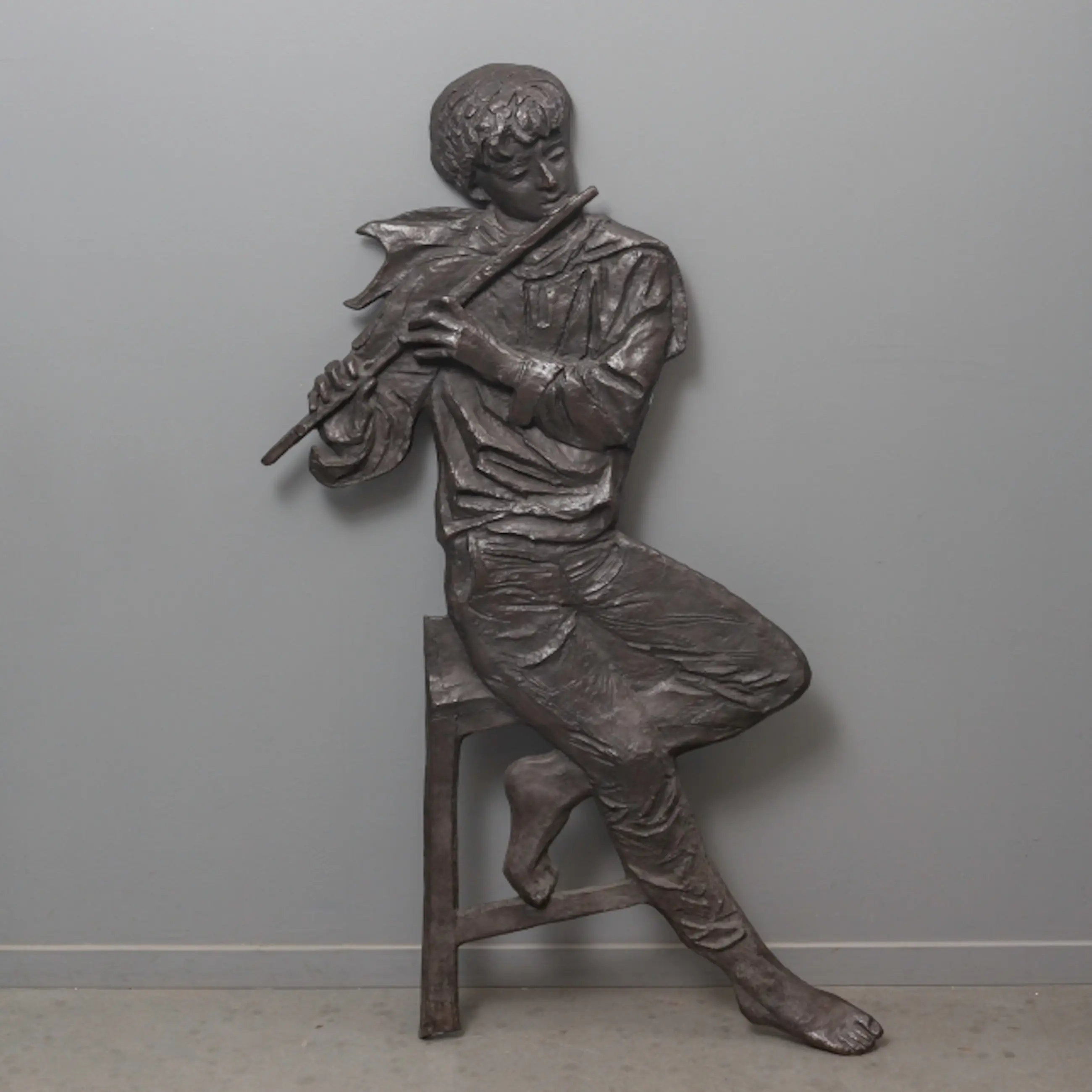 Dit monumentale bronzen wandsculptuur toont een fluitspelende jongen en is te koop. Met een hoogte van 150 cm en een breedte van 90 cm is dit een imposant werk dat zowel binnen als buiten tot zijn recht komt.