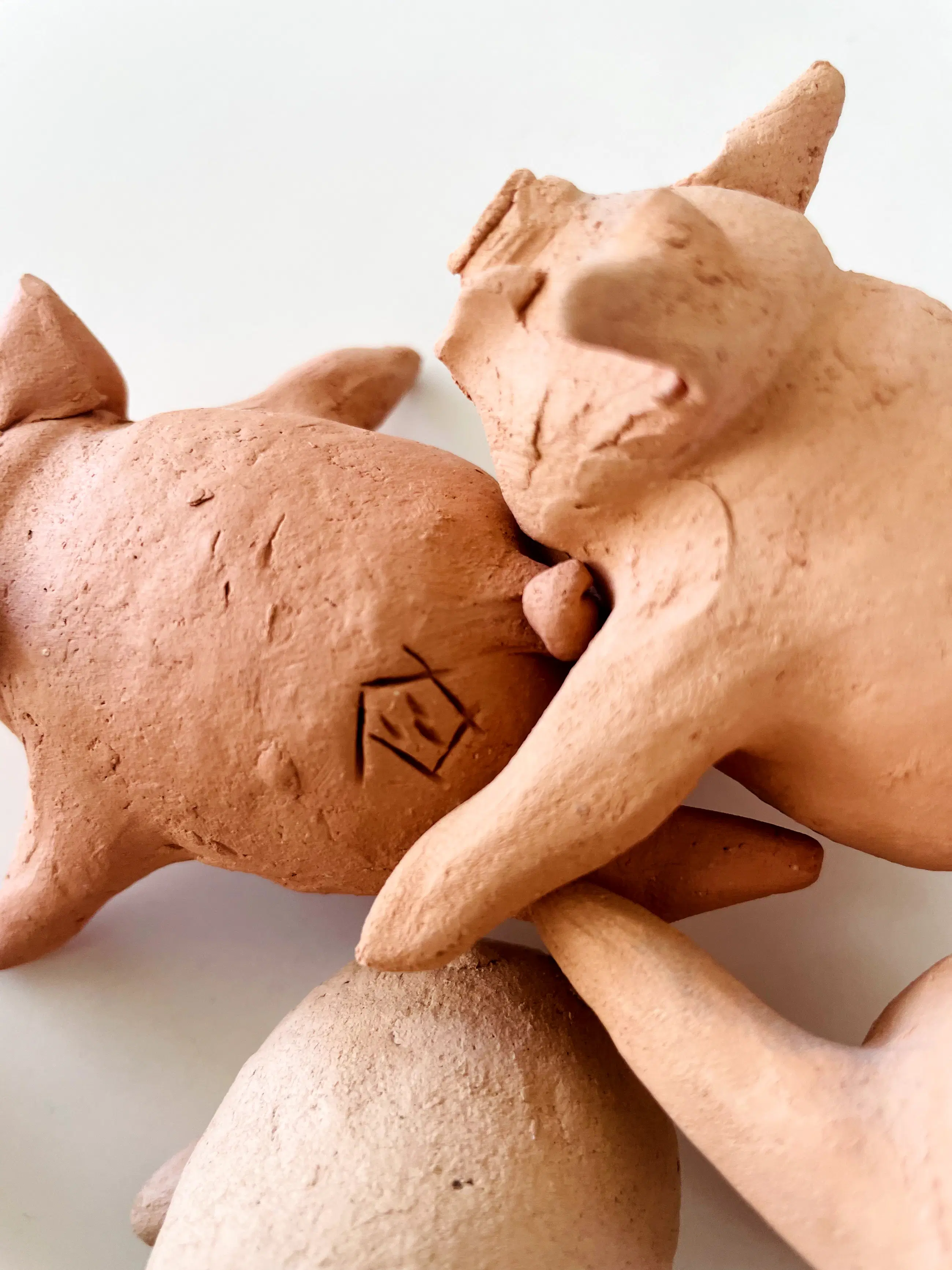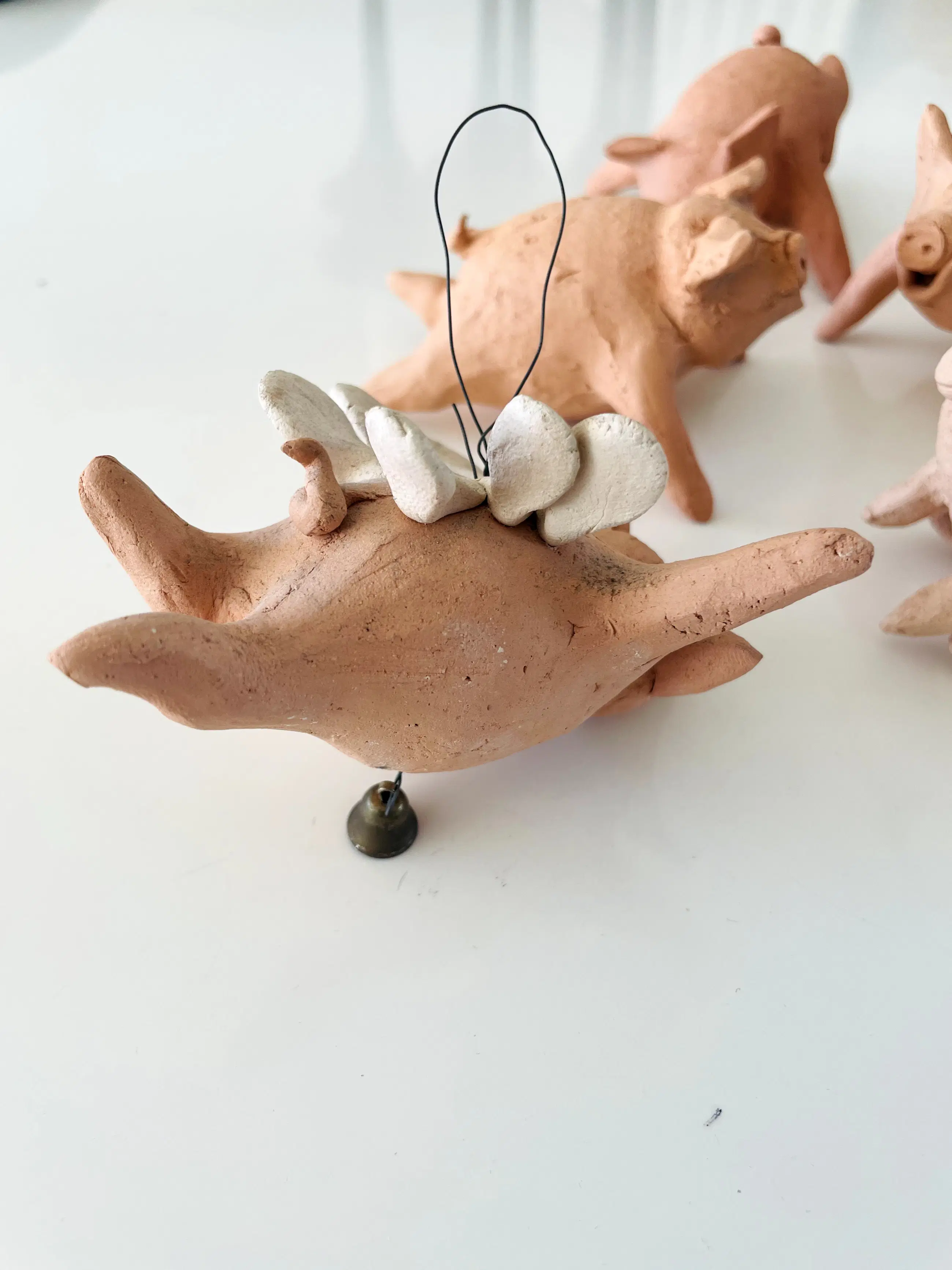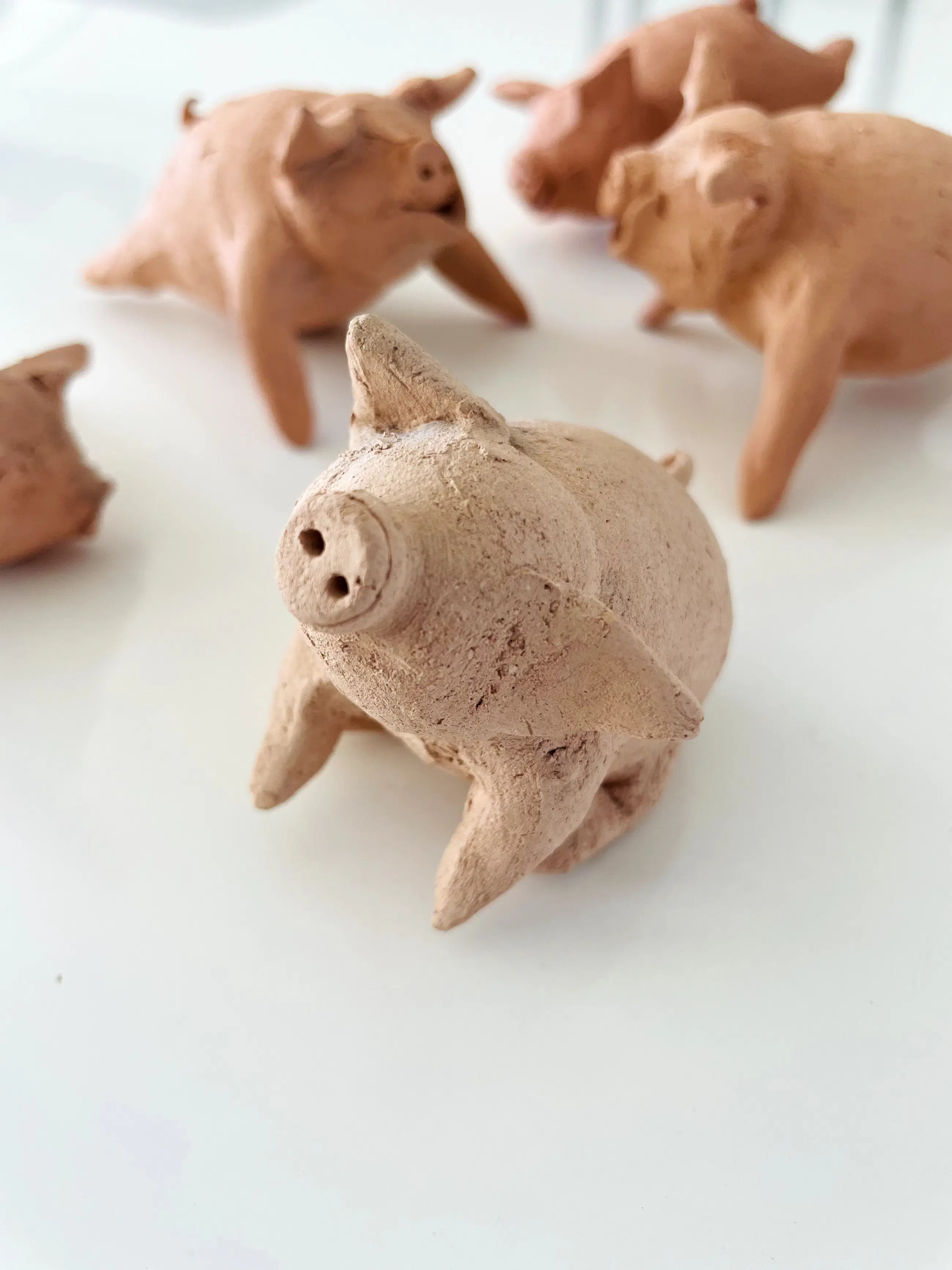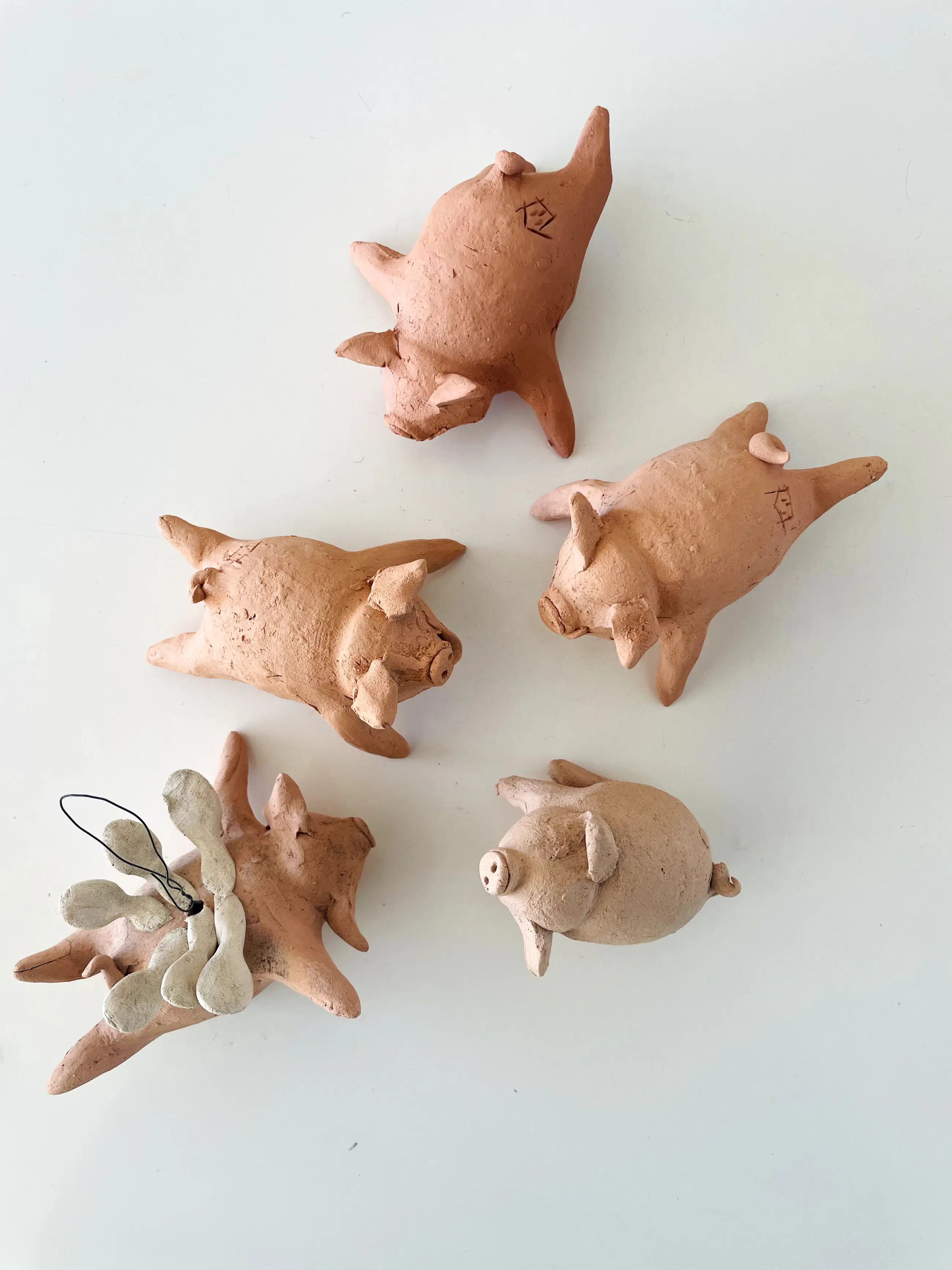 Vijf keramieken varkens van kunstenaar Margreet Huisman. Drie 'feestvarkens', een 'engelbewaarder' (die opgehangen kan worden) en een zittend exemplaar. Genoemde afmetingen en gewicht zijn per stuk.