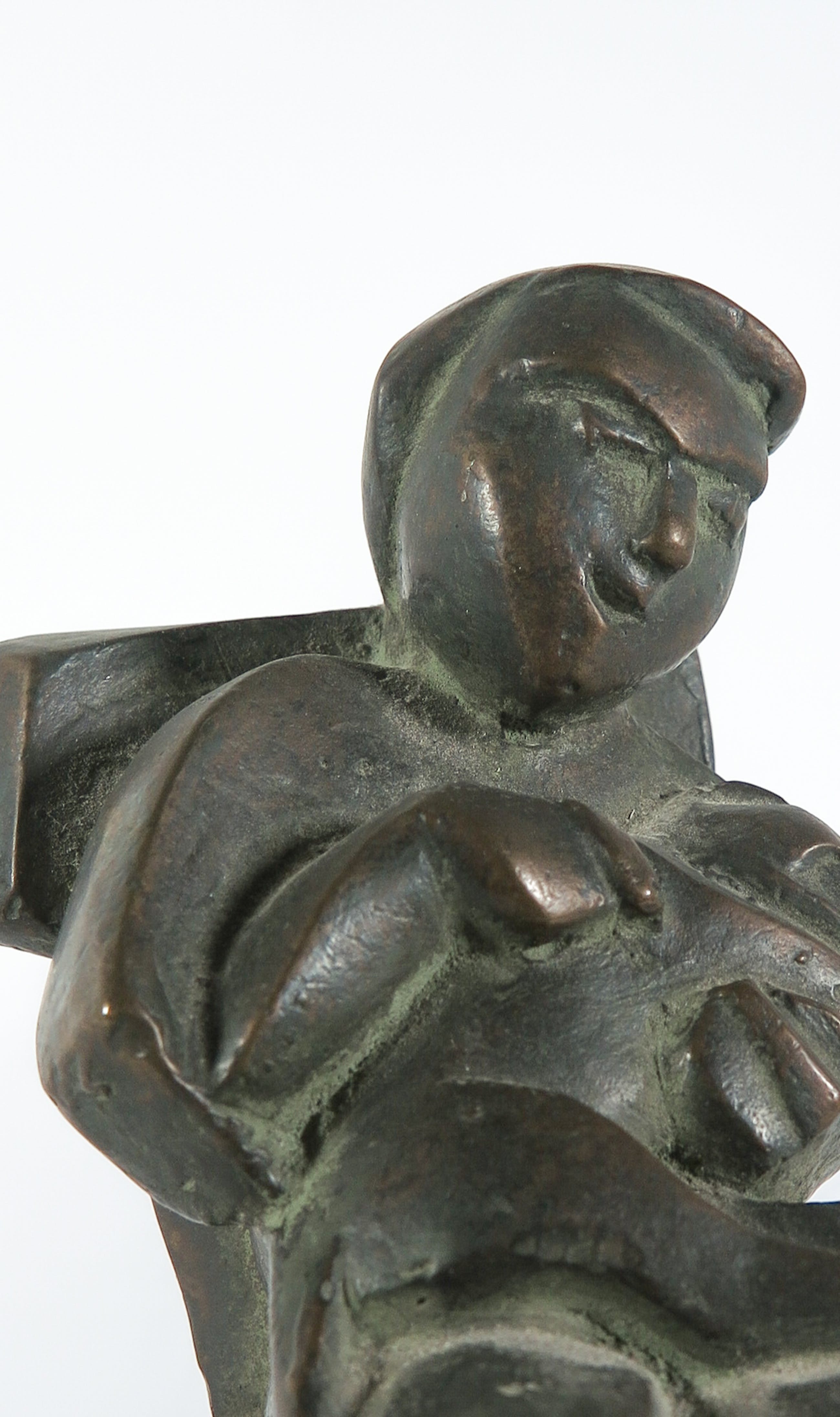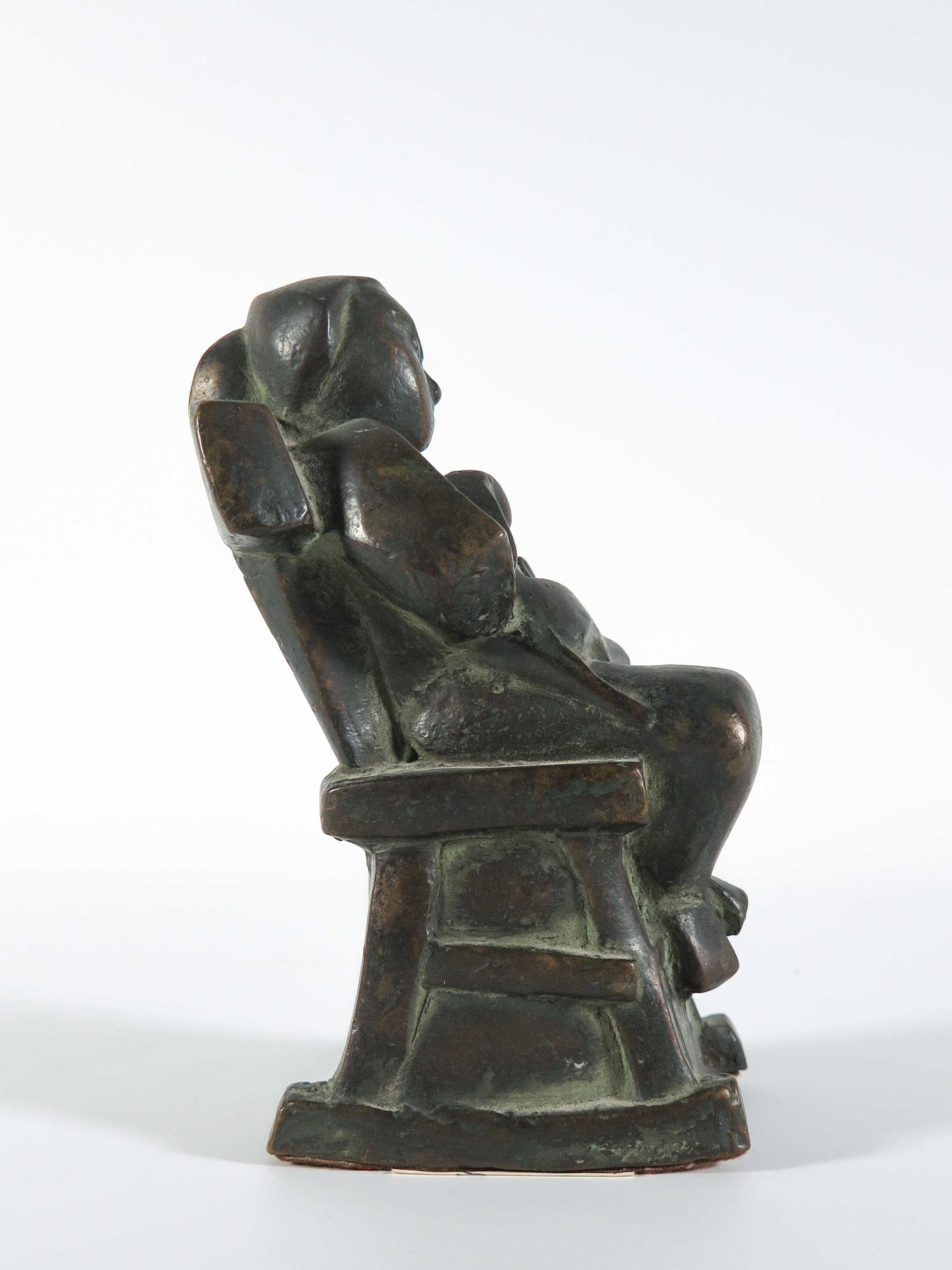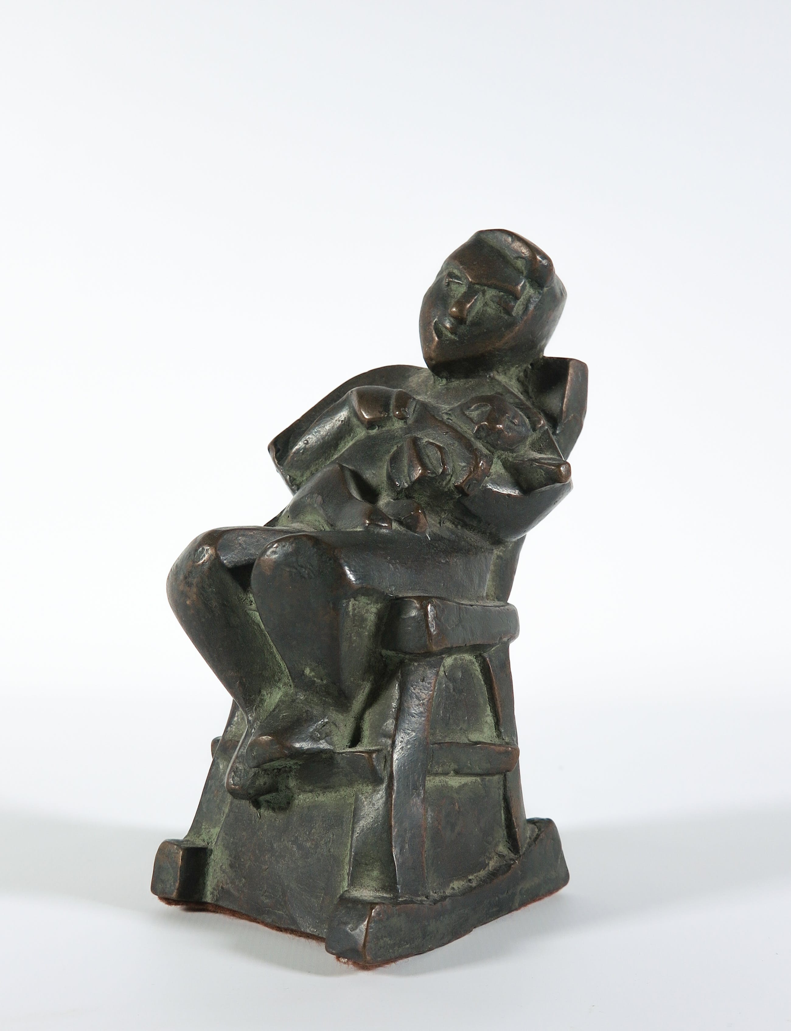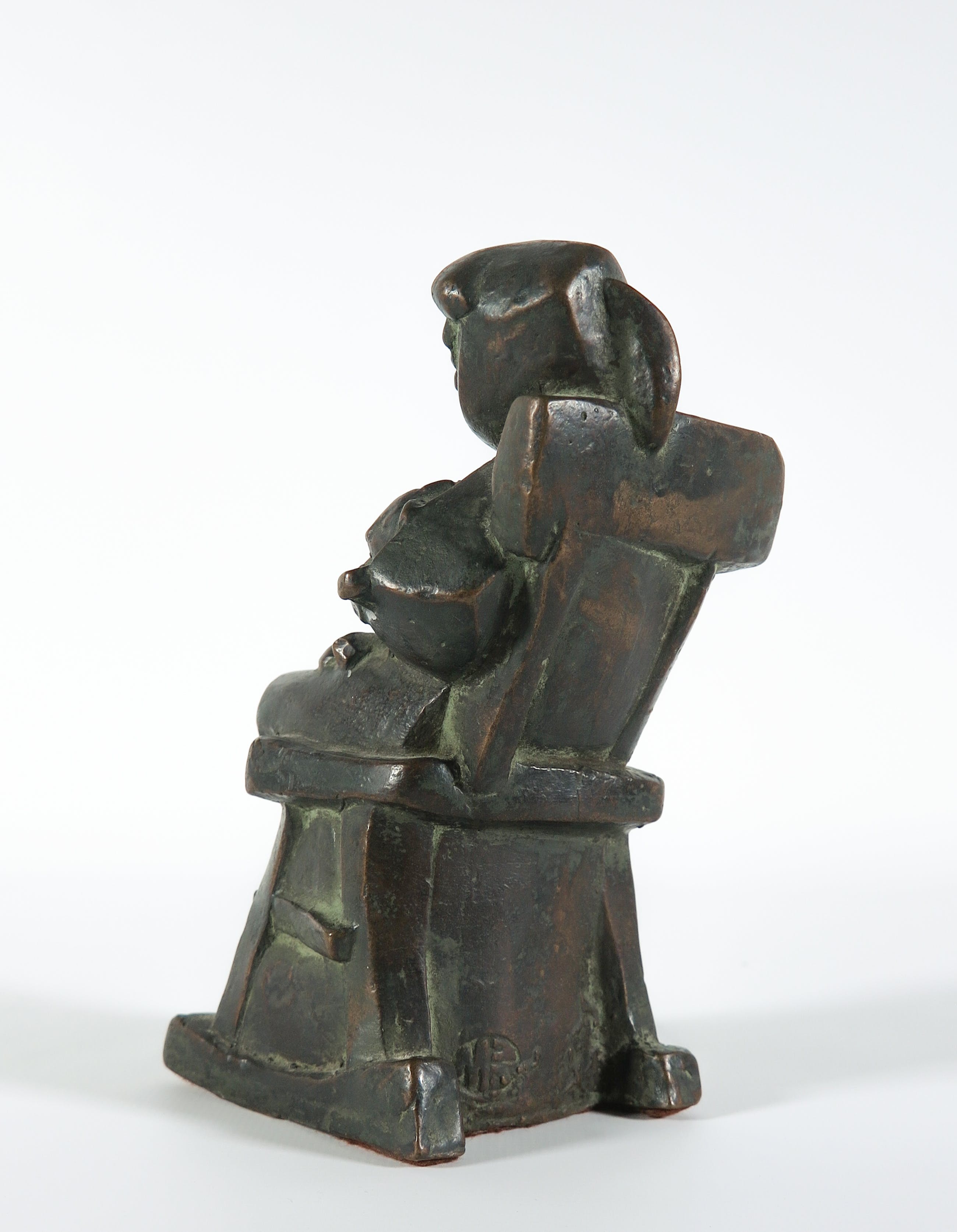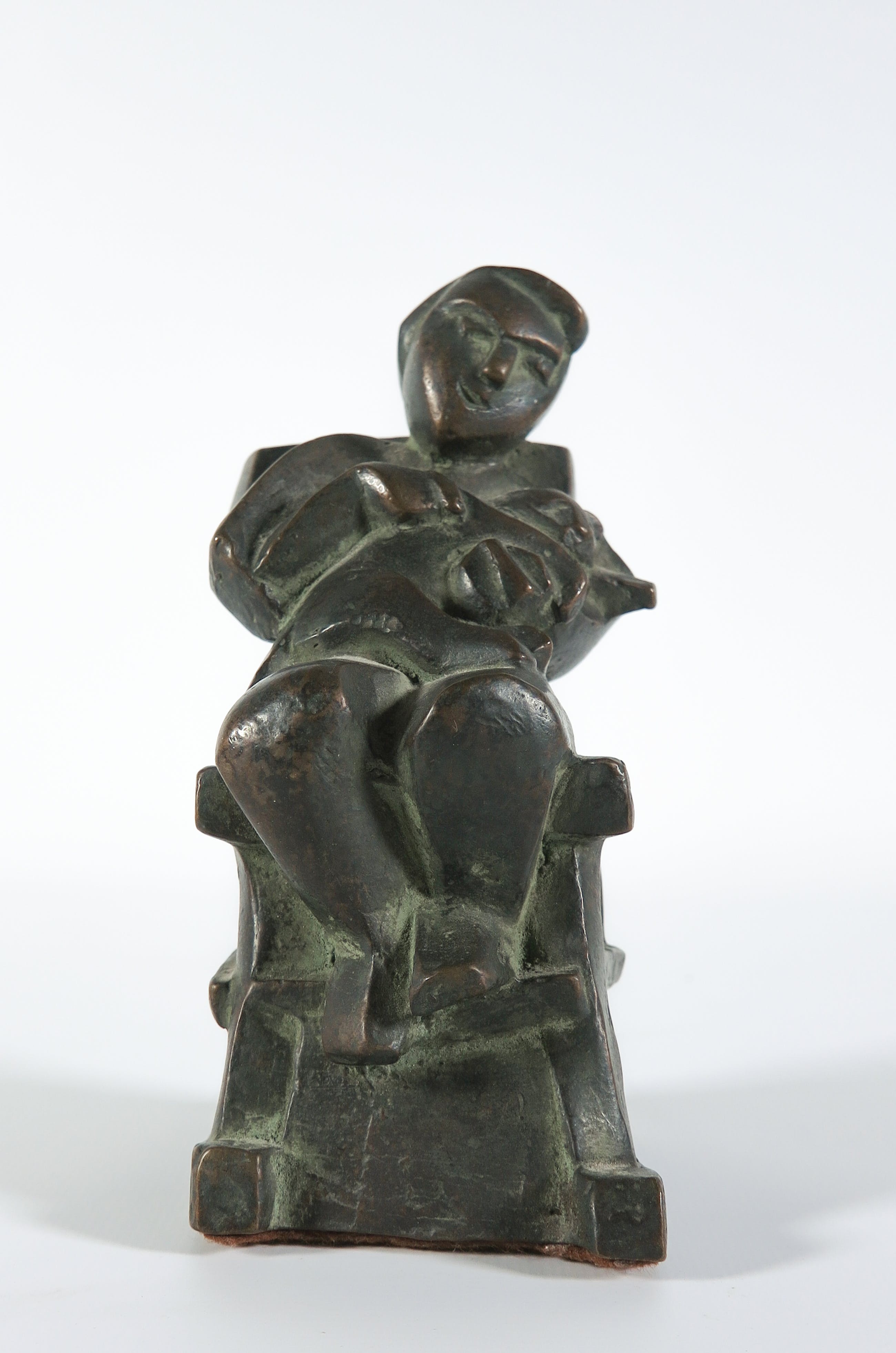 Aandoenlijk modern uitgevoerd bronzen beeldje van een zittend meisje met kat. Aan de achterzijde voorzien van monogram-stempel.