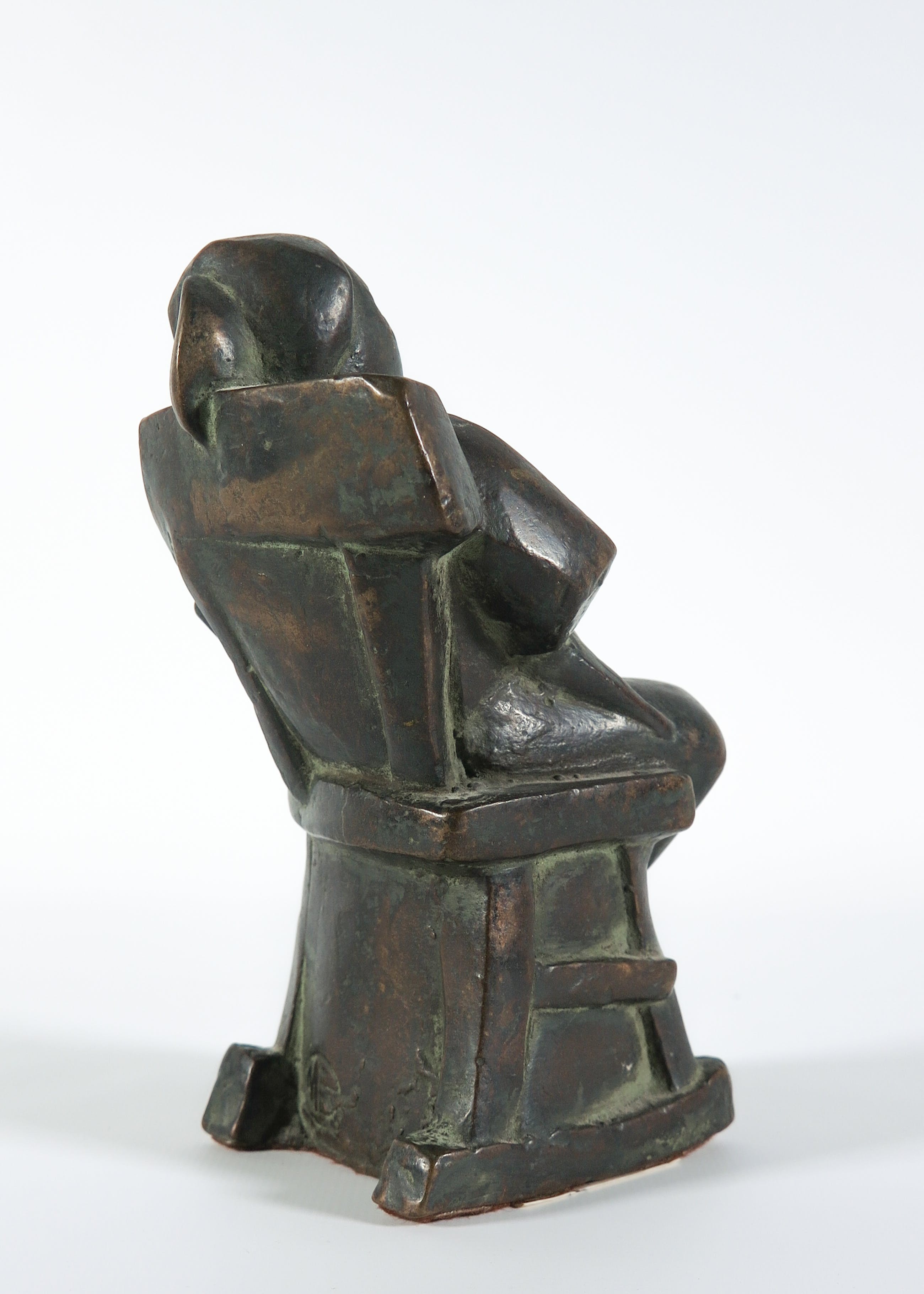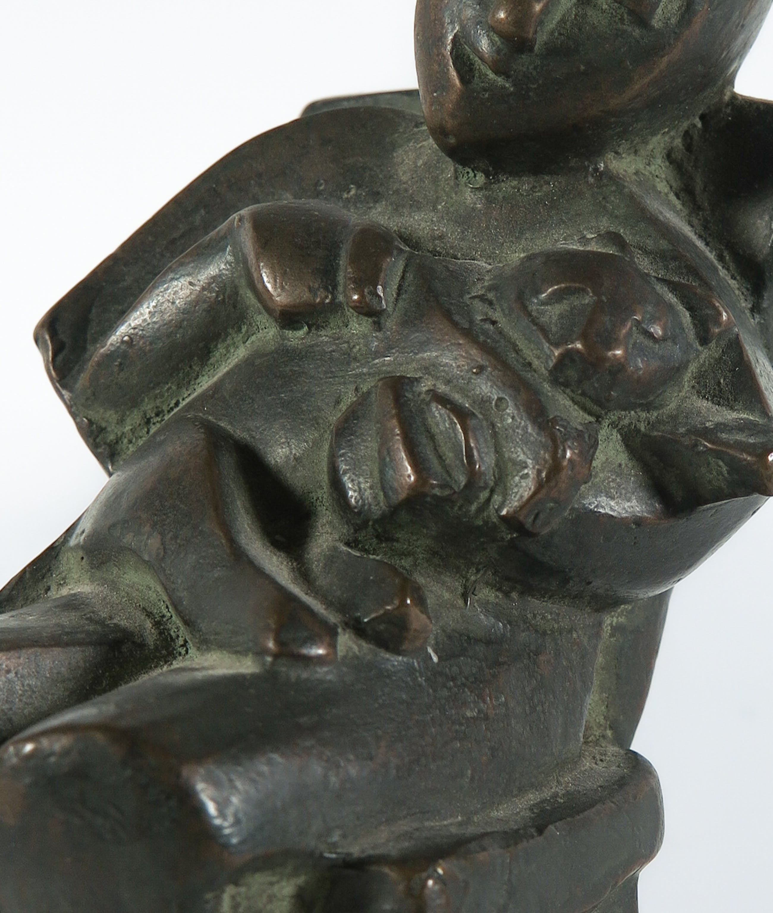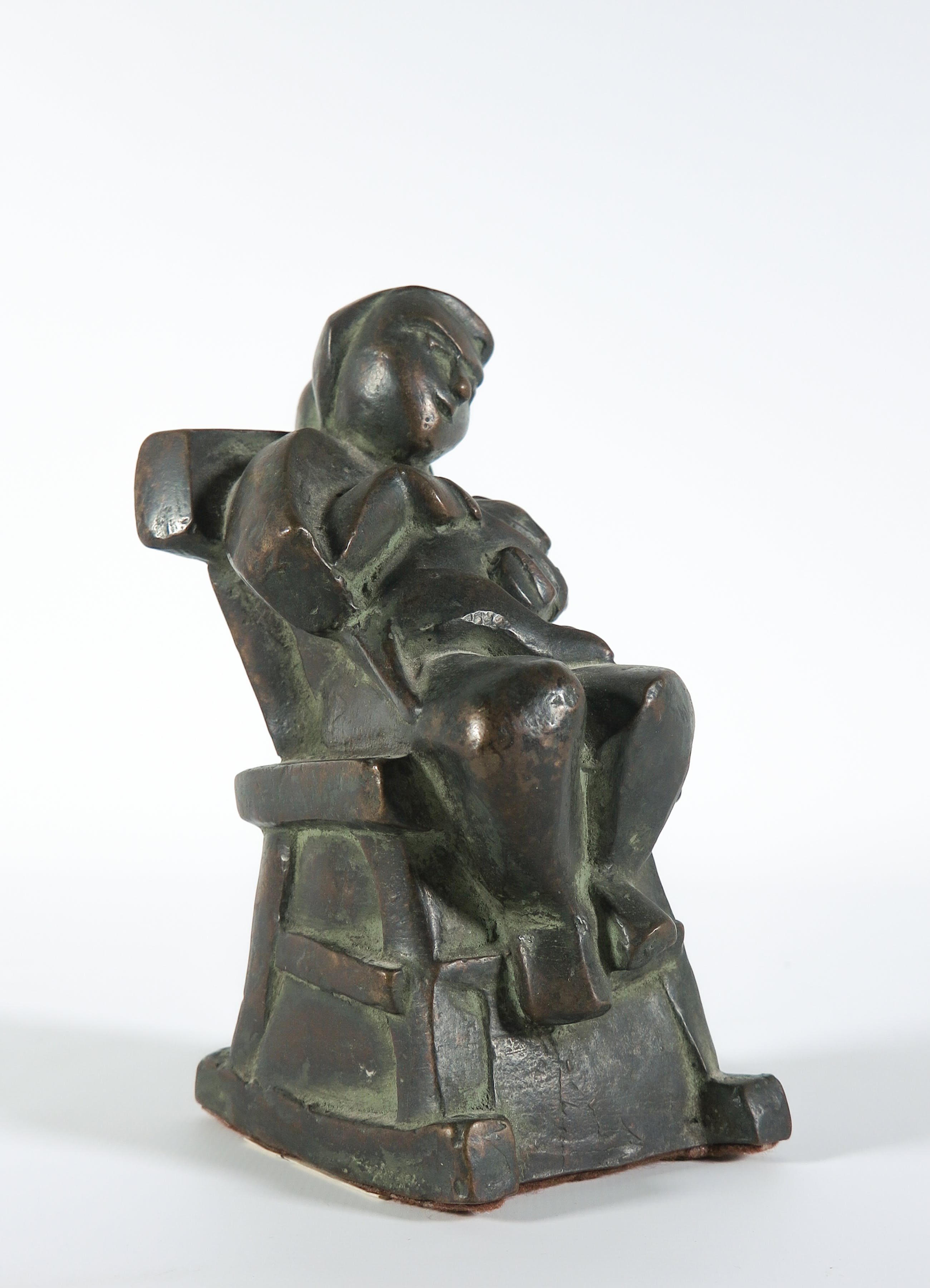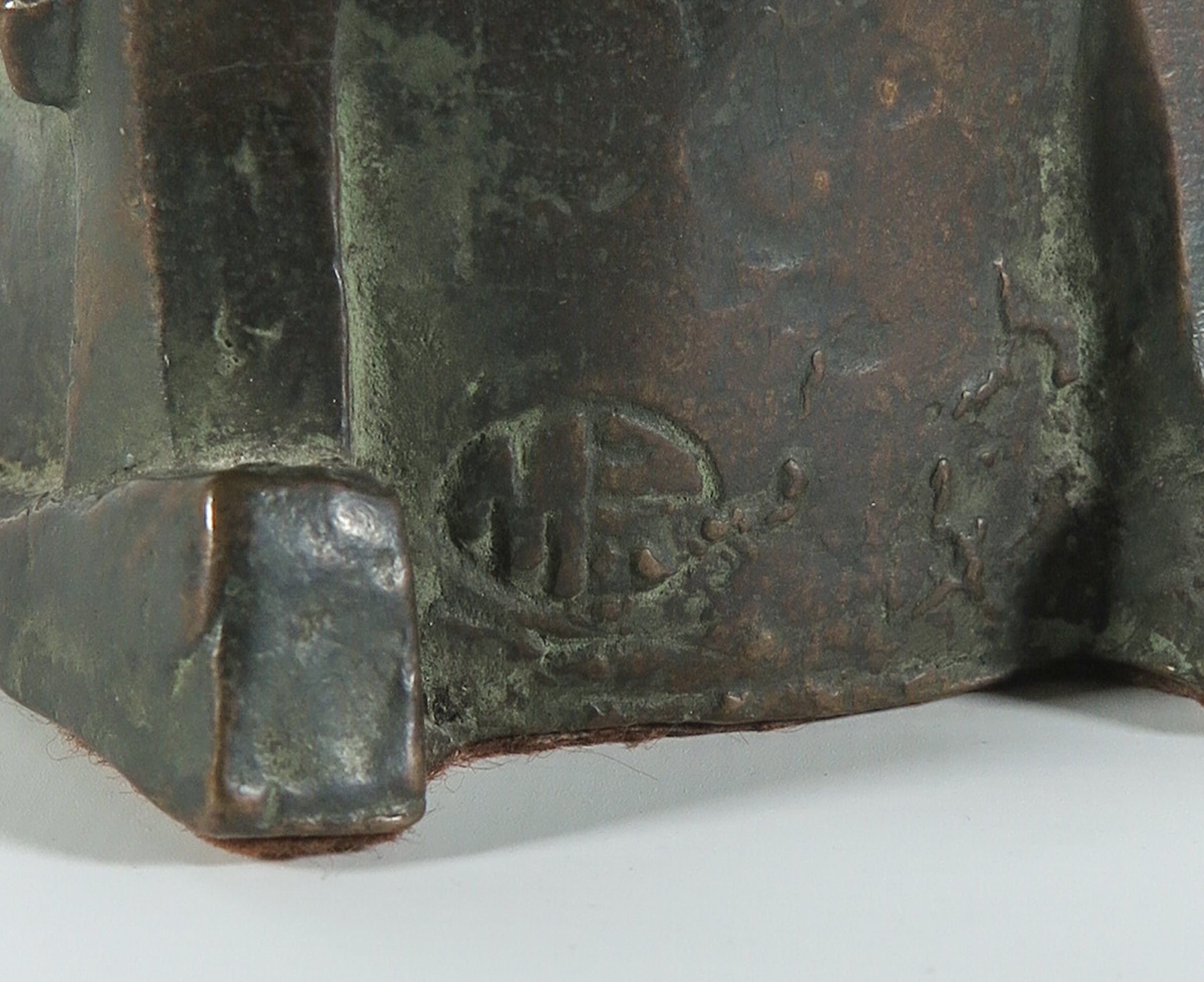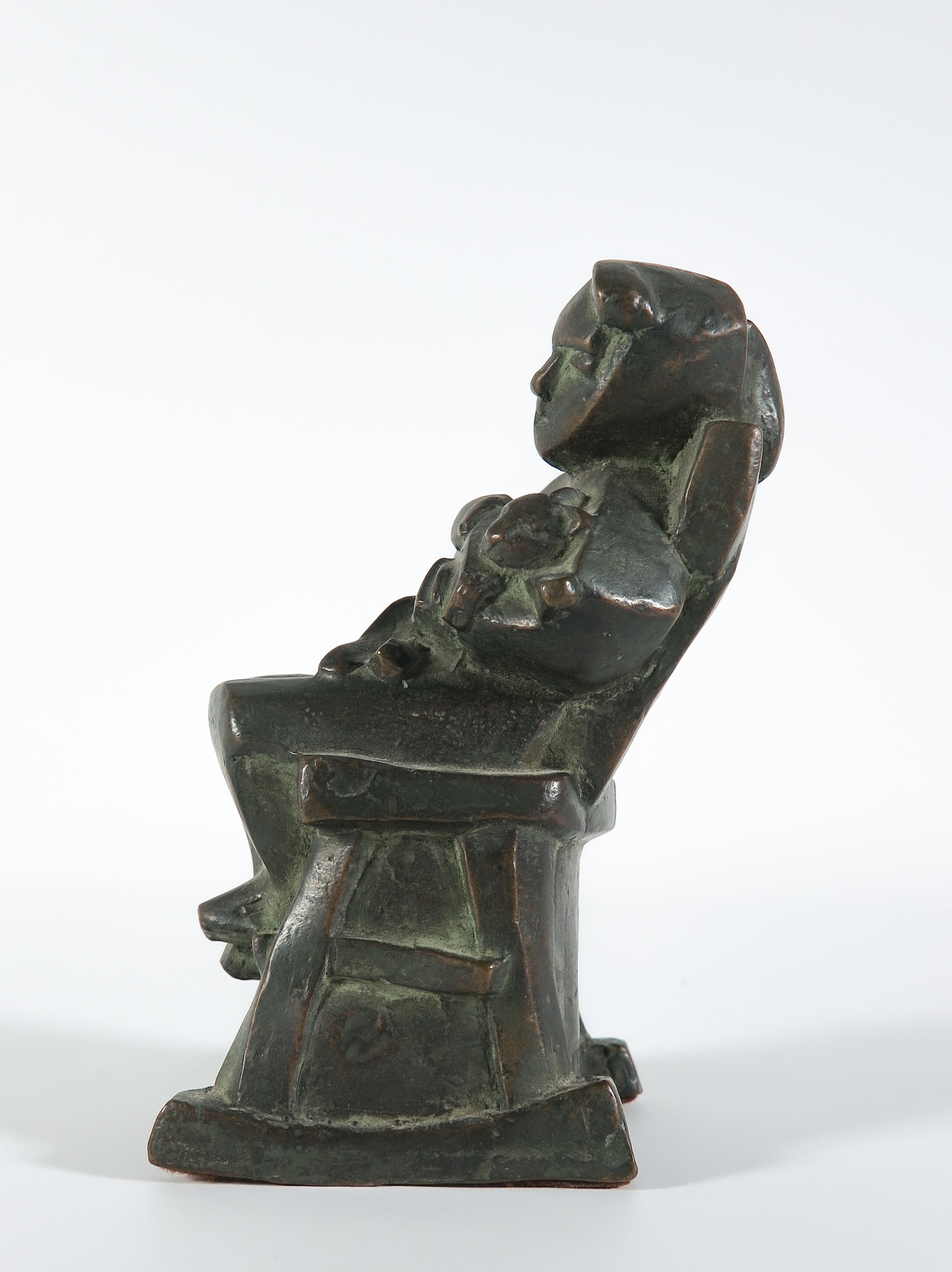 Aandoenlijk modern uitgevoerd bronzen beeldje van een zittend meisje met kat. Aan de achterzijde voorzien van monogram-stempel.