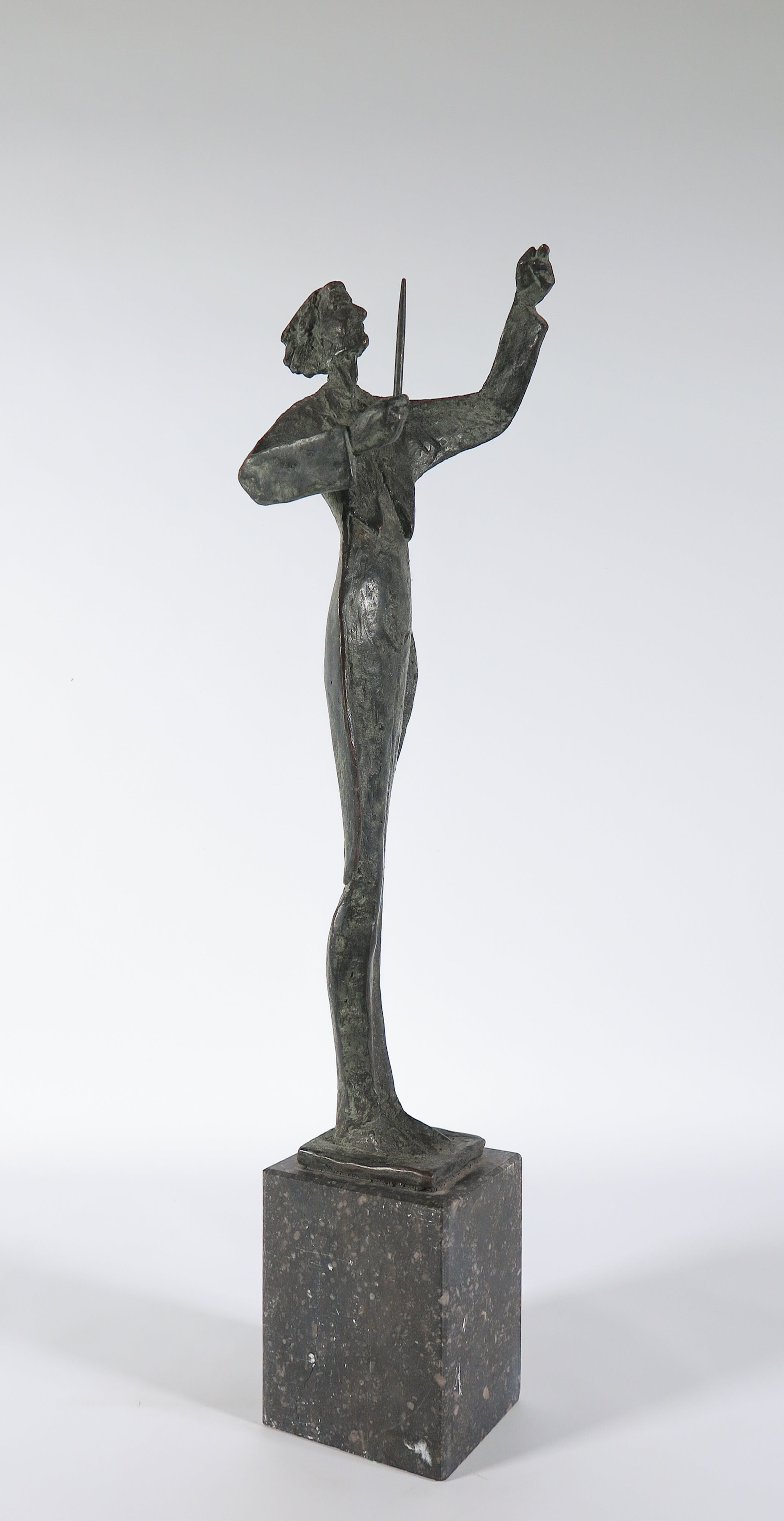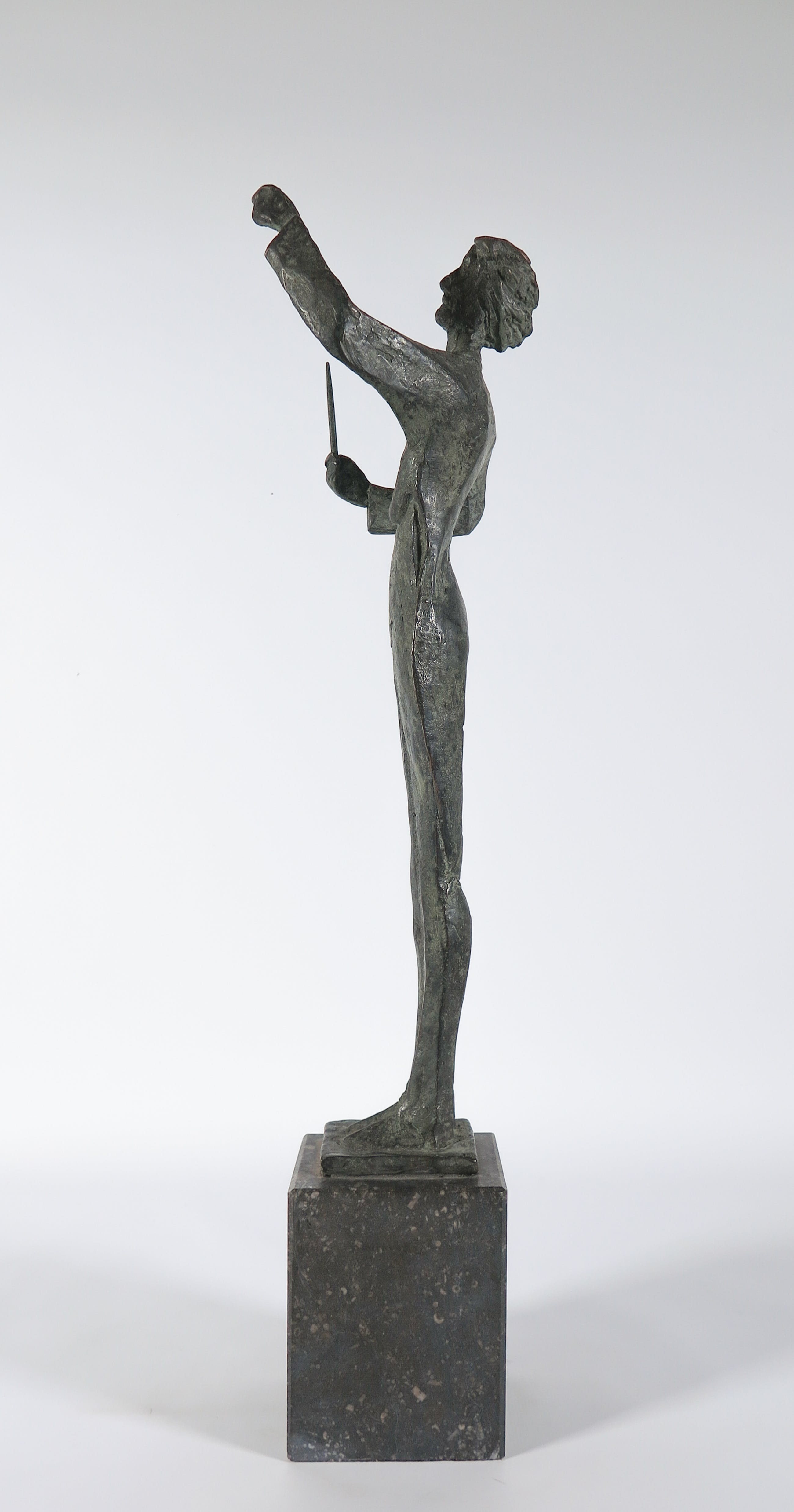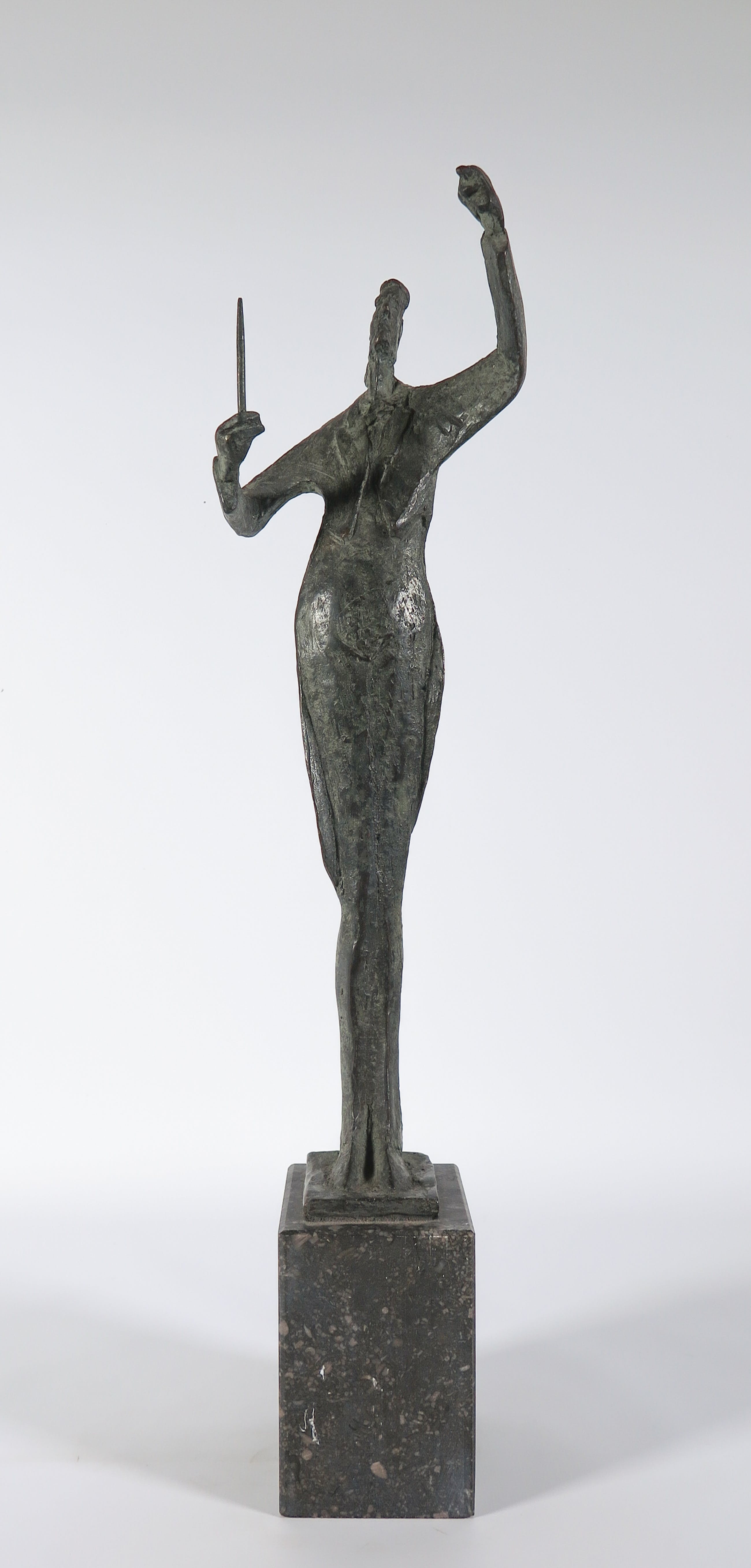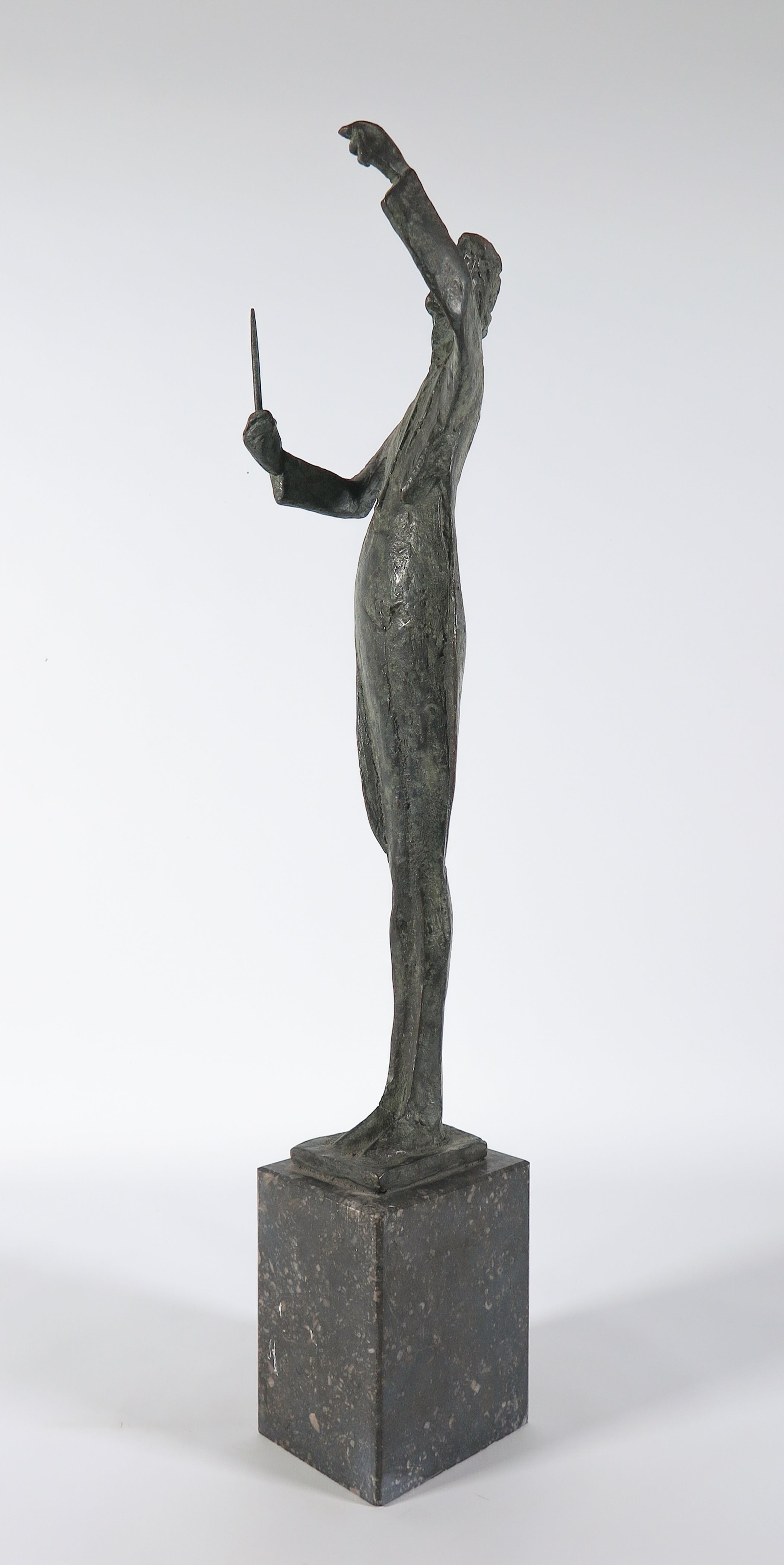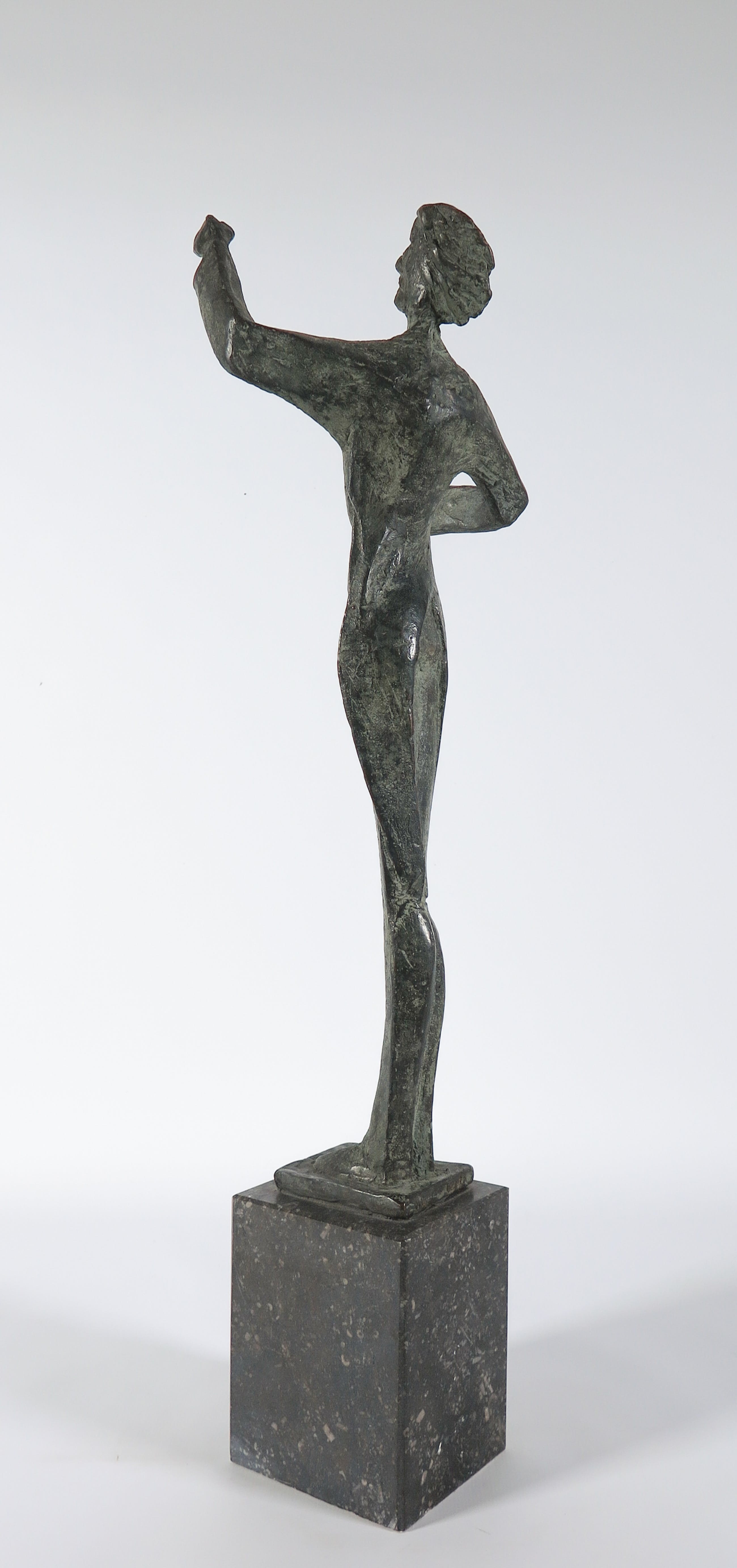 Lang en sierlijk uitgevoerd bronzen beeld met dun lichaam en smal hoofd. Langs de onderste rand in het brons voorzien van initialen en oplagenummer.