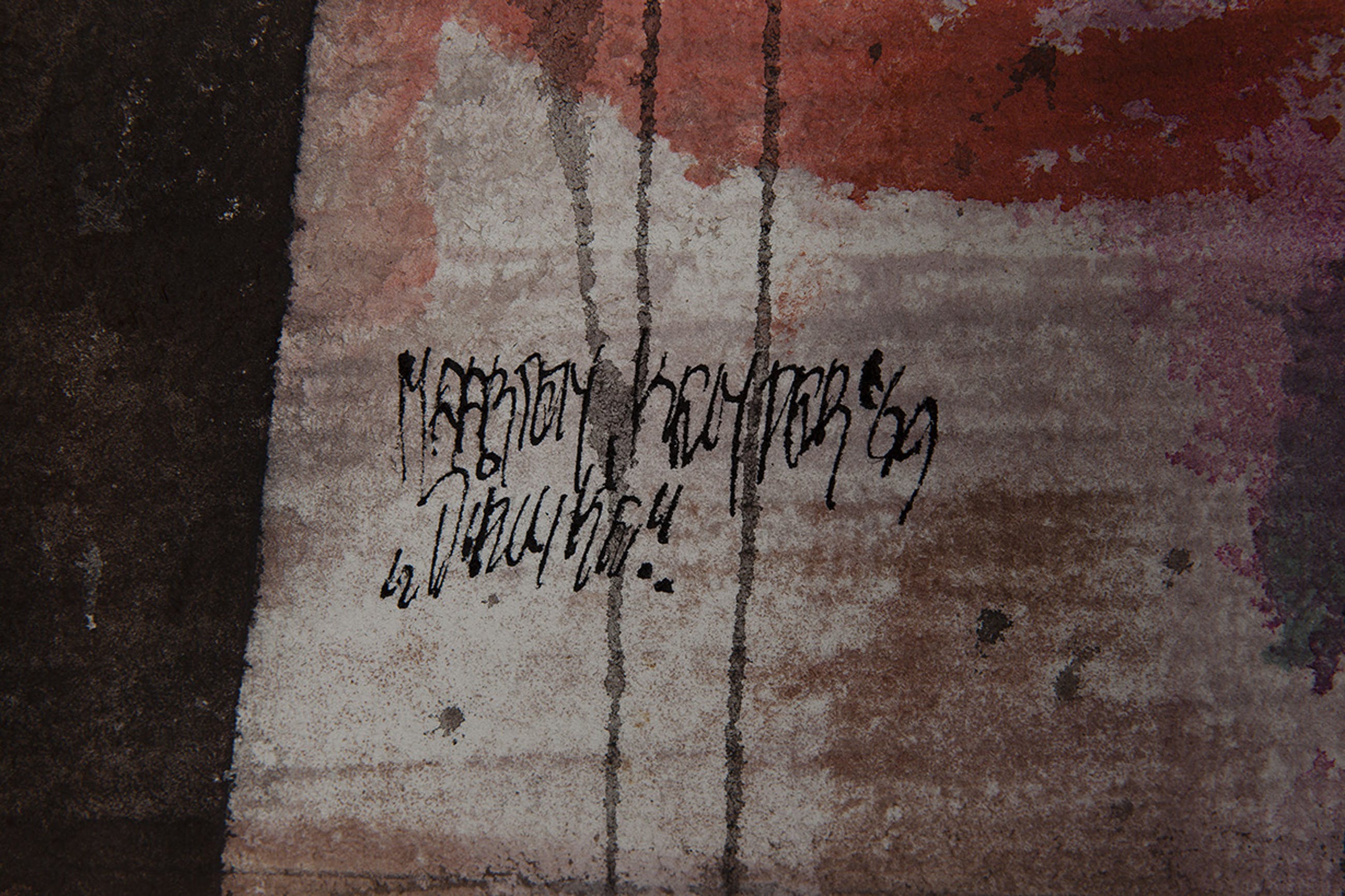 | De achterzijde van de vezelplaat is beschilderd en wat overschilderd, met een negatieve afdruk van een verwijderd label. | |