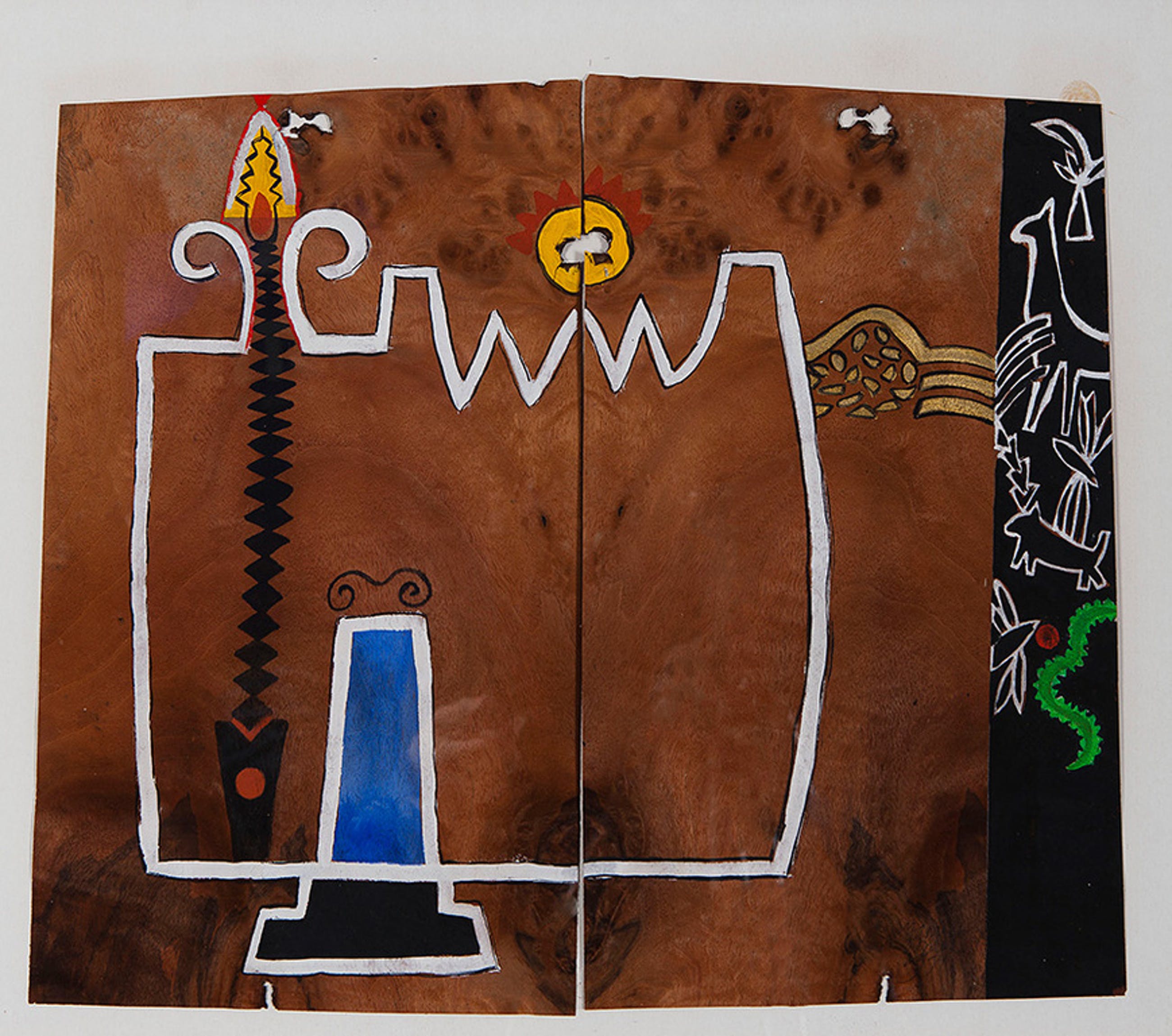 Het werk is opmerkelijk geschilderd op twee gespiegelde bladen fineer voor een karakteristiek effect. De bladen zijn enigszins verzakt in de lijst doordat de lijn in bovenhoeken wat hebben losgelaten, verder in goede staat.
