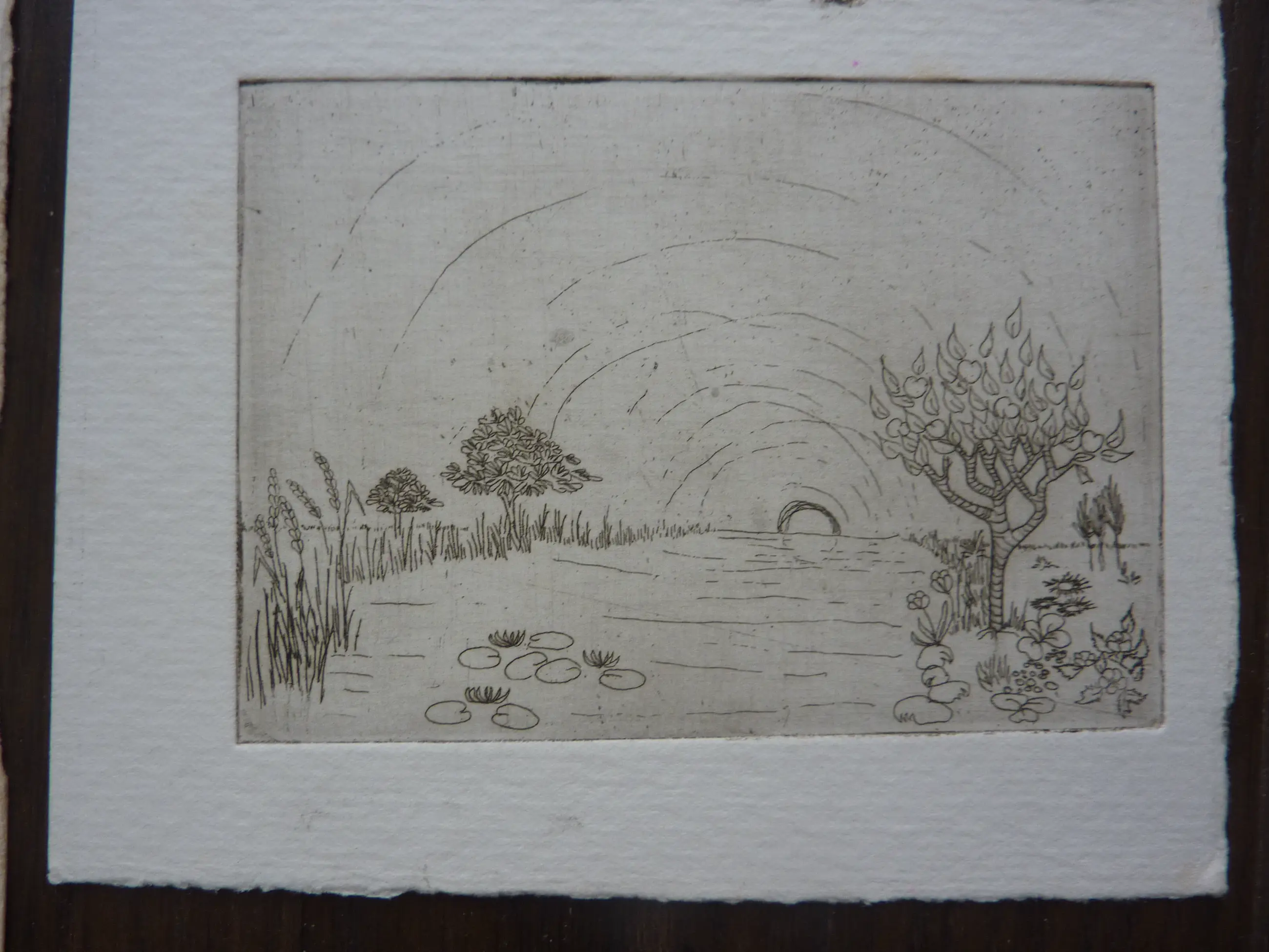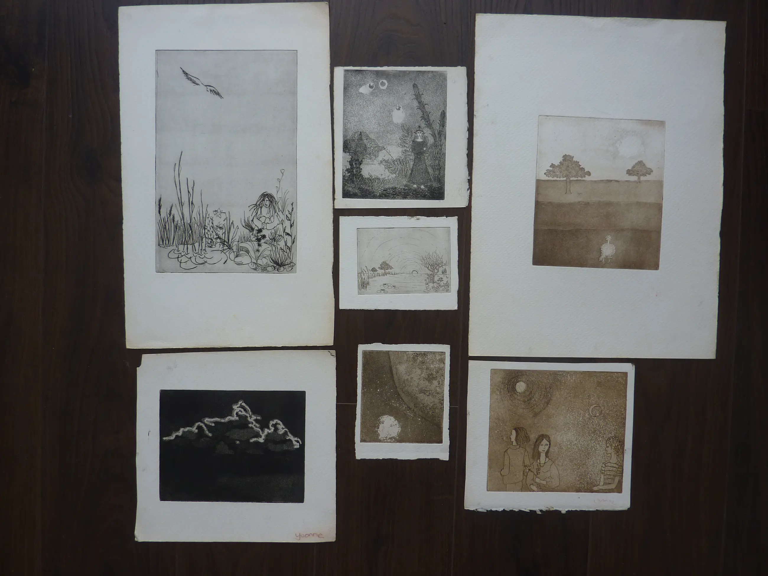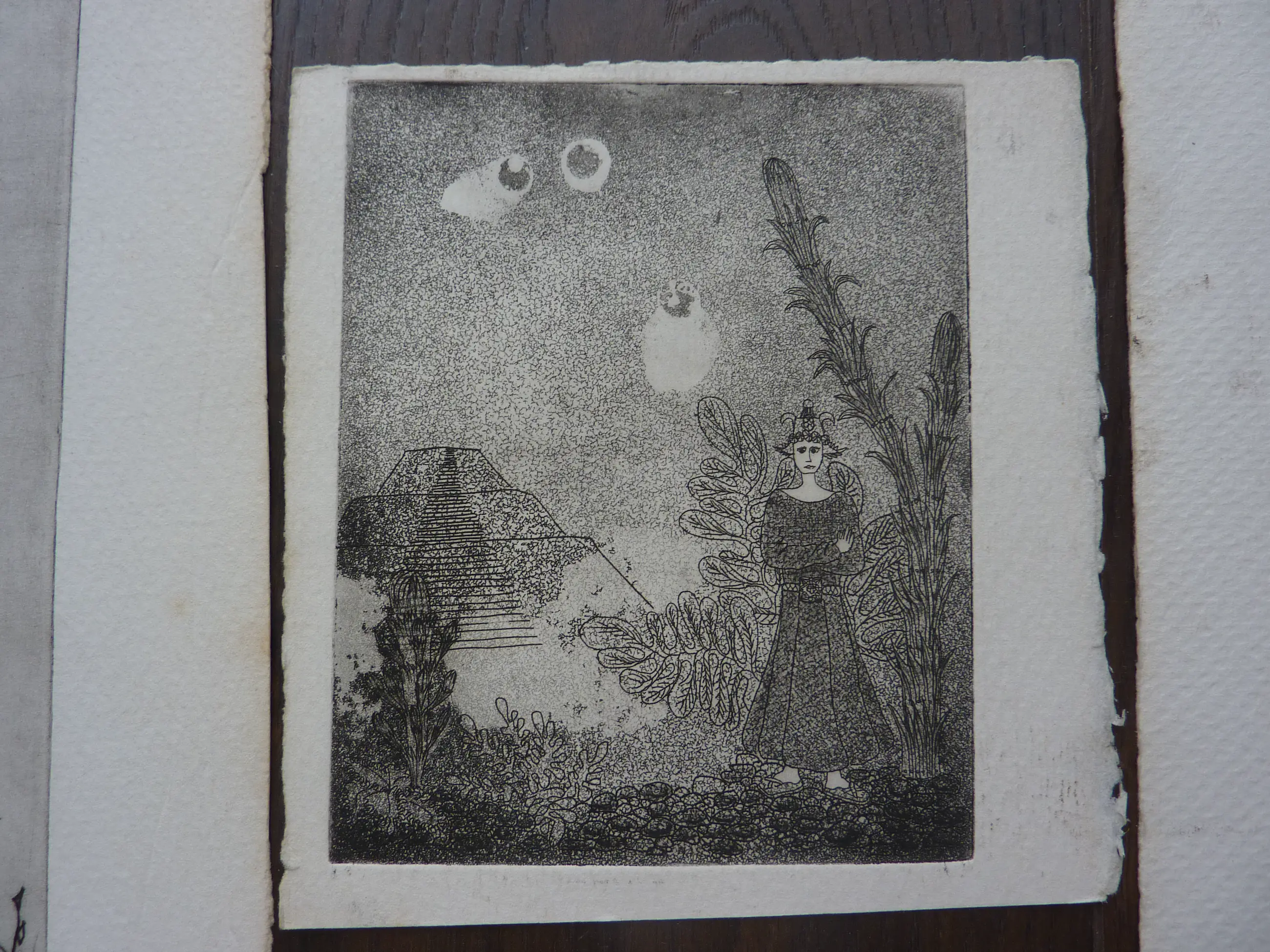 vrouw bij oever, vreemde figuren, bomen, aarde en planeet, waterlandschap en wolken in landschappen. Grootste ets / passepartout is 38x28 cm. De passepartouts hebben gebruikers/makerssporen en vegen.