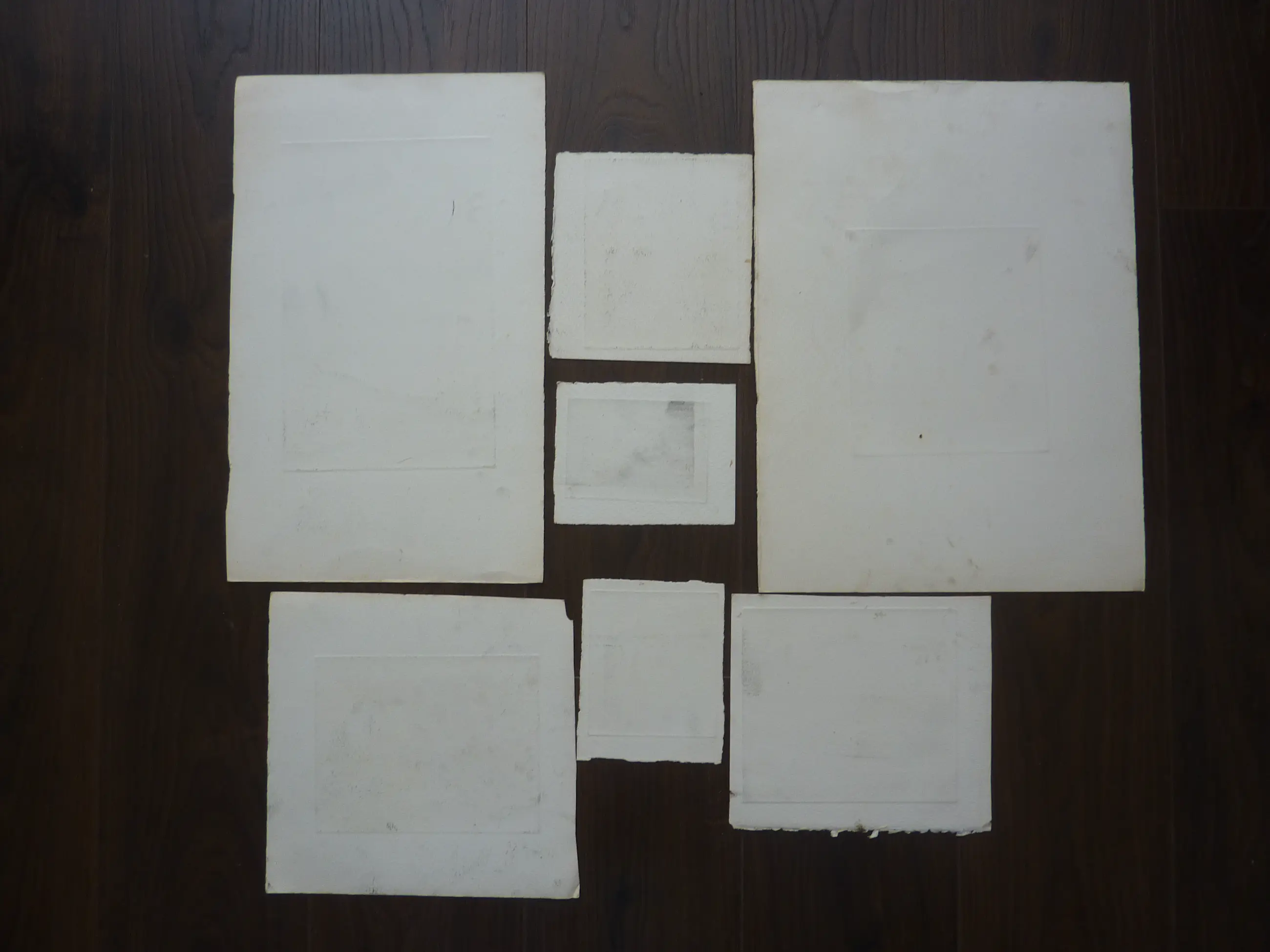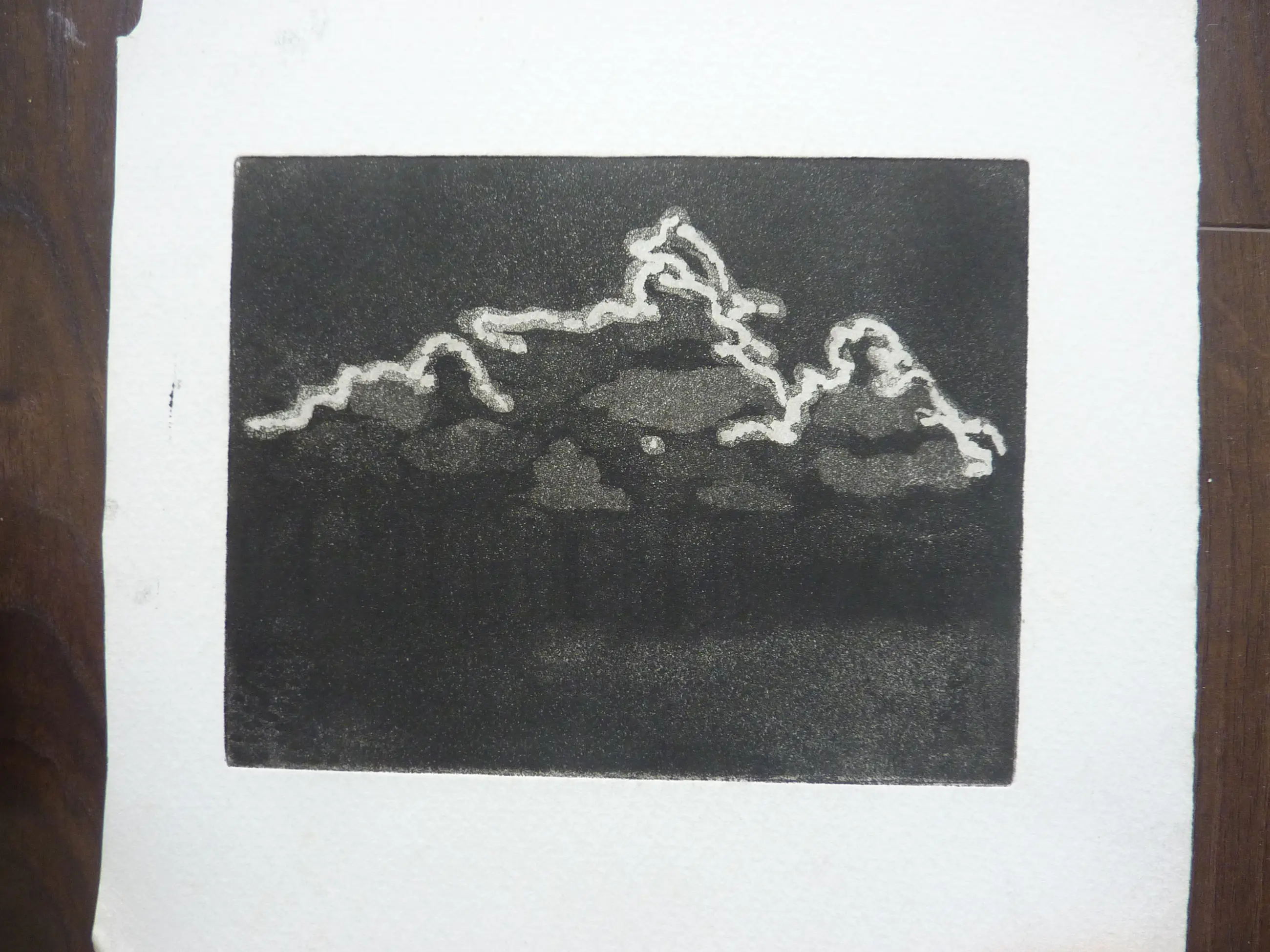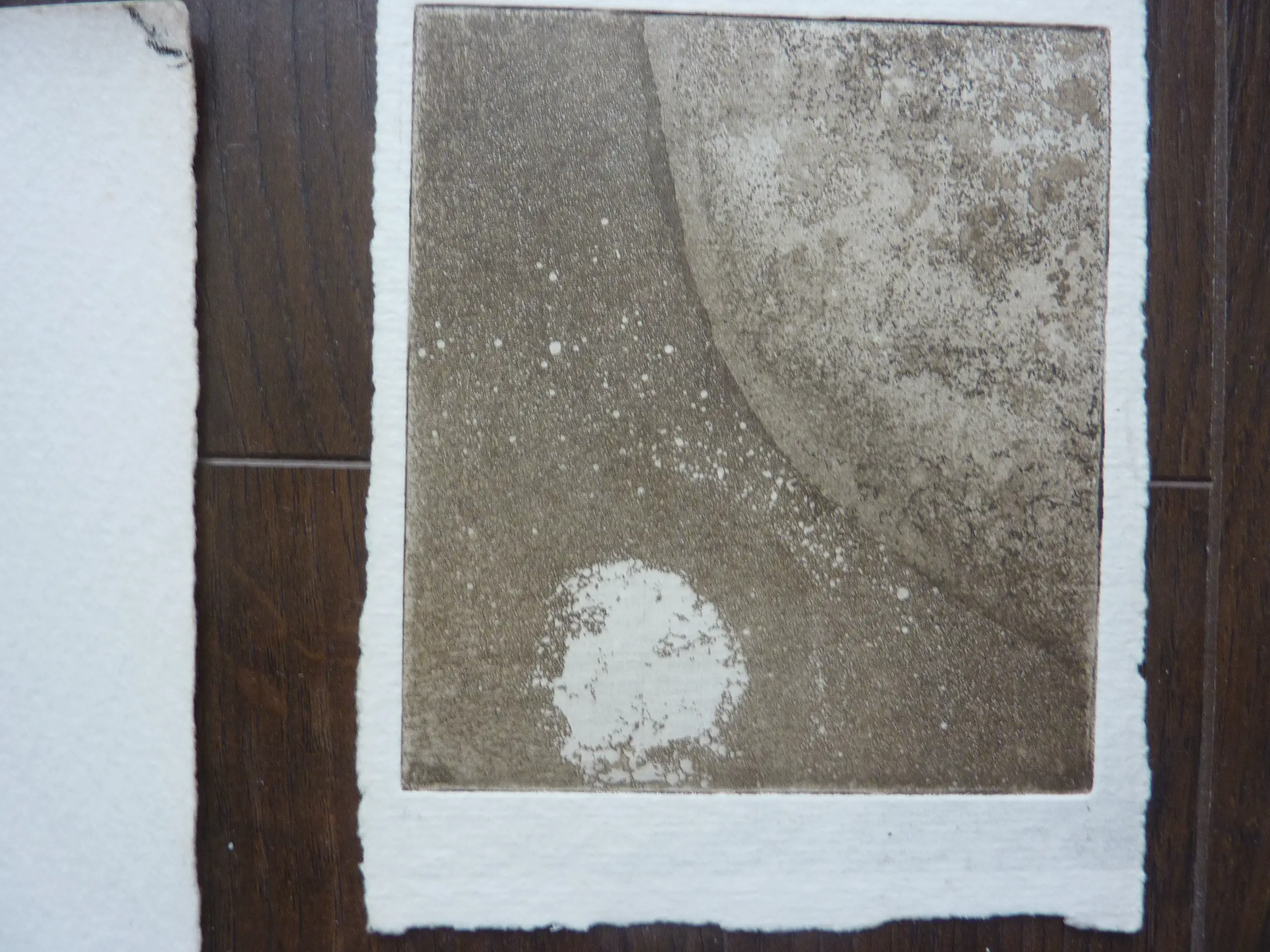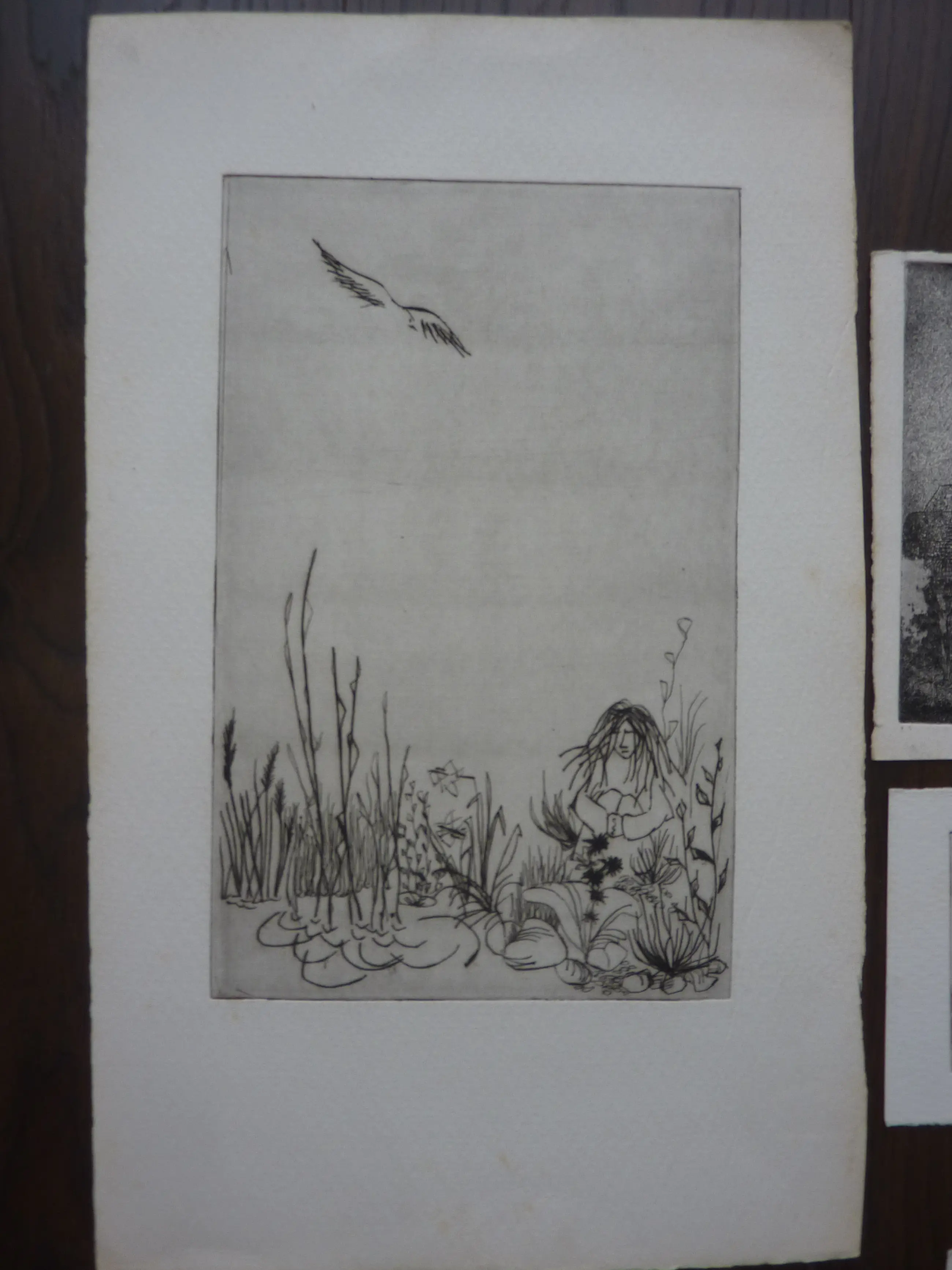 vrouw bij oever, vreemde figuren, bomen, aarde en planeet, waterlandschap en wolken in landschappen. Grootste ets / passepartout is 38x28 cm. De passepartouts hebben gebruikers/makerssporen en vegen.