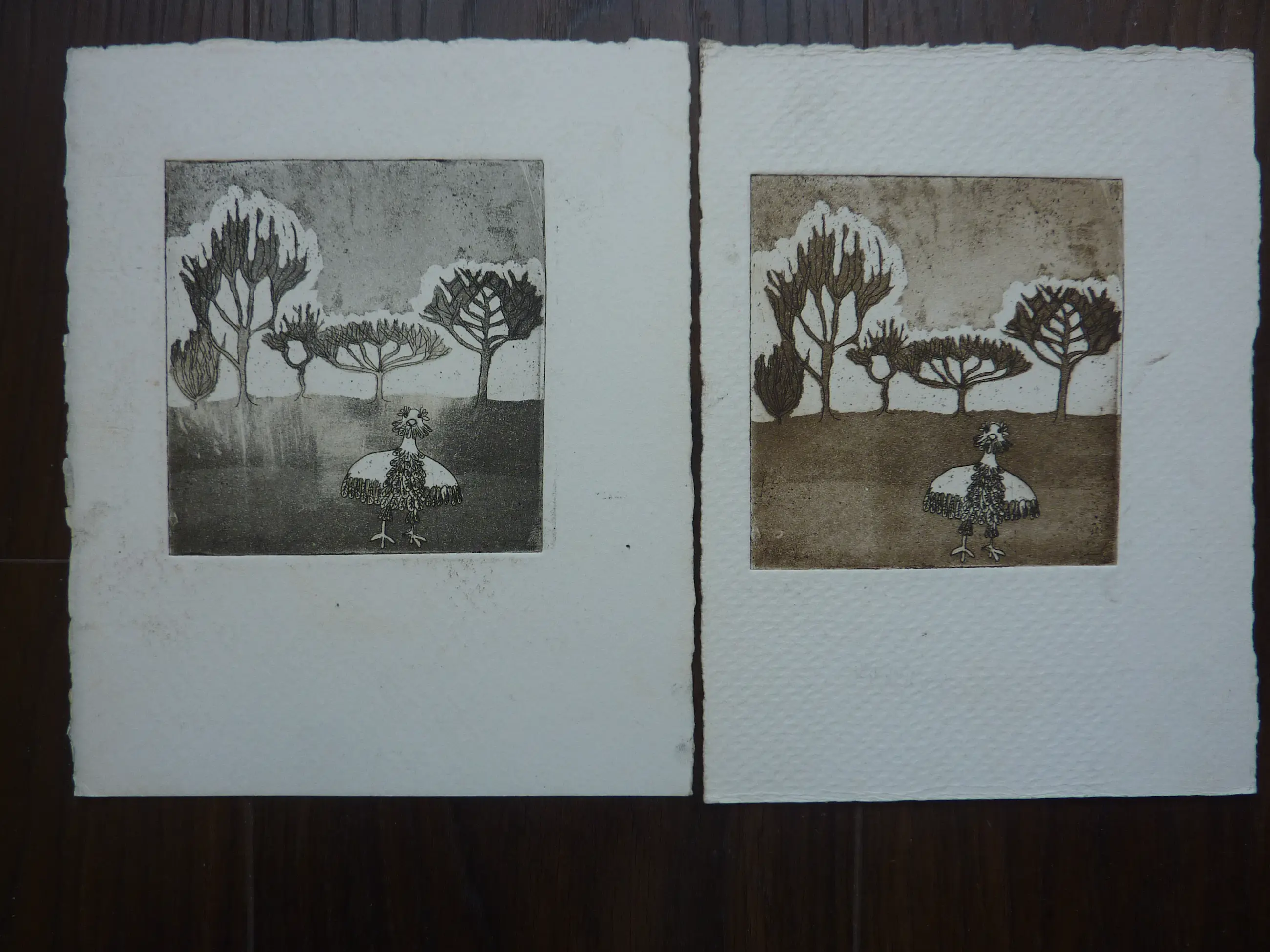 grafisch vormgever en is later gaan schilderen. Etsen stammen uit de periode van de kunstacademie. Afmeting van passe-partout staat vermeld; ets zelf meet 10 x 9,5 cm.