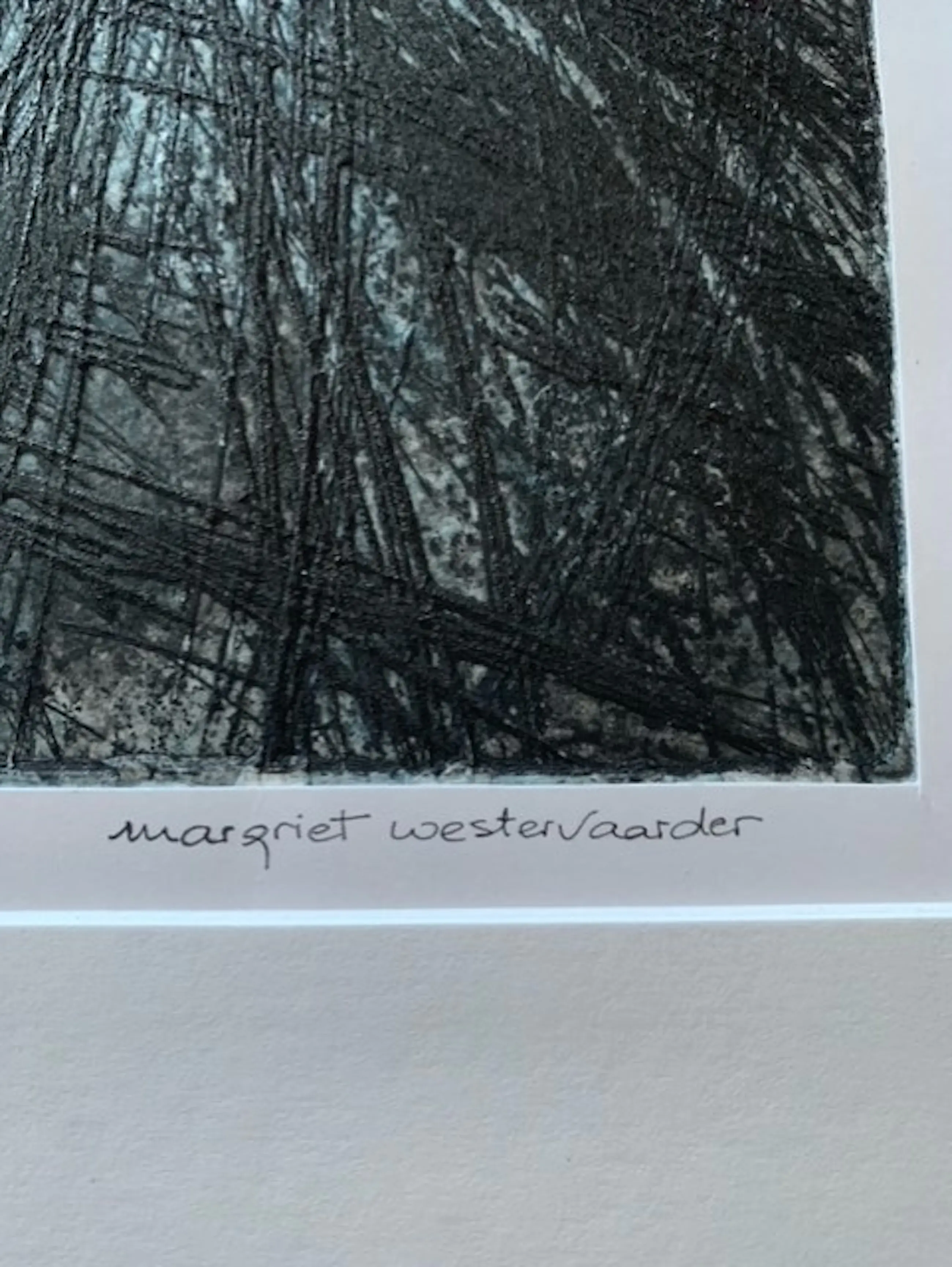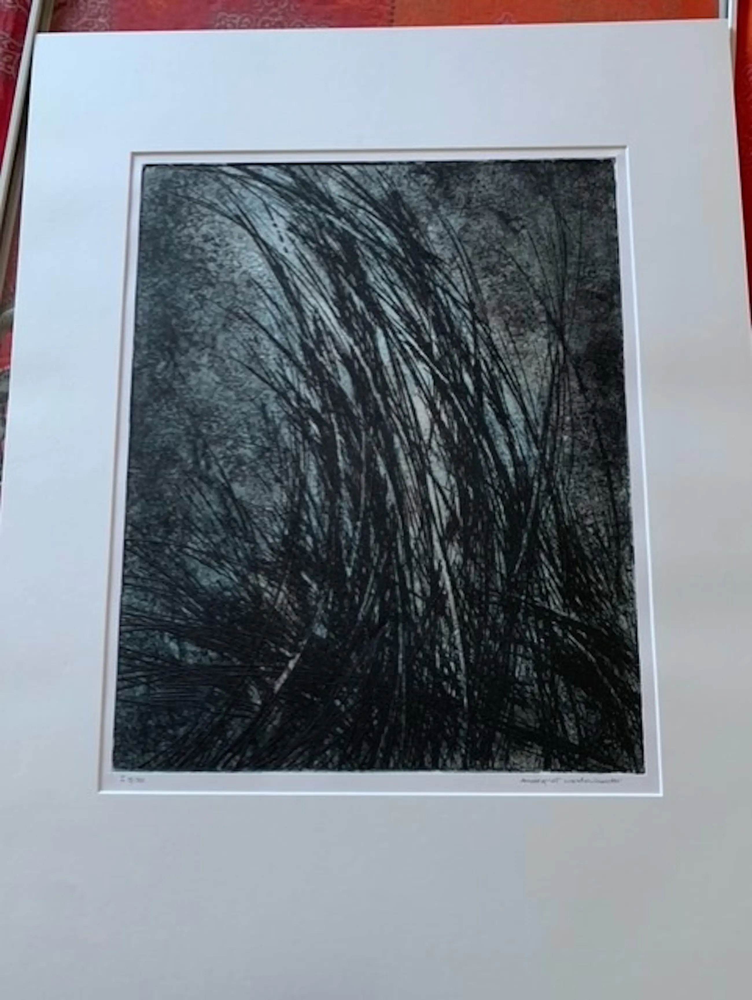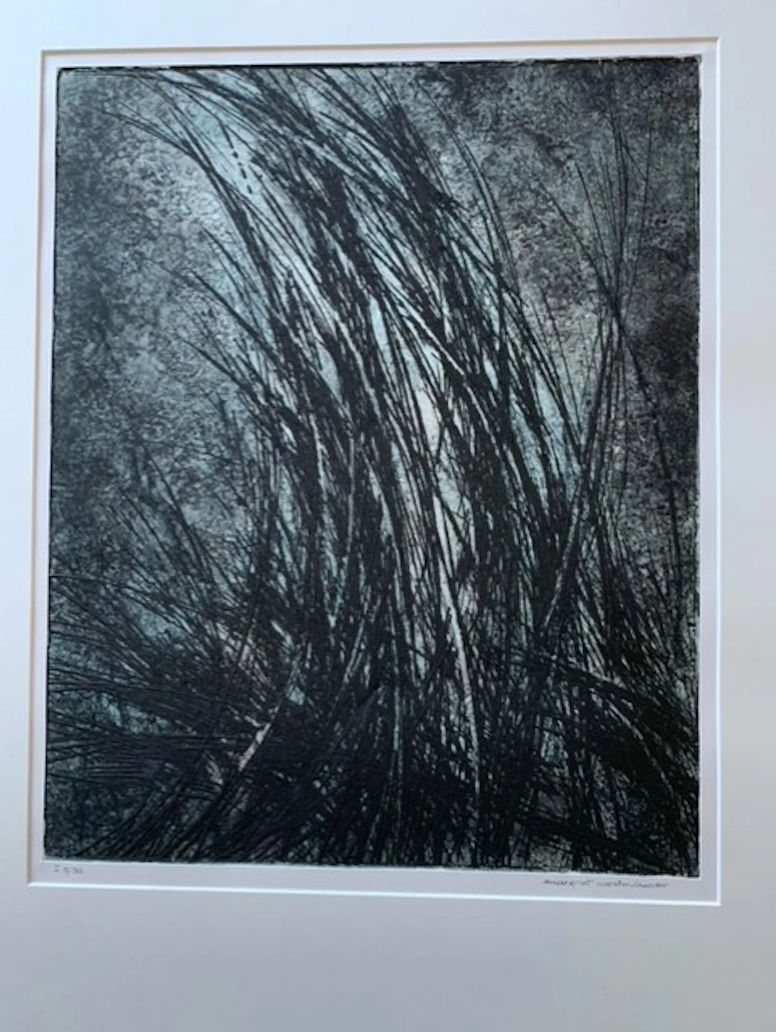 Het is een kleurenets, die Margriet 30 jaar geleden maakte. Zij maakte toen een serie etsen die geïnspireerd waren op gras, grassen. Daarna is Margriet zich gaan richten op mono-prints . Fotografie is voor haar ook belangrijk. Een en ander kan je zien op haar website: www.margrietwestervaarder.nl.
