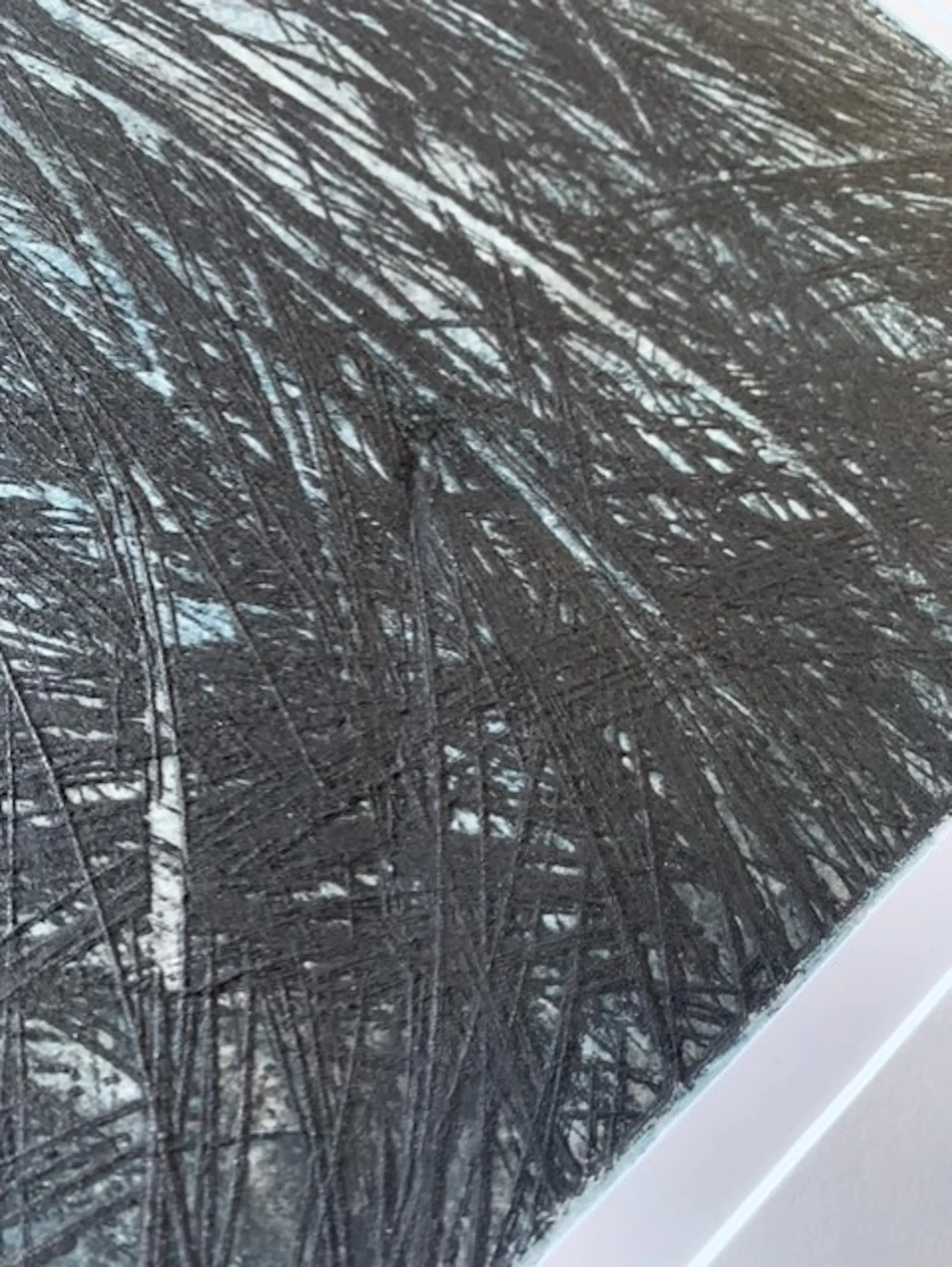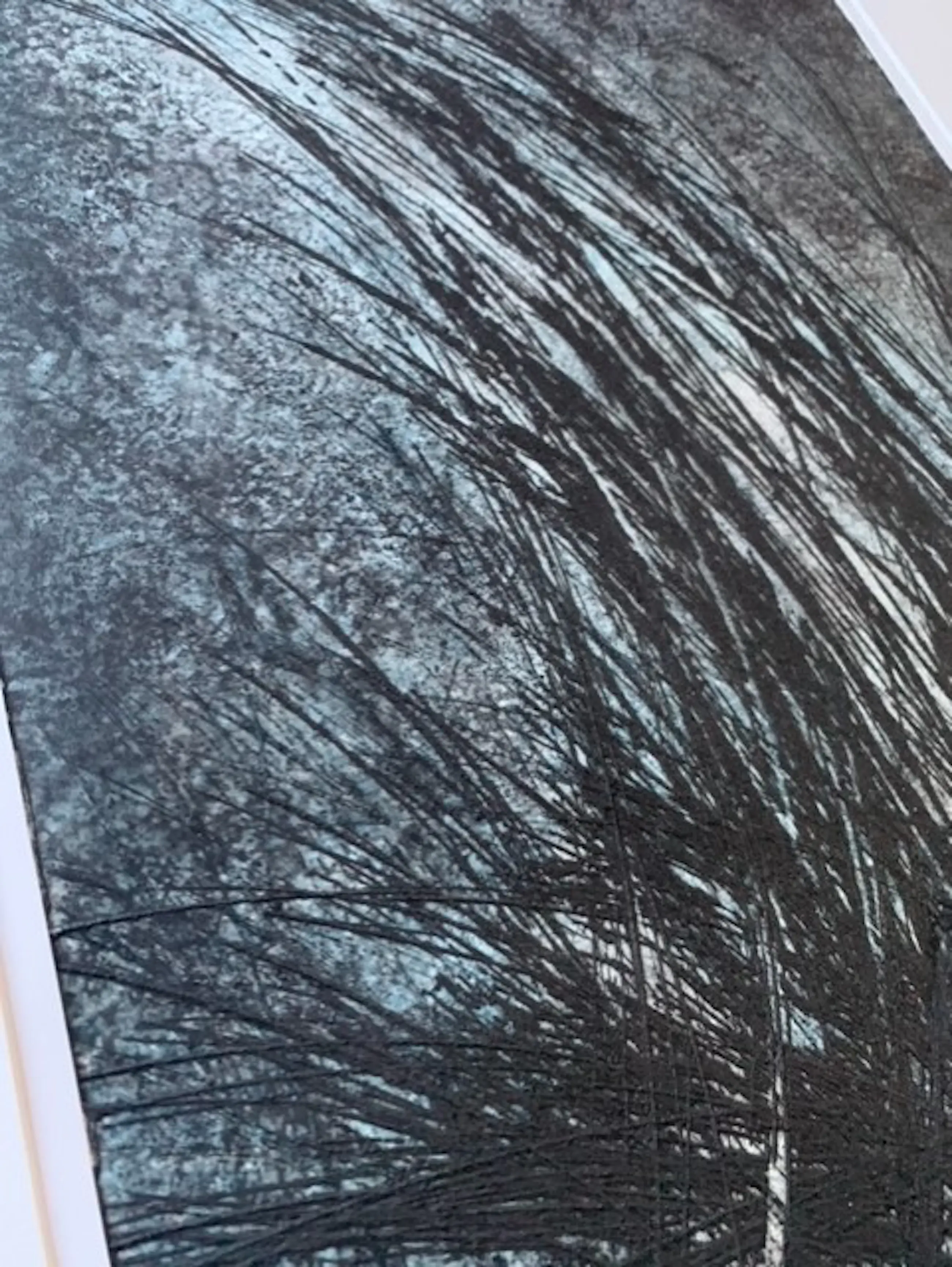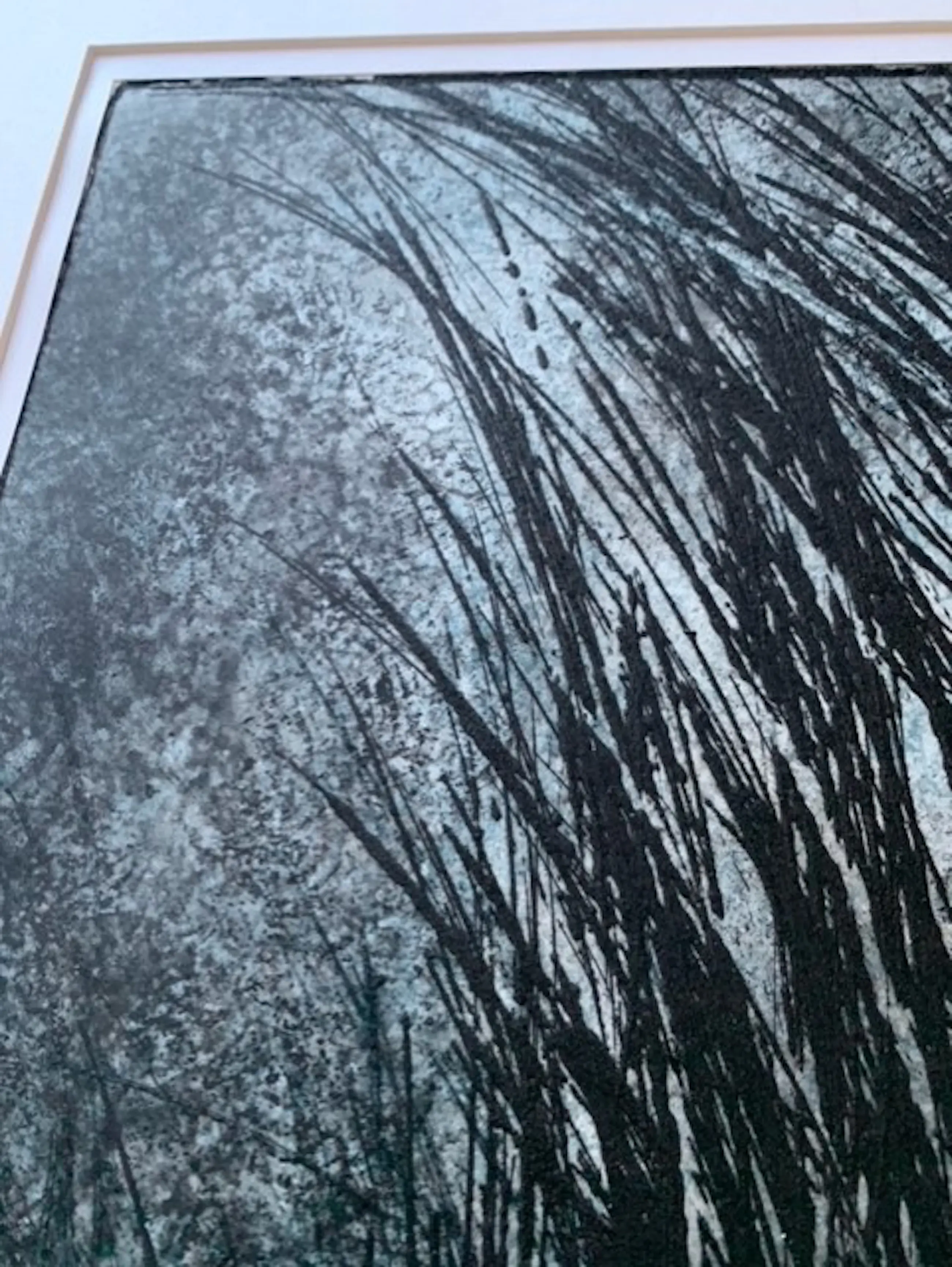 Het is een kleurenets, die Margriet 30 jaar geleden maakte. Zij maakte toen een serie etsen die geïnspireerd waren op gras, grassen. Daarna is Margriet zich gaan richten op mono-prints . Fotografie is voor haar ook belangrijk. Een en ander kan je zien op haar website: www.margrietwestervaarder.nl.