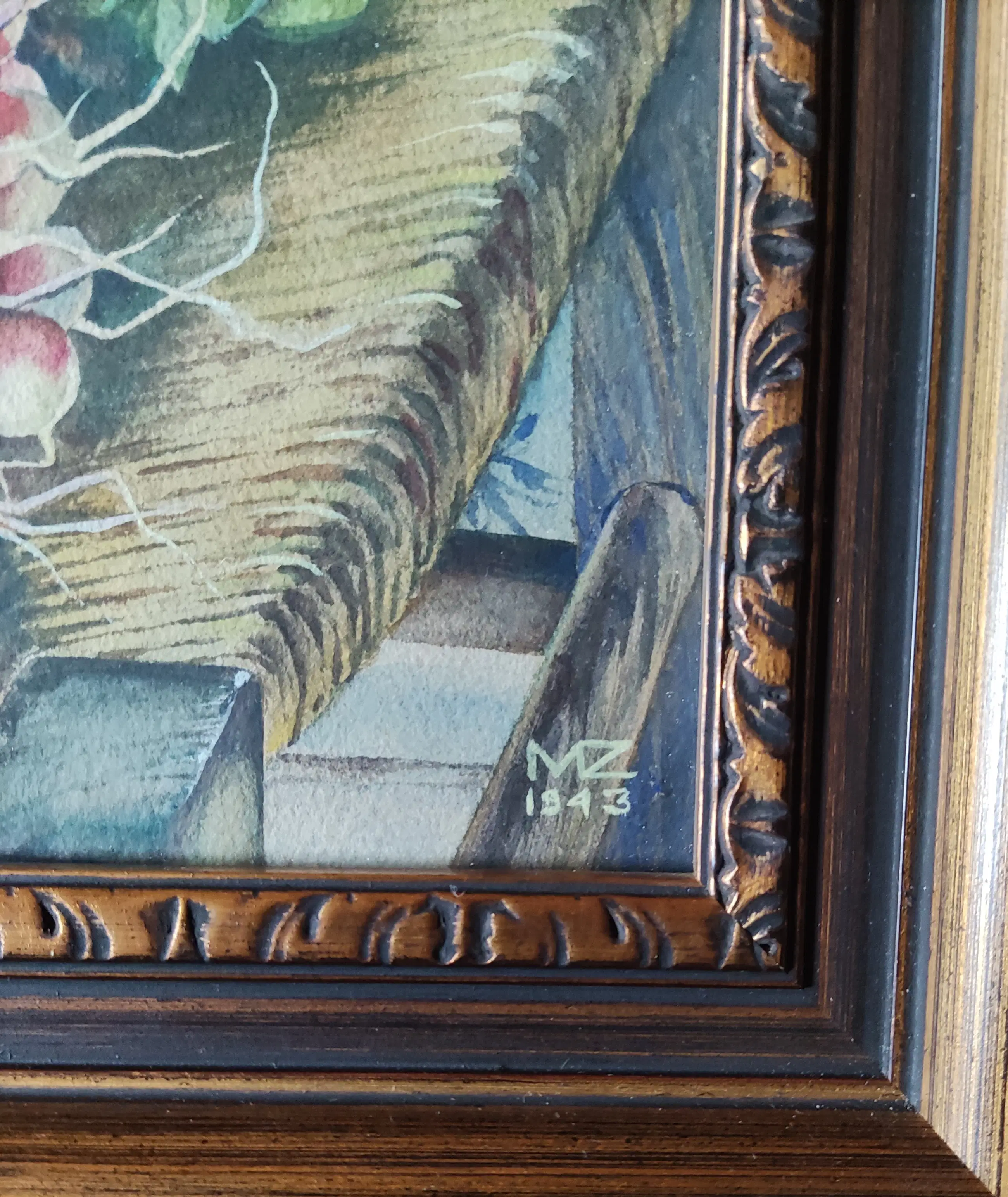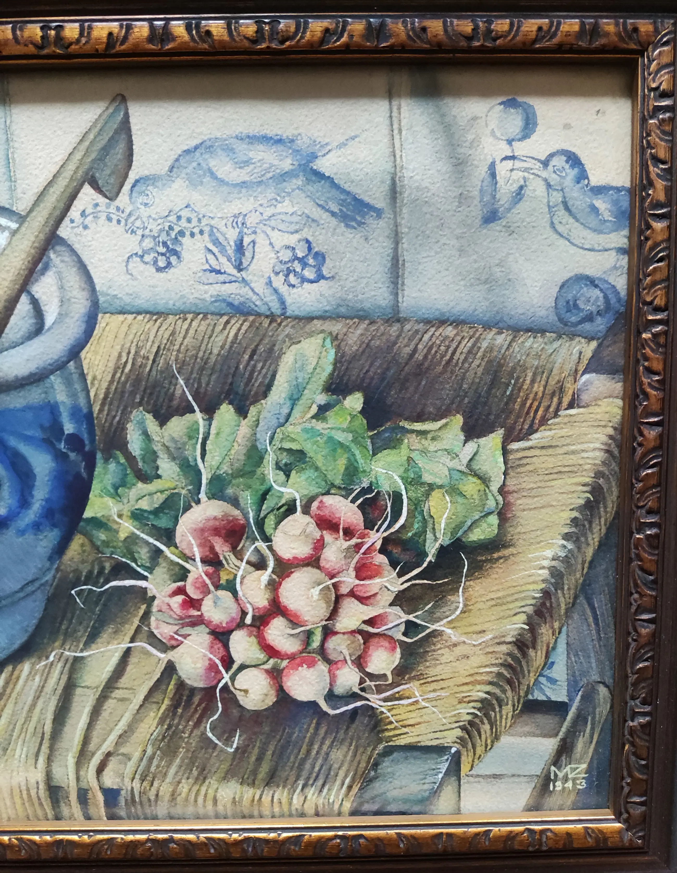 Gesigneerd en gedateerd 1943 rechtsonder. Beeldmaat 24,5x34 cm. Lijstmaat 40x49x5 cm. Marguerite Hynckes-Zahn werd geboren te Utrecht op 7 januari 1897 en overleed te Laren (N-H) in 1978. Trouwde in 1934 met de kunstschilder Raoul Hynckes. Opgeleid aan de Académie de la Grande Chaumière te Parijs en de Rijksacademie voor Beeldende Kunst te Amsterdam. Was werkzaam te Parijs en Amsterdam. Aquarellist en schilder van stillevens en dorpsgezichten. Richting: Realisme. De lijst (met gebruikssporen) wordt gratis meegeleverd.