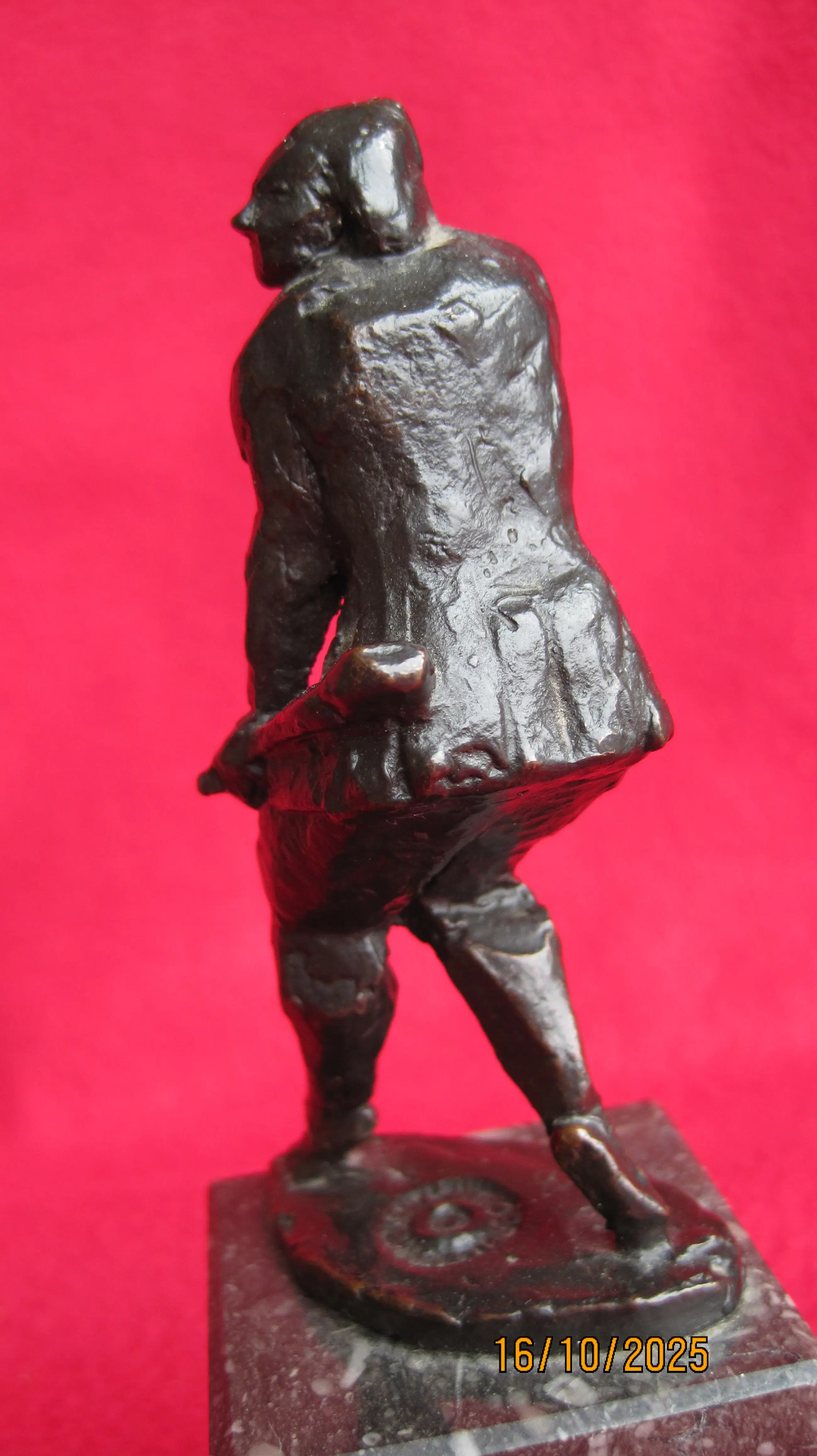 Dit beeldje is van brons en staat op een zwart marmeren sokkel.