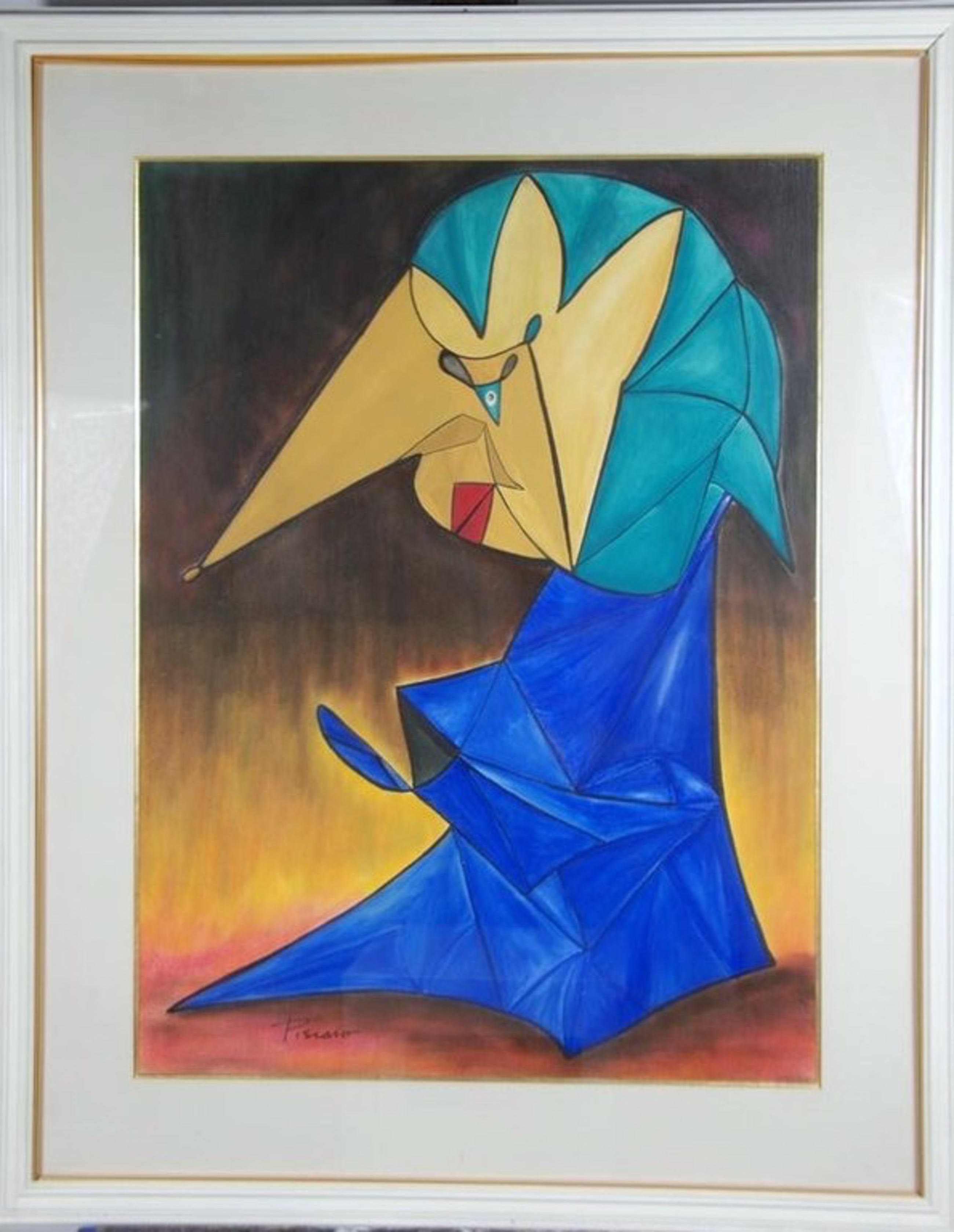 SCHILDERIJ OLIE OP HOUT:DOEK MOOI INGEKADERD VAN MARIA ADELA MONTES (1924-1983) ALIAS PISCARO GETEKEND DOOR DE KUNSTENAAR 73 X 55 BEINVLOED DOOR CHAGALL , KANDINSKY,PICASSO EN MIRO, ZEER DECORATIEF EN EIGENTIJDS