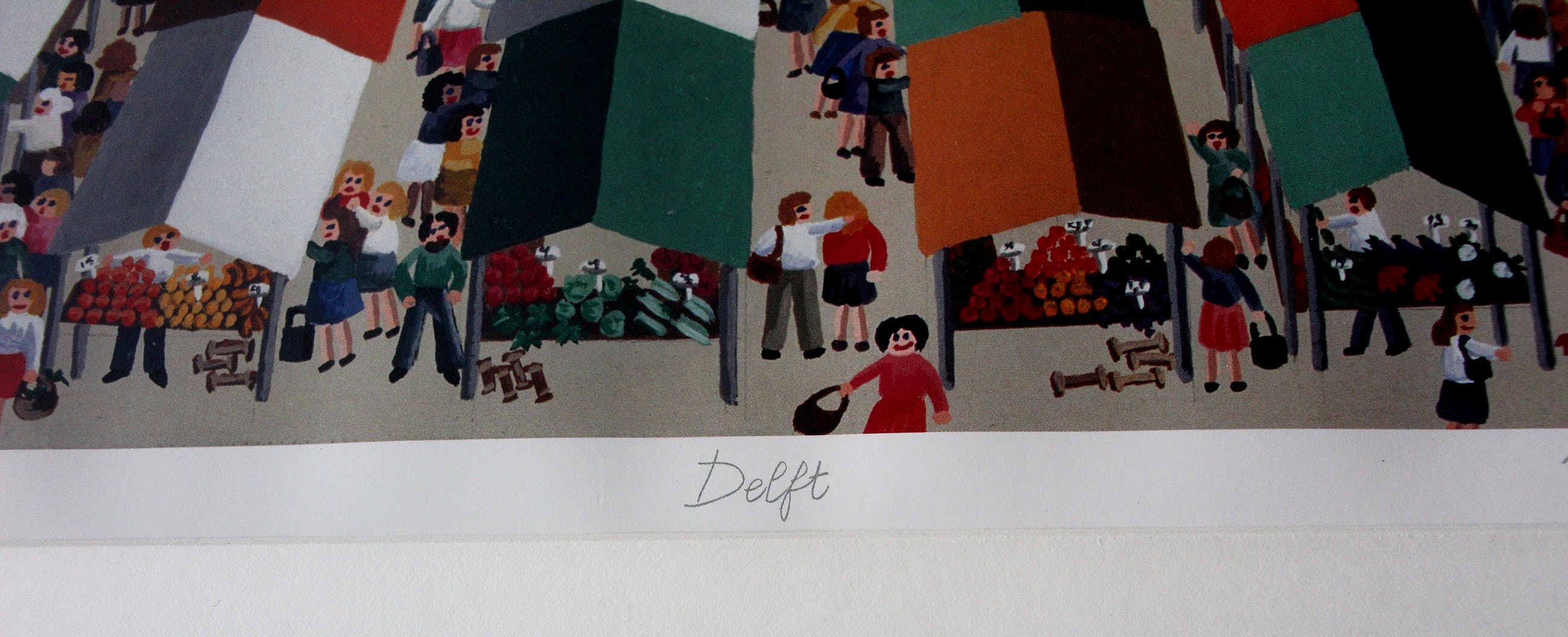 Ingelijste Zeefdruk van Anne Maria Meier. Titel: Delft. Het werk is rechtsonder, met potlood, gesigneerd door de kunstenaar. De authenticiteit van het, aangeboden, werk wordt volledig gegarandeerd. Een certificaat van echtheid kan, op aanvraag, worden gemaild.