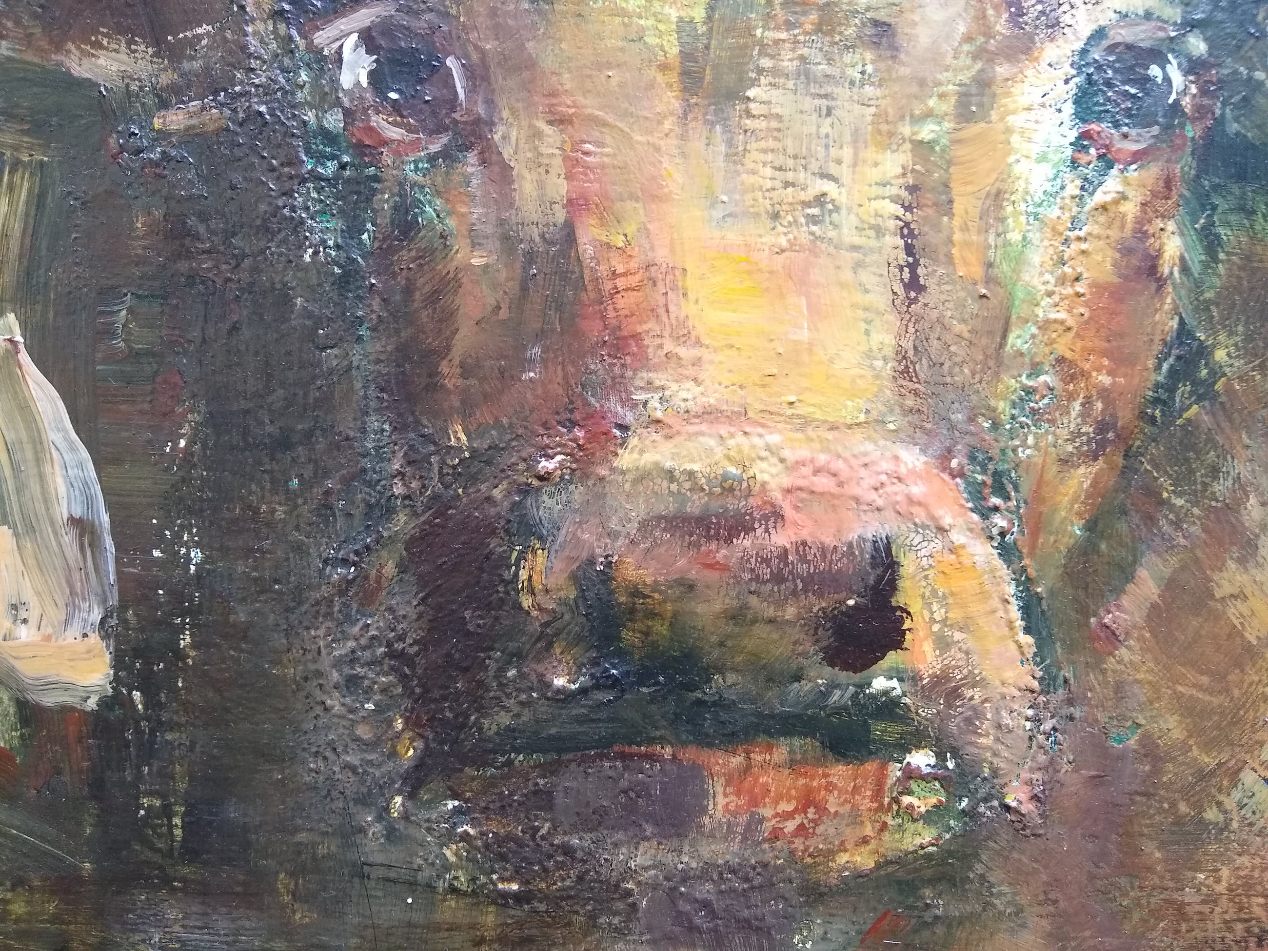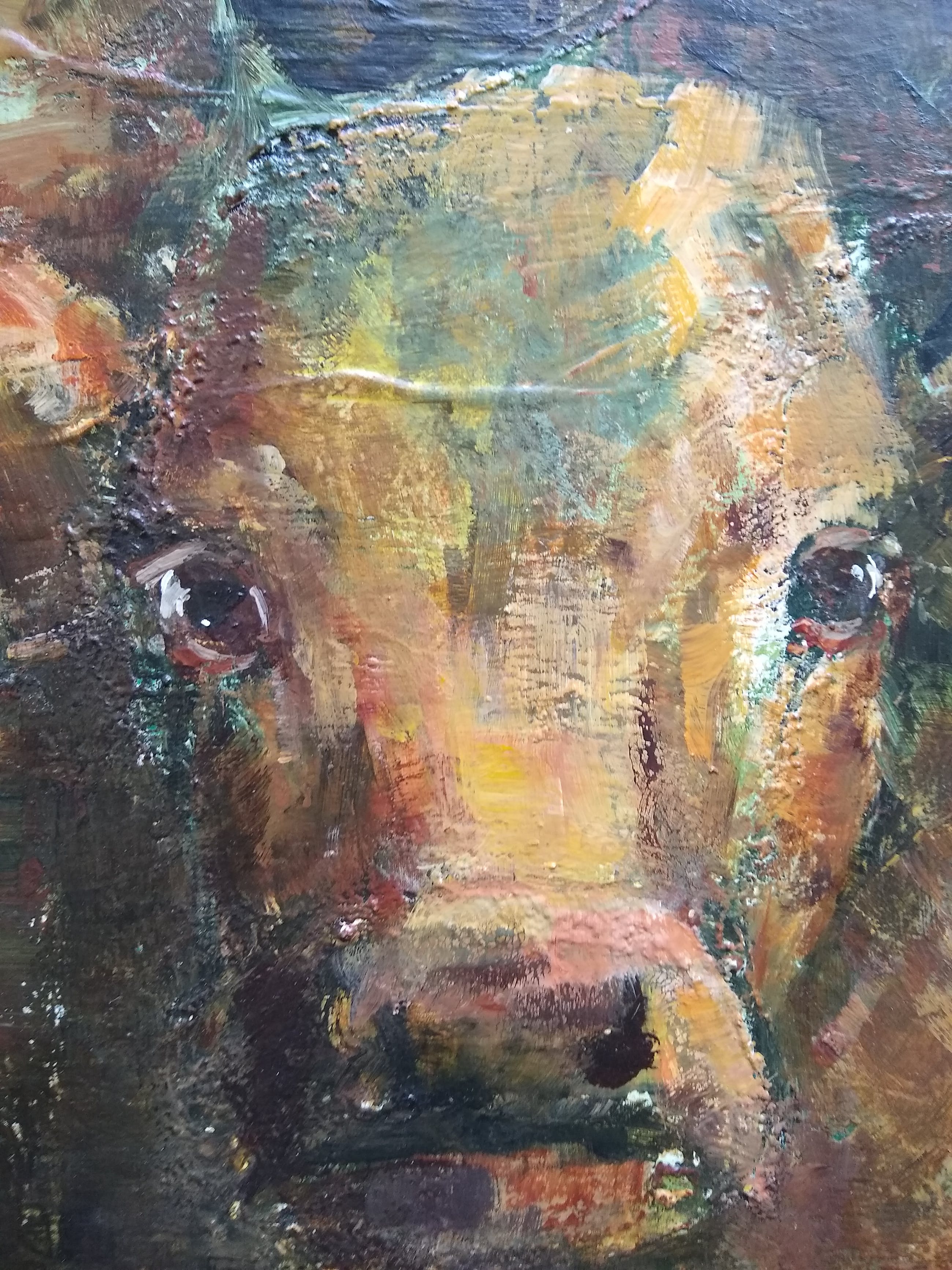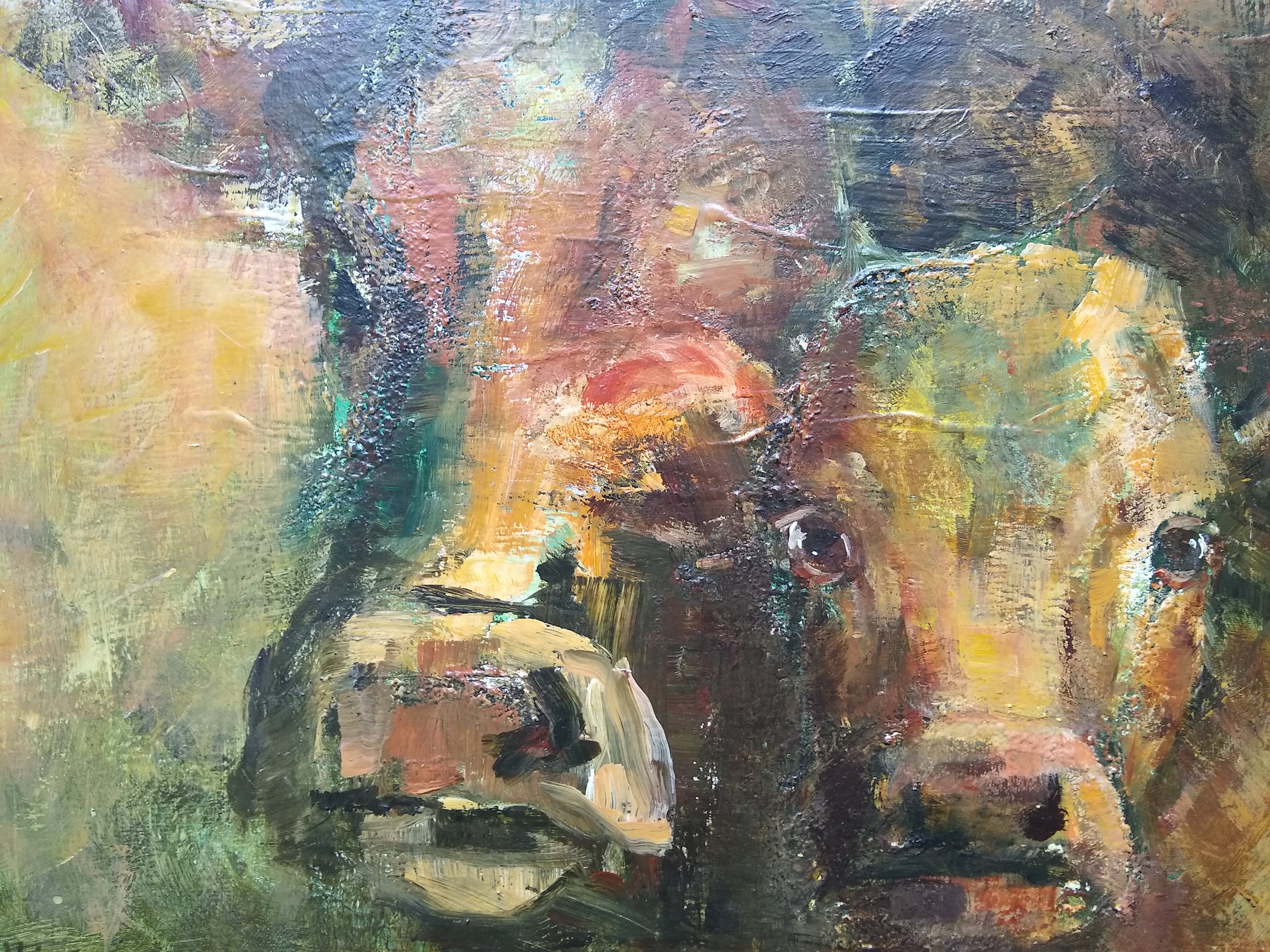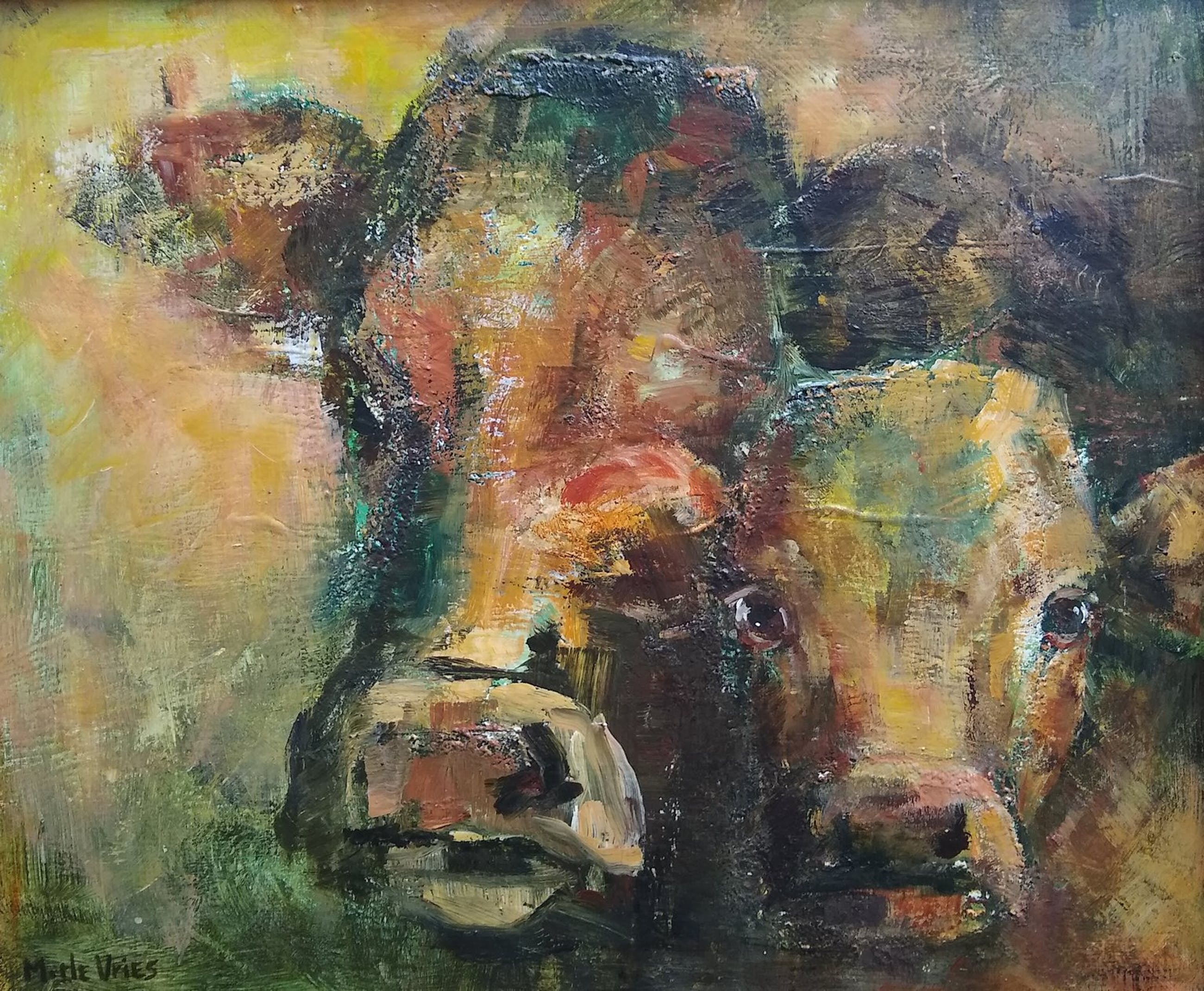 Maria de Vries (Mierlo 1955-). Twee koeien. Olieverf op paneel.
