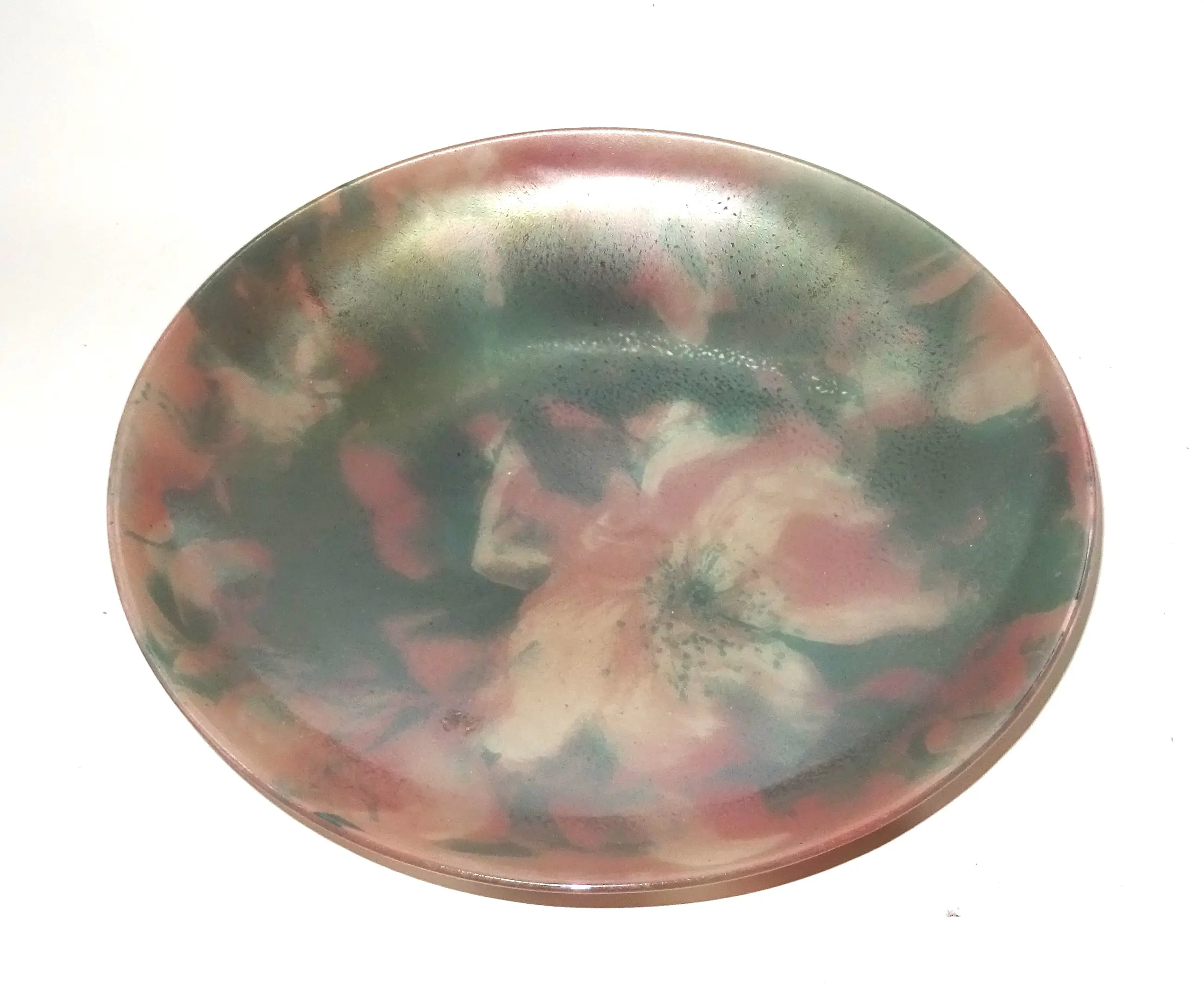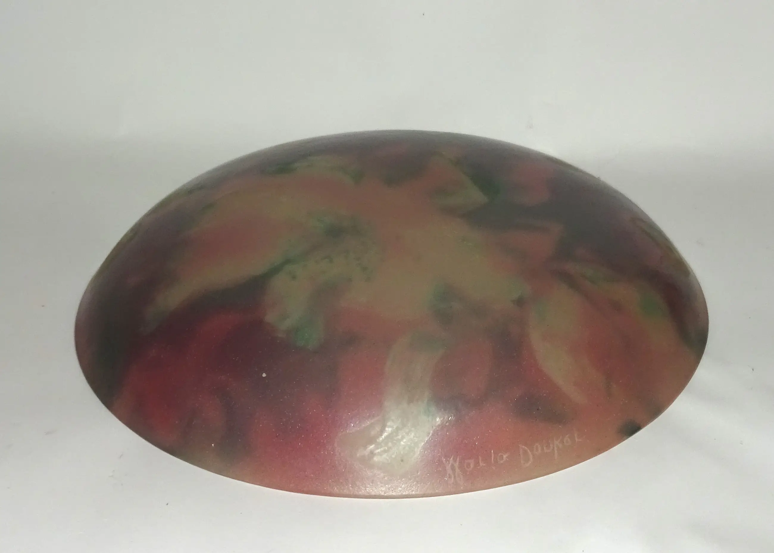 Een glasfusie schaal met kleurvakken en licht iriserende laag. Ontwerp en uitvoering Maria Donker in eigen atelier. Aan de zijkant gesigneerd.