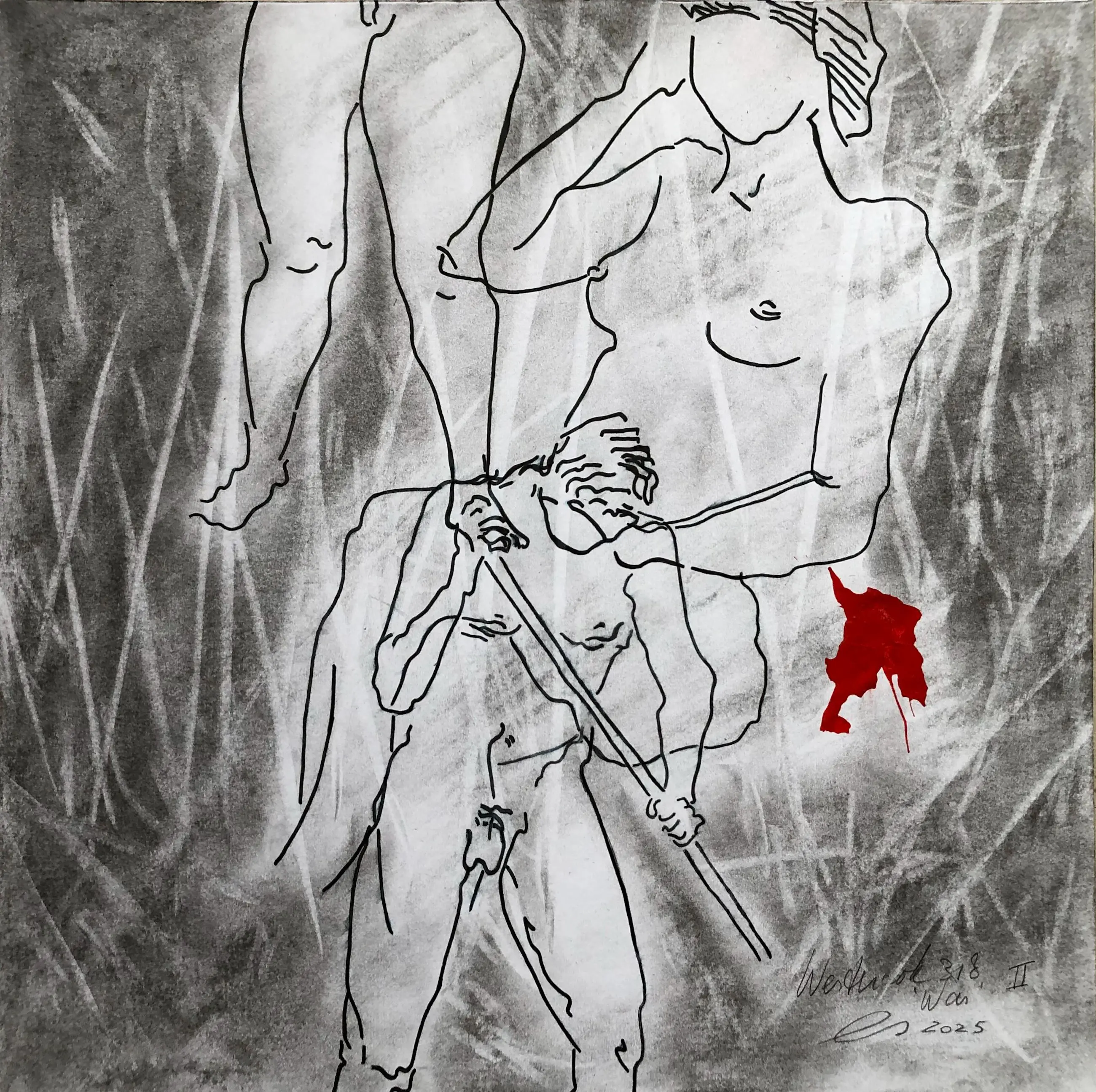 De tekening Westerdok 318 'War I' verwijst expliciet naar de huidige dreiging en oorlogen wereldwijd. De figuren in het werk zijn niet alleen stille getuigen, maar ook actieve dragers van emotie en reflectie.