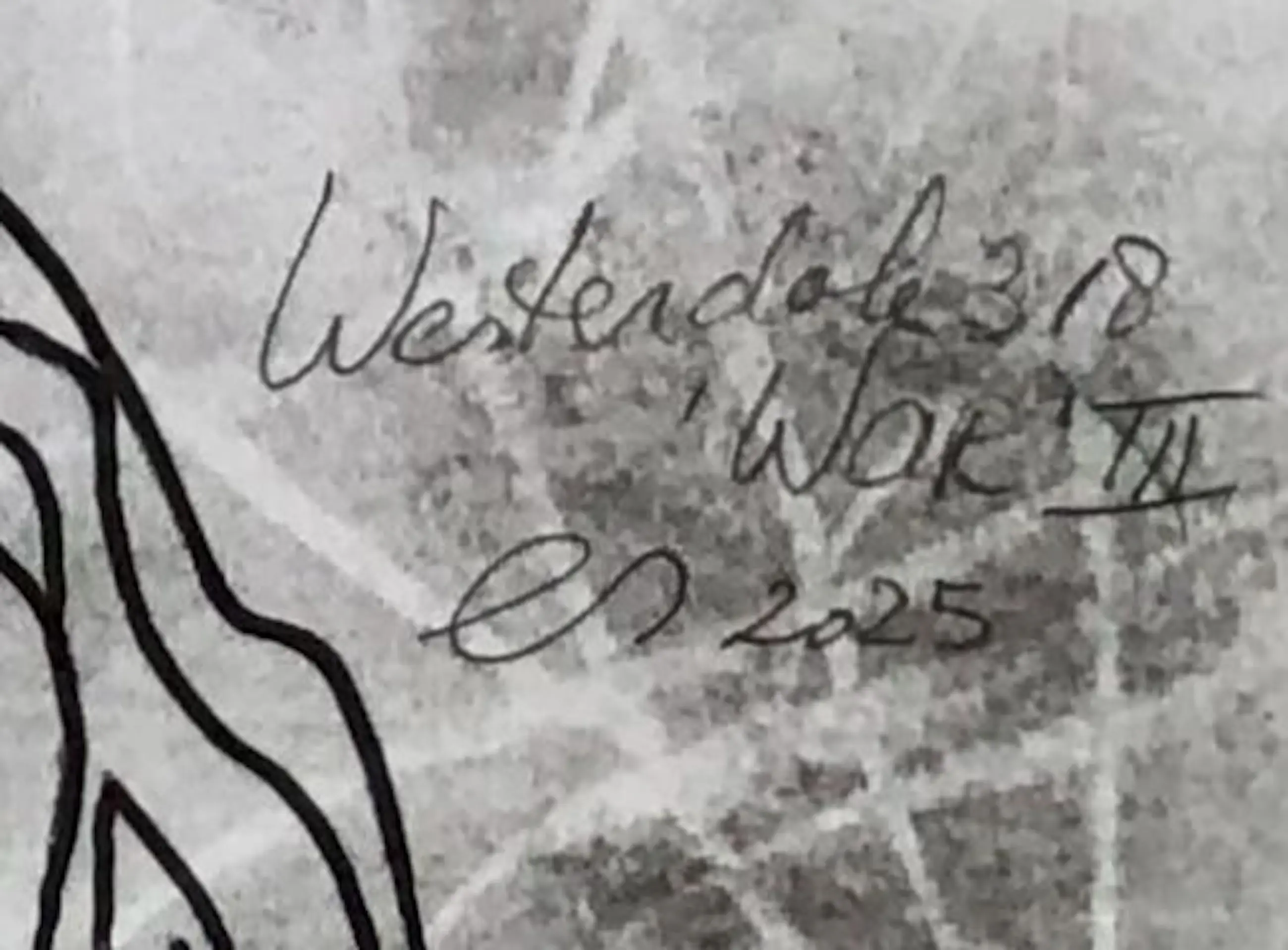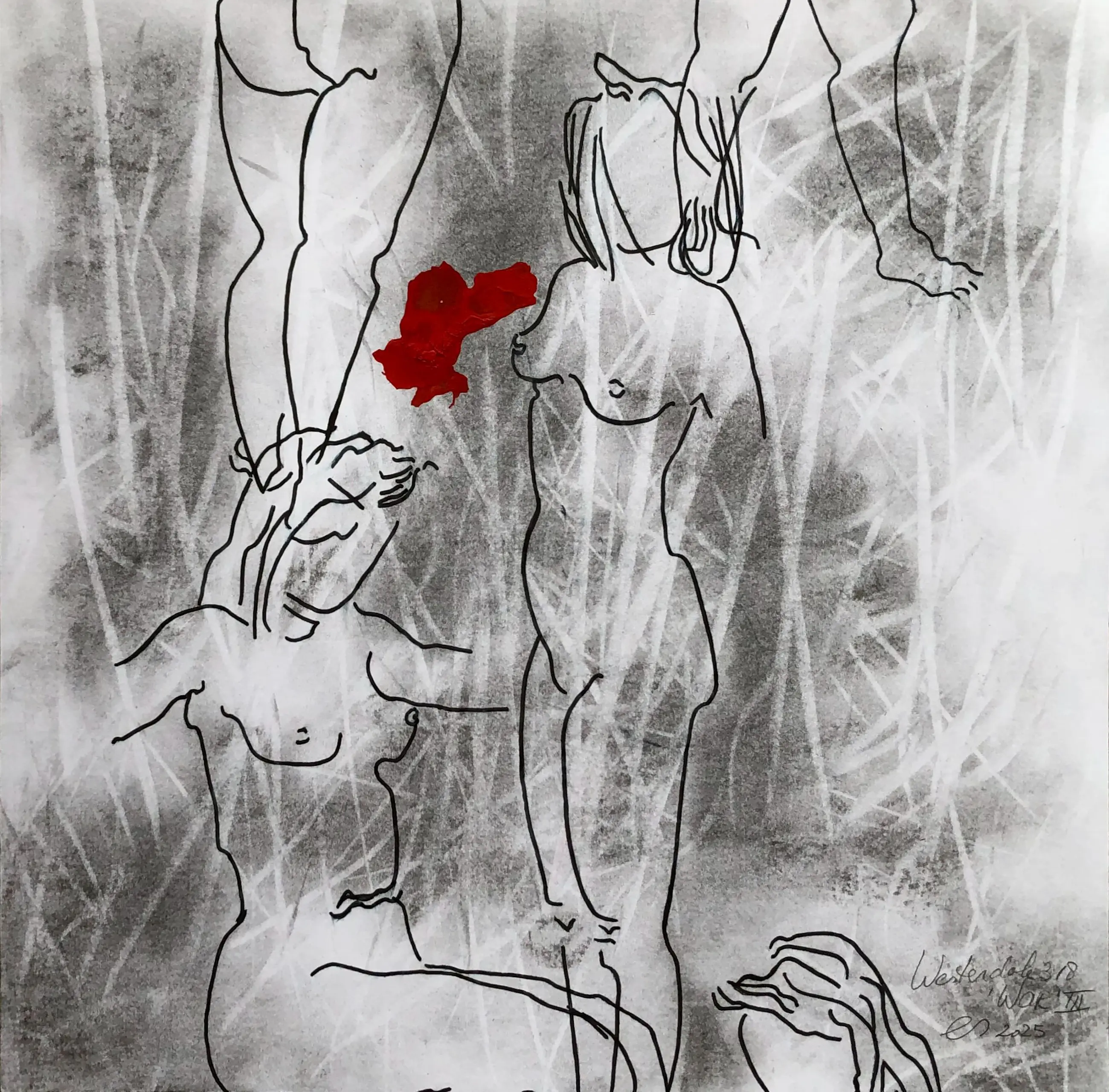 Westerdok 318 'War III' is onderdeel van de nieuwste serie van Maria Es, bestaande uit acht tekeningen die voortkomen uit haar werkperiode bij de Westerdok 318 Ateliers in Amsterdam (2017–2018). In deze serie krijgen getekende modellen een eigen stem en reageren zij op actuele maatschappelijke spanningen. De tekening Westerdok 318 'War III' verwijst expliciet naar de huidige dreiging en oorlogen wereldwijd. De figuren in het werk zijn niet alleen stille getuigen, maar ook actieve dragers van emotie en reflectie. Uitgevoerd in houtskool, fineliner en rode inkt op papier. Formaat: 35 x 35 cm. Gesigneerd. Uniek werk. Niet ingelijst.