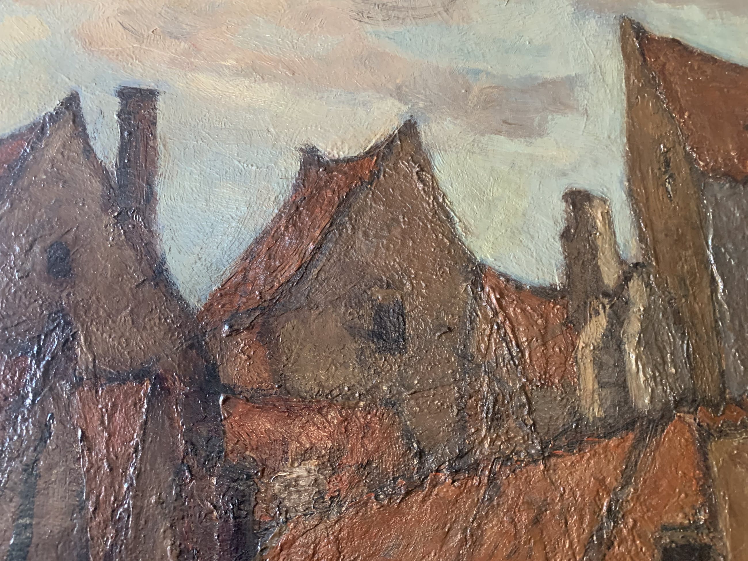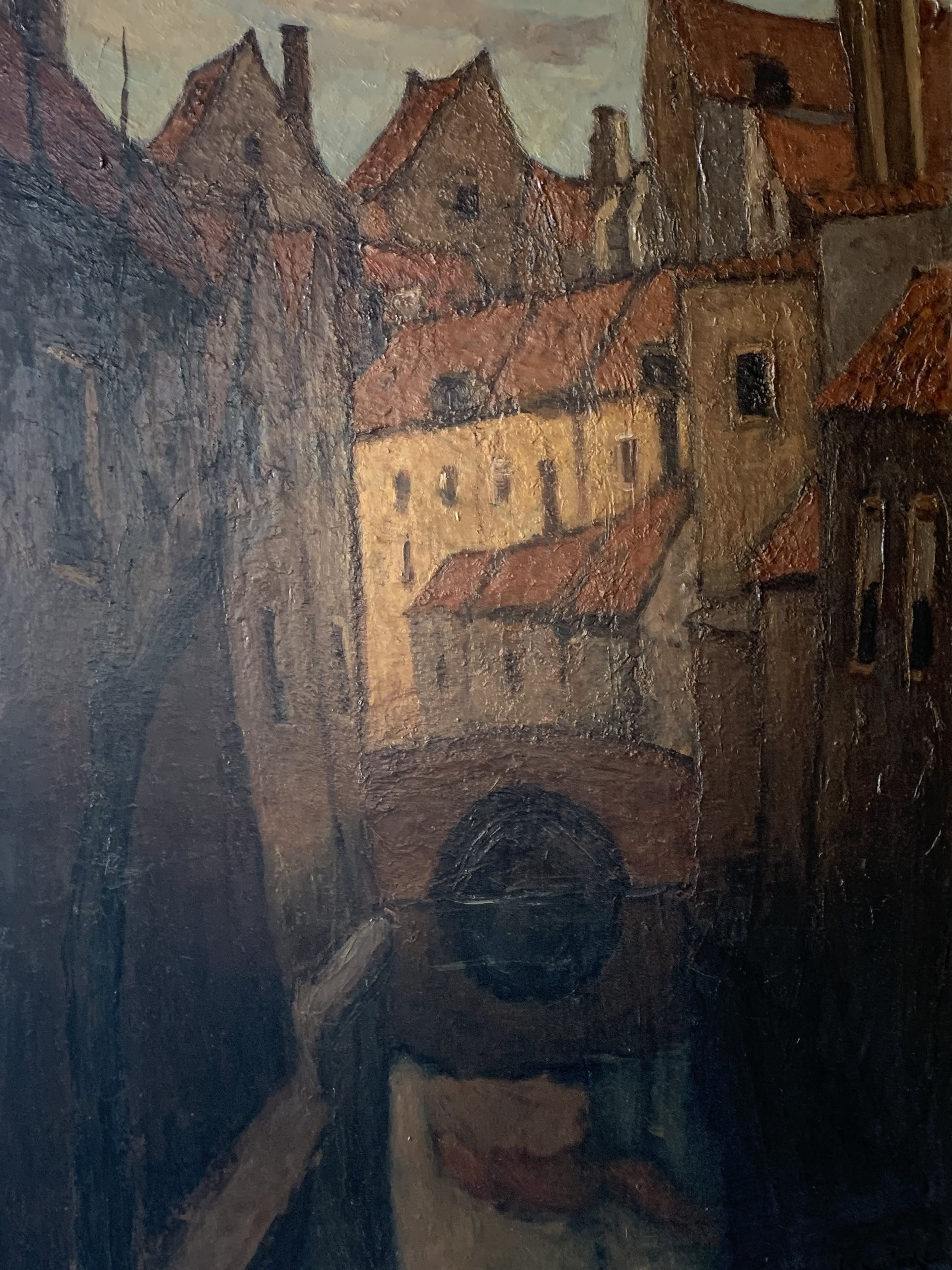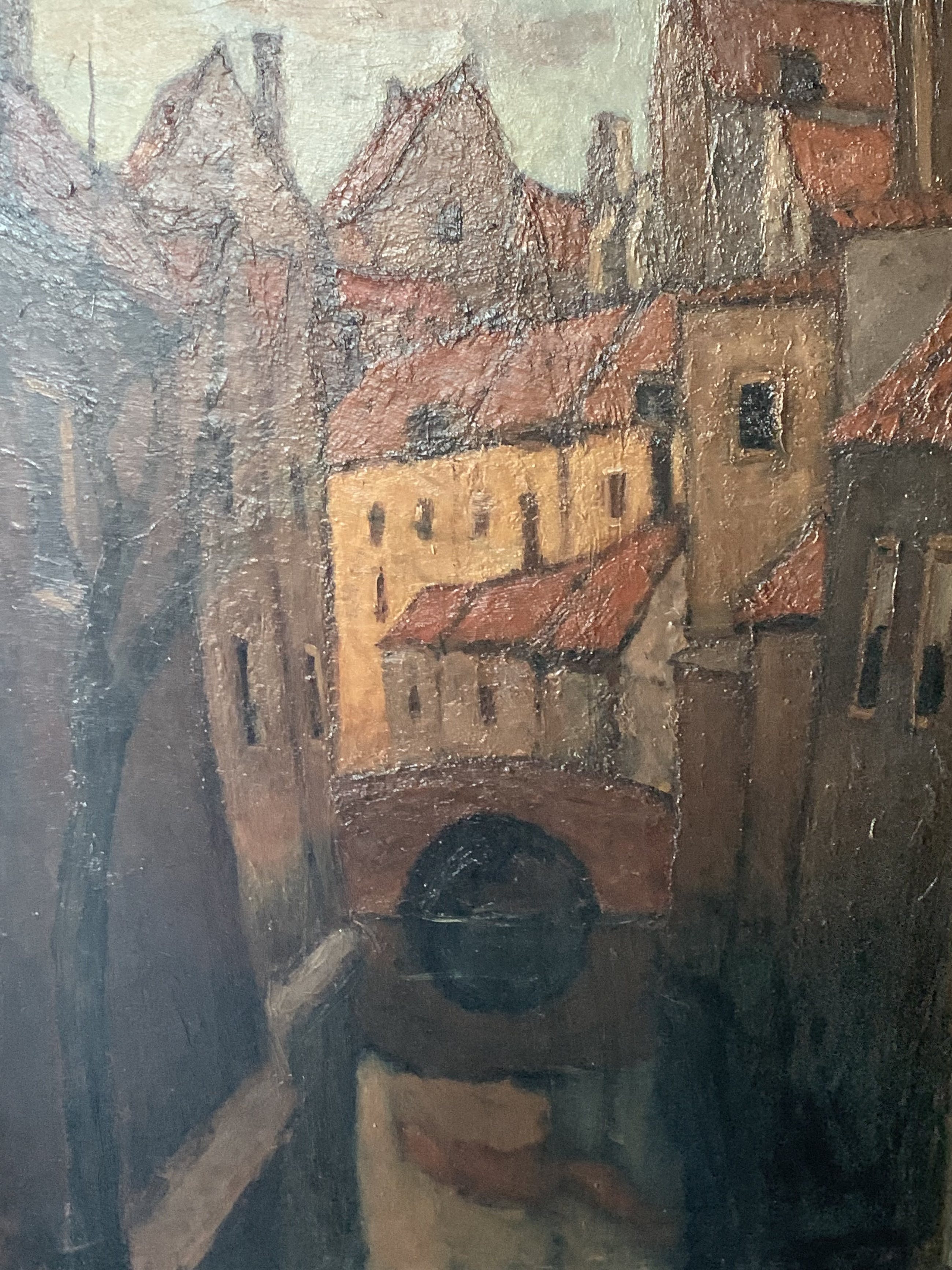 Een gracht met gezicht op de stad in het oude centrum van Brugge is ook het onderwerp van dit schilderij. Op de achterzijde staat geschreven ‘Brugge’ (zie foto’s).