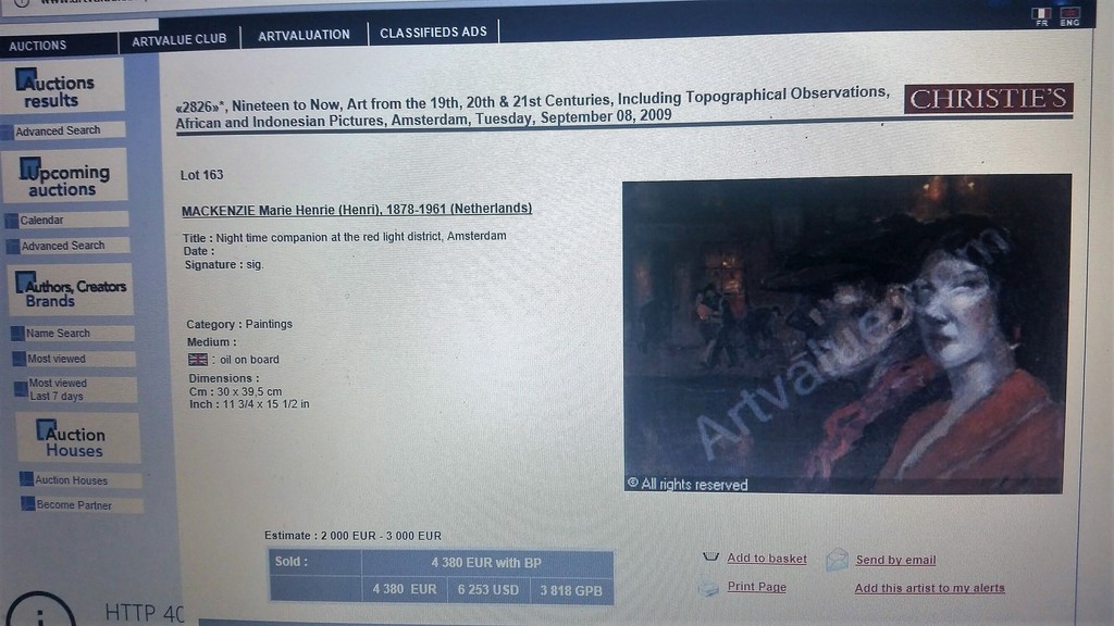 gesigneerd olieverfschilderij van de bekende schilder Marie Henrie Mackenzie. De voorstelling is: De walletjes in Amsterdam. De maten van het werk zijn 30 cm x 39,5 cm. Het schilderij zit in een galerielijst van Boselie. Het schilderij is in 2009 verkocht bij Christies voor een bedrag van 4380 euro ( zie foto 2 )