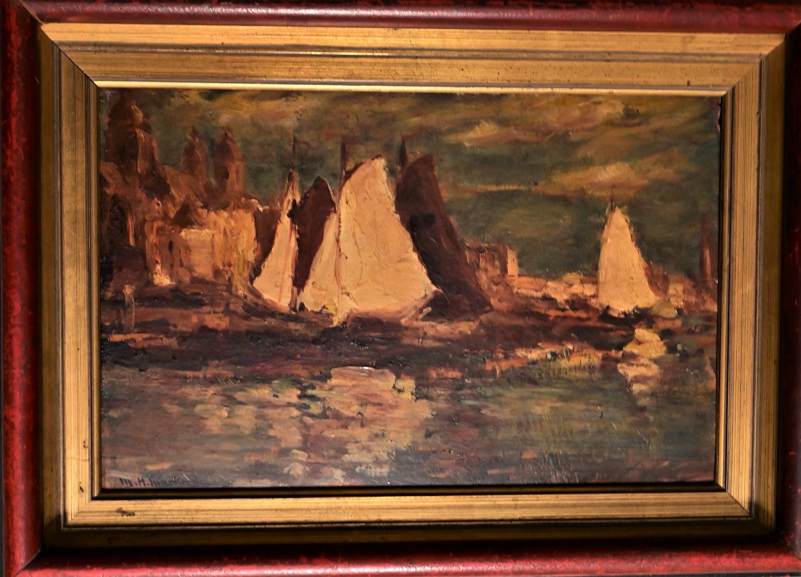H.M. Mackenzie 1868-1961, leerling van Breitner. Gesigneerd links onderaan. Zicht op de Nicolaaskerk en zeilschepen op het IJ te Amsterdam.
