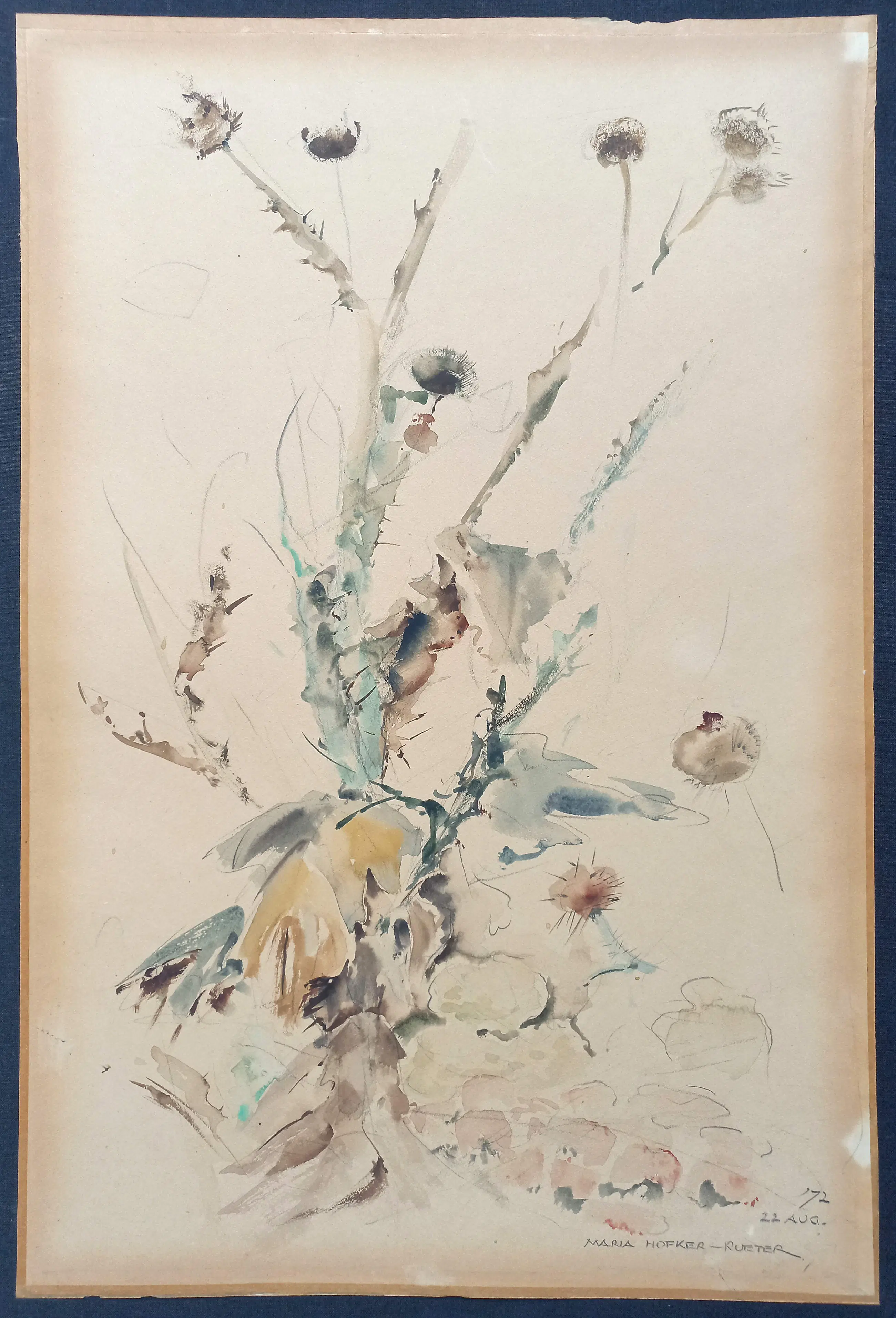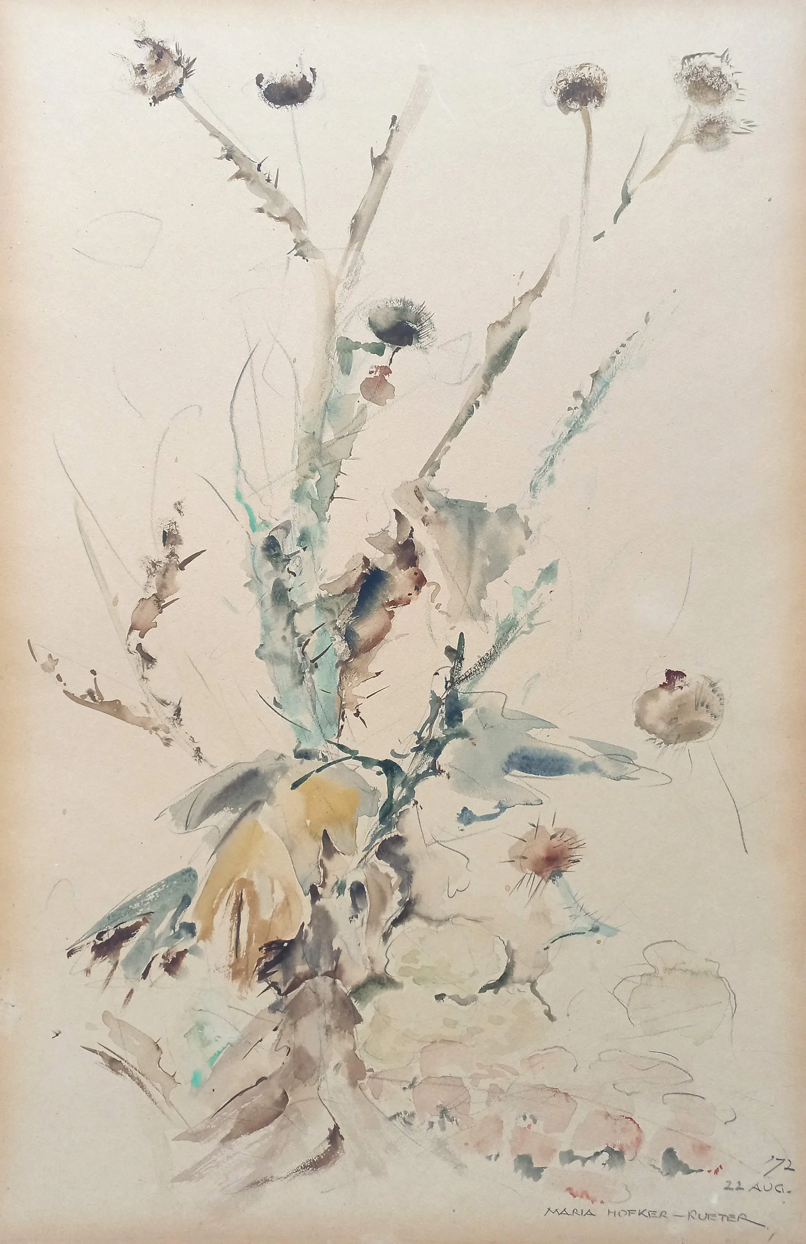 Distelachtige plant van Maria Hofker-Rueter. Aquarel op papier, gesigneerd en gedateerd rechtsonder (22 aug. ‘72). In redelijke conditie.