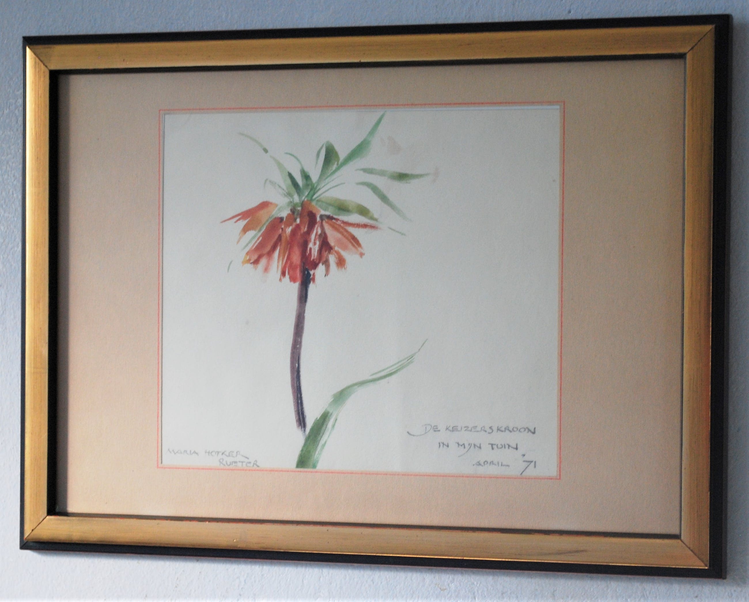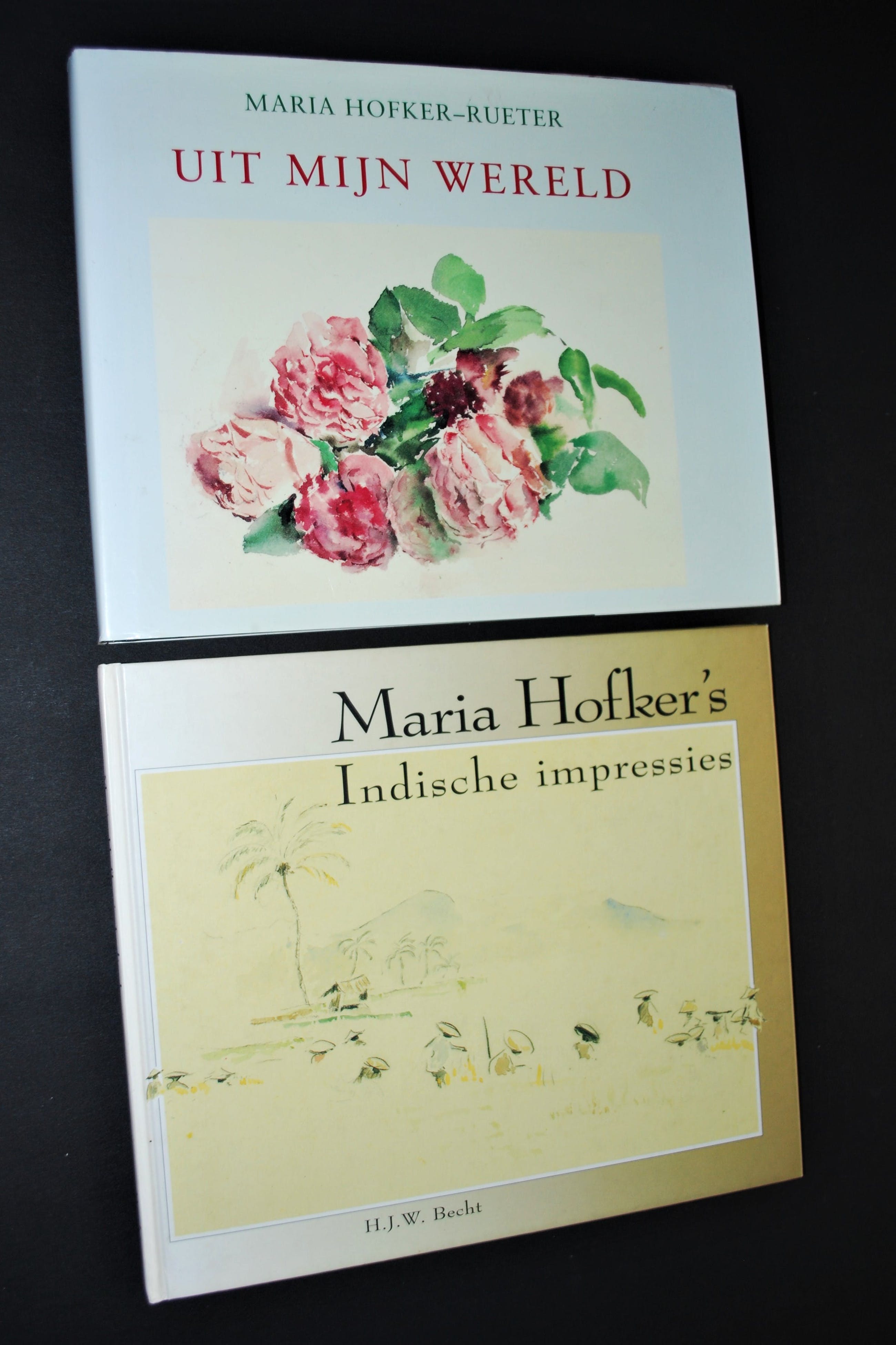Aquarel op papier, achter passepartout en glas, in een fraaie houten lijst. Daarbij het handgesigneerde 'Indische impressies' en 'uit mijn wereld', facsimile dagboek 1978, hardcover met omslag. Beide boeken in goede, gebruikte staat.