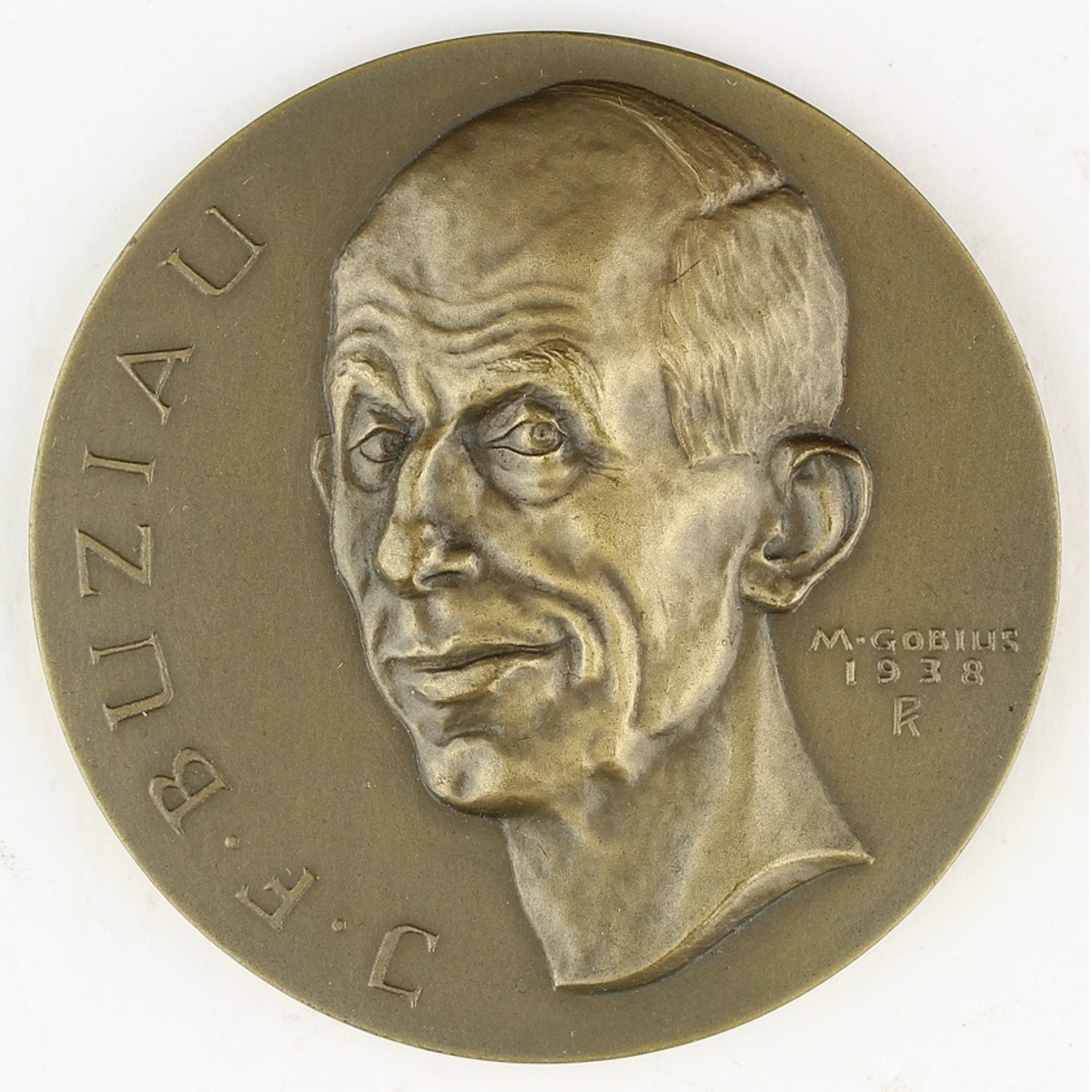 J.F. Buziau (1877-1958) had de bijnaam 'De koning van de lach'. Hij moet een onwaarschijnlijk komisch talent geweest zijn; de mensen in de zaal begonnen al te lachen nog voor hij op het toneel verschenen was. Hij is echter een moeilijk onderwerp voor een penning; want hoe iets van de atmosfeer over te brengen die juist zo wezenlijk voor de komiek was? Gobius, leerlinge van Dupuis en Bronner, had reeds een penning ontworpen met de beeltenis van Buziau; deze is de tweede, ter gelegenheid van Buziau's zestigste verjaardag. Een trois-quart portret van een man met een geplooid gezicht. De linker mondhoek is wat opgetrokken, duidend op ironie. De keerzijde geeft de komiek op een vlak, open fond in zijn volle verschijning ten voeten uit: gekleed in rokkostuum, het hoofd gedekt met een hoedje en leunend op een wandelstokje. Tussen twee toneelmaskers is te lezen: 'Dulce est desipere in loco'. Het is prettig nu en dan eens uitgelaten te zijn; of: Er is ook tijd voor dwaasheid. Niet een regel van Buziau maar van de Romeinse dichter Horatius. #Louk Tilanus, Handzame Sculptuur