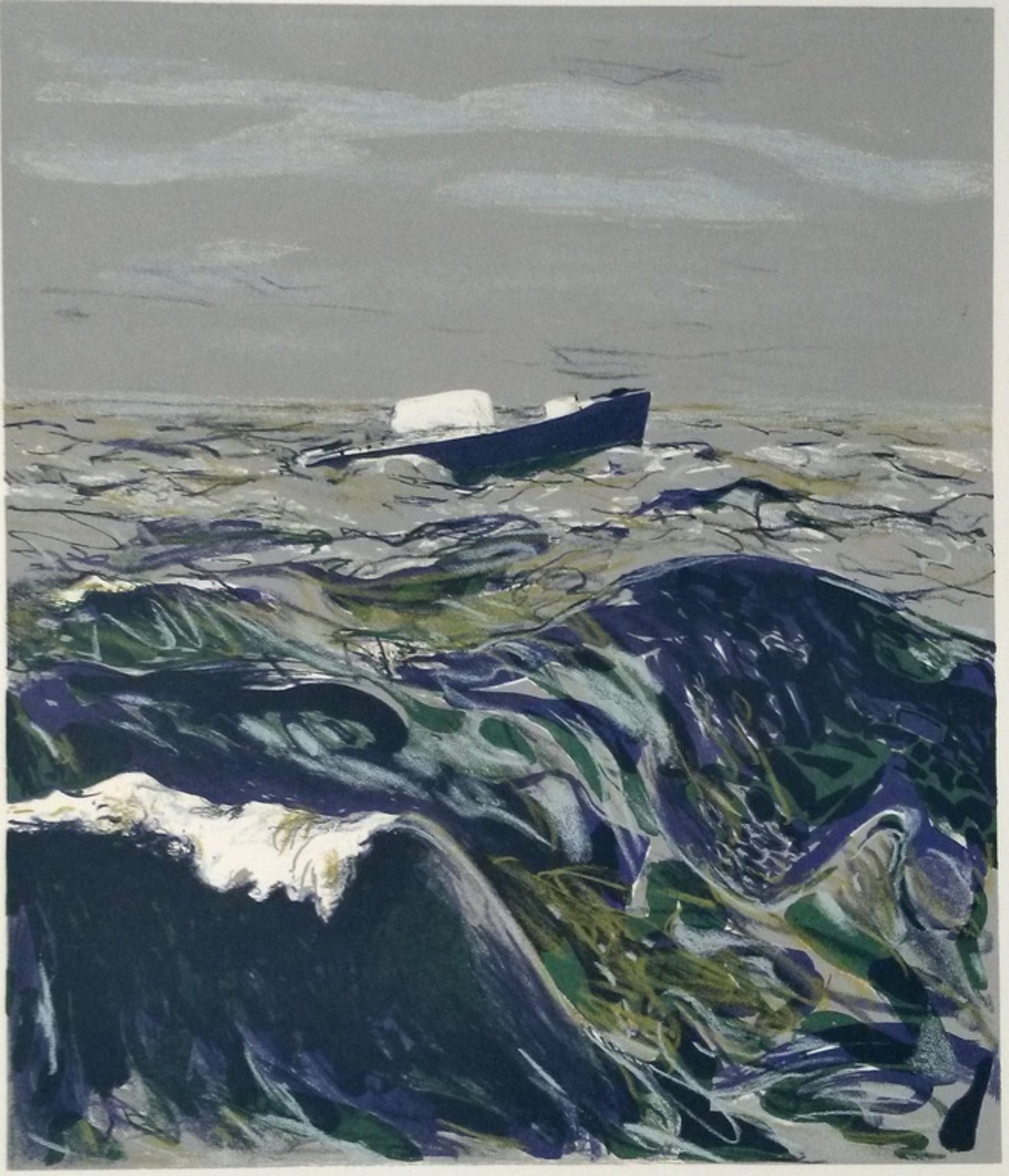 Zeefdruk van Marian Plug, getiteld 's Zondags: de zee. Het werk is een van de vier zeefdrukken die Marian Plug maakte in opdracht van Ahold, ter gelegenheid van het honderdjarig bestaan van dat bedrijf. In het boek dat bij die gelegenheid is uitgegeven onder de titel Het dagelijks leven, zijn deze afgebeeld.