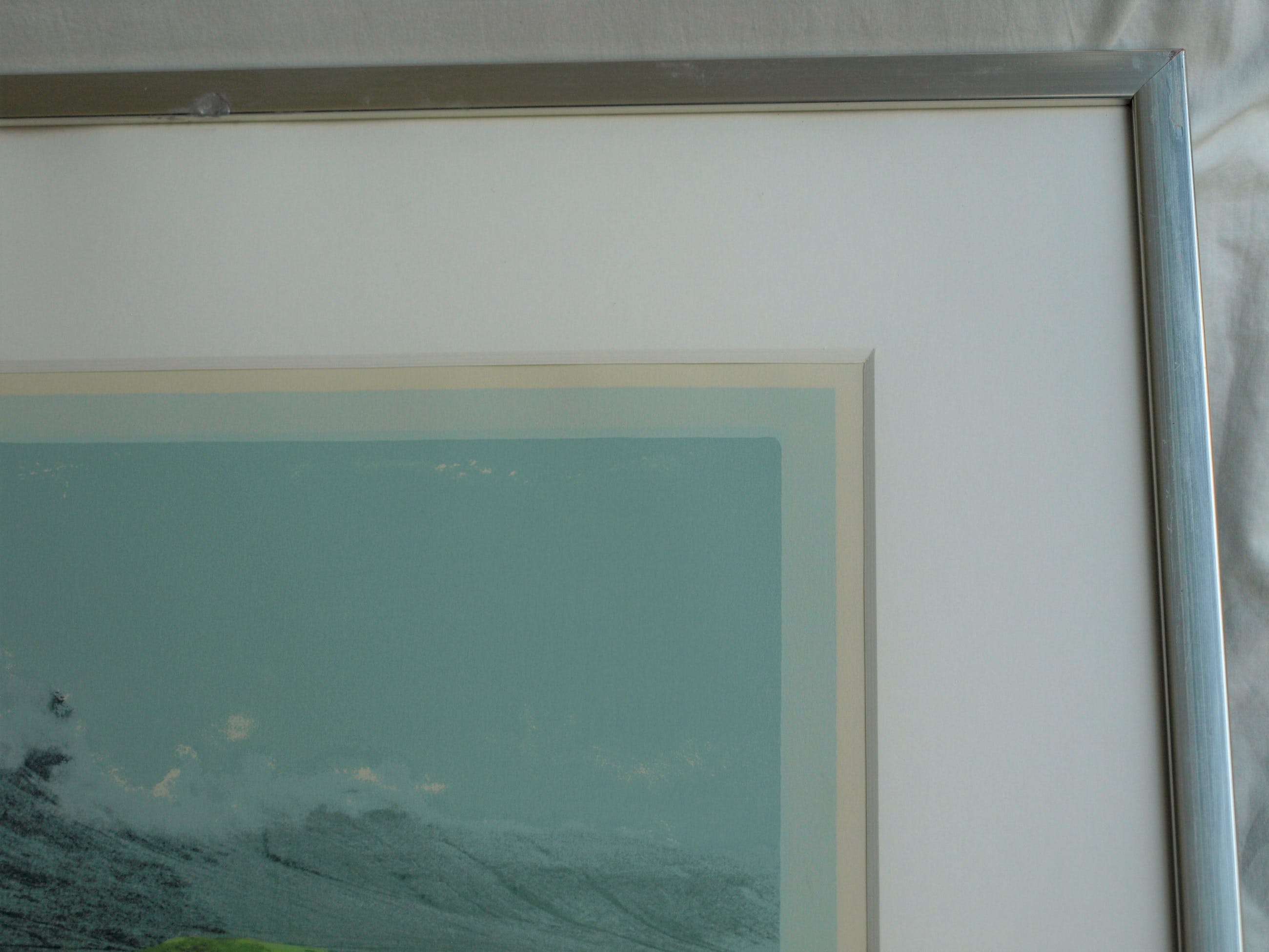 -Het werk is ingelijst in een zilverkleurige houten lijst met passe-partout en glasplaat.